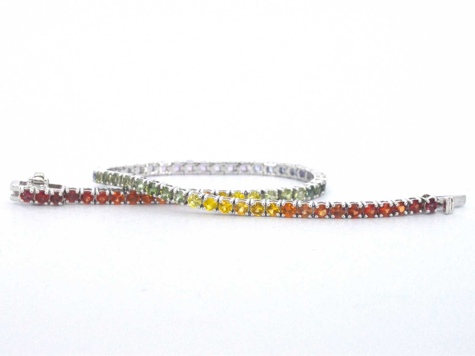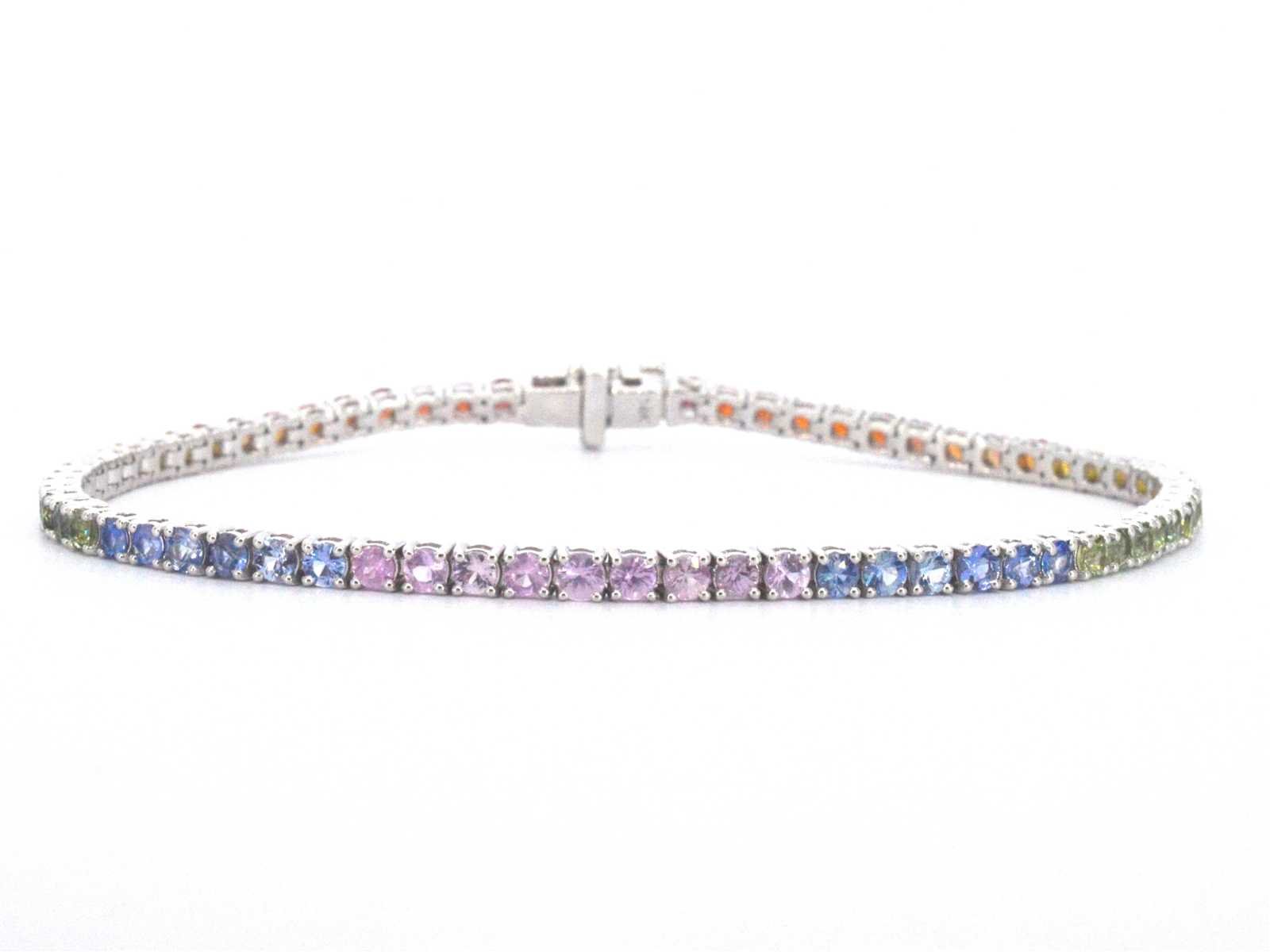Samenvatting van gegevens Gouden tennisarmband met multicolour saffieren Edelsteen: Saffieren; Aantal: 69 stuks; Slijpvorm: Rond geslepen; Gewicht (carat): 4.50 carat; Kleur: Multicolour; Zuiverheid: Met natuurlijke insluitsels; Juweel: Armband; Gewicht: 7 gram; Afmetingen/lengte: 18 cm; Materiaal: 14 karaat (585); Conditie: Nieuw; Verpakking: Luxe sieradendoos; Toelichting: De kwaliteit is overgenomen van het rapport behorend bij item. De waardebepaling is een beoordeling van een gecertificeerde diamantair, gebaseerd op consumentenprijzen.; Consumentenprijs: € 5.198,- Within 14 days Edelsteen: Saffieren Kleur edelsteen: Multicolour Slijpvorm edelsteen: Rond geslepen Zuiverheidsgraad edelsteen: Met natuurlijke insluitsels Totaal gewicht: 7g Keurmerk: 585
