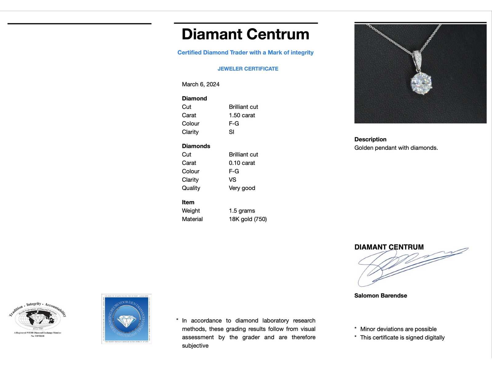Samenvatting van gegevens Witgouden solitair hanger met een diamant van 1.50 carat, Excl. ketting Diamant: Natuurlijk; Aantal: 1 stuk; Slijpvorm: Briljant geslepen; Gewicht (carat): 1.50 carat; Kleur: F-G; Zuiverheid: SI; Slijpkwaliteit: zeer mooi; Diamant (secundair): Diamanten; Aantal diamanten: 5 stuks; Slijpvorm: Briljant geslepen; Gewicht (carat): 0.10 carat; Kleur: F-G; Zuiverheid: VS; Slijpkwaliteit: Zeer mooi; Juweel: Hanger (excl. ketting); Gewicht: 1.5 gram; Afmetingen/lengte: 1.6 x 0.8 cm; Materiaal: 18k goud (750); Conditie: Nieuw; Verpakking: Luxe sieradendoos; Toelichting: De kwaliteit is overgenomen van het rapport behorend bij item. De waardebepaling is een beoordeling van een gecertificeerde diamantair, gebaseerd op consumentenprijzen.; Consumentenprijs: € 17.500,- Within 14 days Materiaal: Goud Voornaamste diamant: Natuurlijk Kleur diamant: F-G Gewicht diamant: 1.50ct Slijpvorm diamant: Briljant geslepen Slijpkwaliteit diamant: zeer mooi Zuiverheidsgraad diamant: SI Totaal gewicht: 1.5g Keurmerk: 750