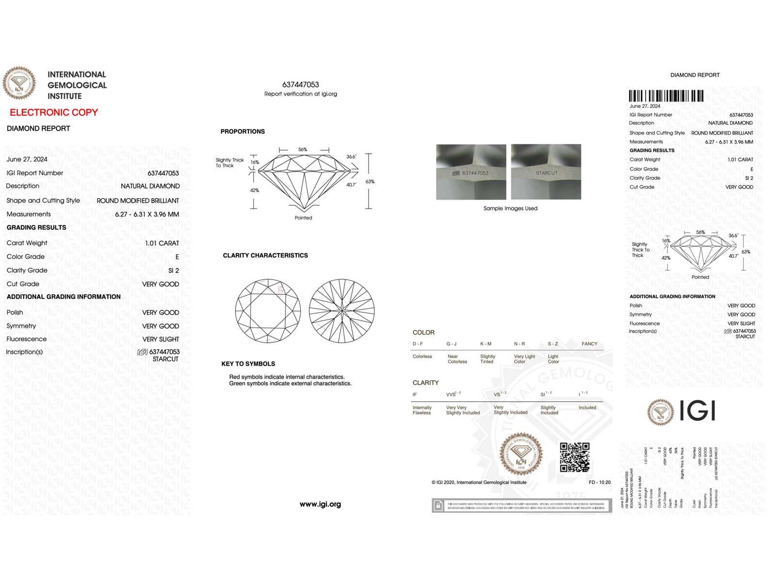 Samenvatting van gegevens Diamant - 1.01 carat echte natuurlijke Starcut briljant geslepen diamant (gecertificeerd) Diamant: Natuurlijk; Aantal: 1 stuk; Slijpvorm: Starcut; Gewicht (carat): 1.01 carat; Kleur: E; Zuiverheid: SI2; Certificaat: IGI; Certificaat nummer: 637447053; Extra informatie: Deze diamant is een echte Starcut diamant; Merk: Starcut; Conditie: Nieuw; Verpakking: Edelsteendoos; Toelichting: De kwaliteit is overgenomen van het rapport behorend bij item. De waardebepaling is een beoordeling van een gecertificeerde diamantair, gebaseerd op consumentenprijzen.; Extra informatie: Met laser inscriptie in diamant; Consumentenprijs: € 18.000,- Within 14 days Voornaamste diamant: Natuurlijk Kleur diamant: E Gewicht diamant: 1.01ct Slijpvorm diamant: Starcut Zuiverheidsgraad diamant: SI2 Certificaat: IGI