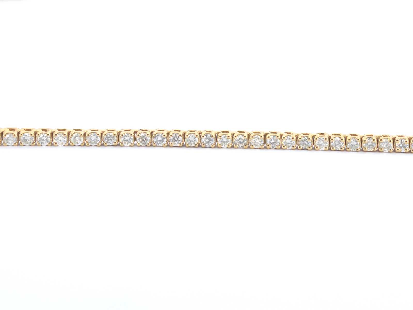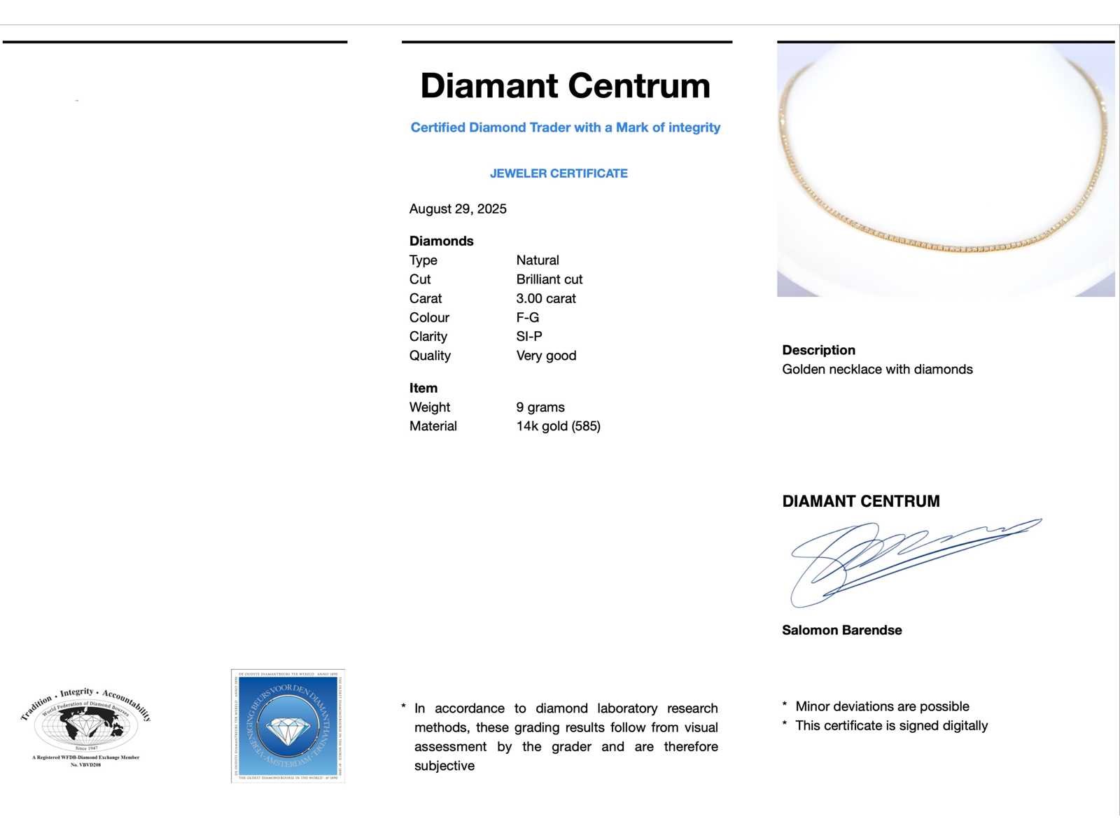 Samenvatting van gegevens Gouden tenniscollier met diamanten 3.00 carat Diamant: Natuurlijk; Slijpvorm: Briljant geslepen; Gewicht (carat): 3.00 carat; Kleur: F-G; Zuiverheid: SI-P; Slijpkwaliteit: Zeer mooi; Juweel: Halsketting; Gewicht: 9 gram; Afmetingen/lengte: 43.5 cm; Materiaal: 14 karaat (585); Conditie: Nieuw; Verpakking: Luxe sieradendoos; Toelichting: De kwaliteit is overgenomen van het rapport behorend bij item. De waardebepaling is een beoordeling van een gecertificeerde diamantair, gebaseerd op consumentenprijzen.; Consumentenprijs: € 11.600,- Within 14 days Voornaamste diamant: Natuurlijk Kleur diamant: F-G Gewicht diamant: 3.00ct Slijpvorm diamant: Briljant geslepen Slijpkwaliteit diamant: Zeer mooi Zuiverheidsgraad diamant: SI-P Totaal gewicht: 9g Keurmerk: 585