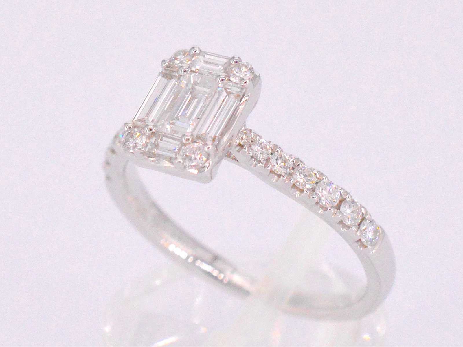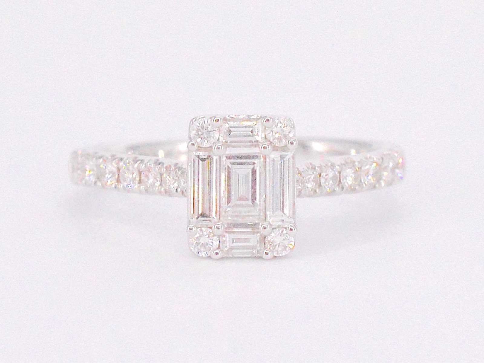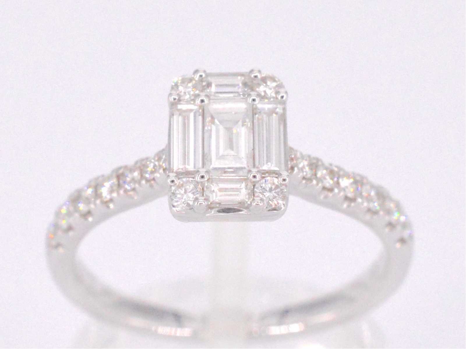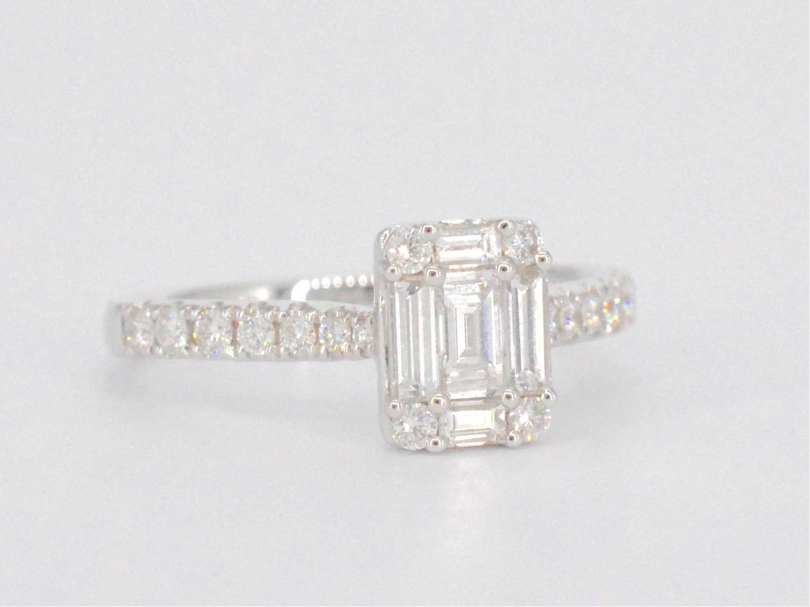 Samenvatting van gegevens Entourage ring met baguette en Briljant geslepen diamanten Diamant: Natuurlijk; Slijpvorm: Briljant en baguette geslepen; Gewicht (carat): 0.90 carat; Kleur: F-G; Zuiverheid: VS; Slijpkwaliteit: Zeer mooi; Juweel: Ring; Gewicht: 2.7 gram; Ringmaat (op maat gemaakt*): 53 (17 mm); Materiaal: 18K goud (750); Conditie: Nieuw; Verpakking: Luxe sieradendoos; Toelichting: De kwaliteit is overgenomen van het rapport behorend bij item. De waardebepaling is een beoordeling van een gecertificeerde diamantair, gebaseerd op consumentenprijzen.; Consumentenprijs: € 7.403,- Within 14 days Materiaal: Goud Voornaamste diamant: Natuurlijk Gewicht diamant: 0.90ct Totaal gewicht: 2.7g Keurmerk: 750 Kleur diamant: F-G Slijpvorm diamant: Briljant en baguette geslepen Slijpkwaliteit diamant: Zeer mooi Zuiverheidsgraad diamant: VS