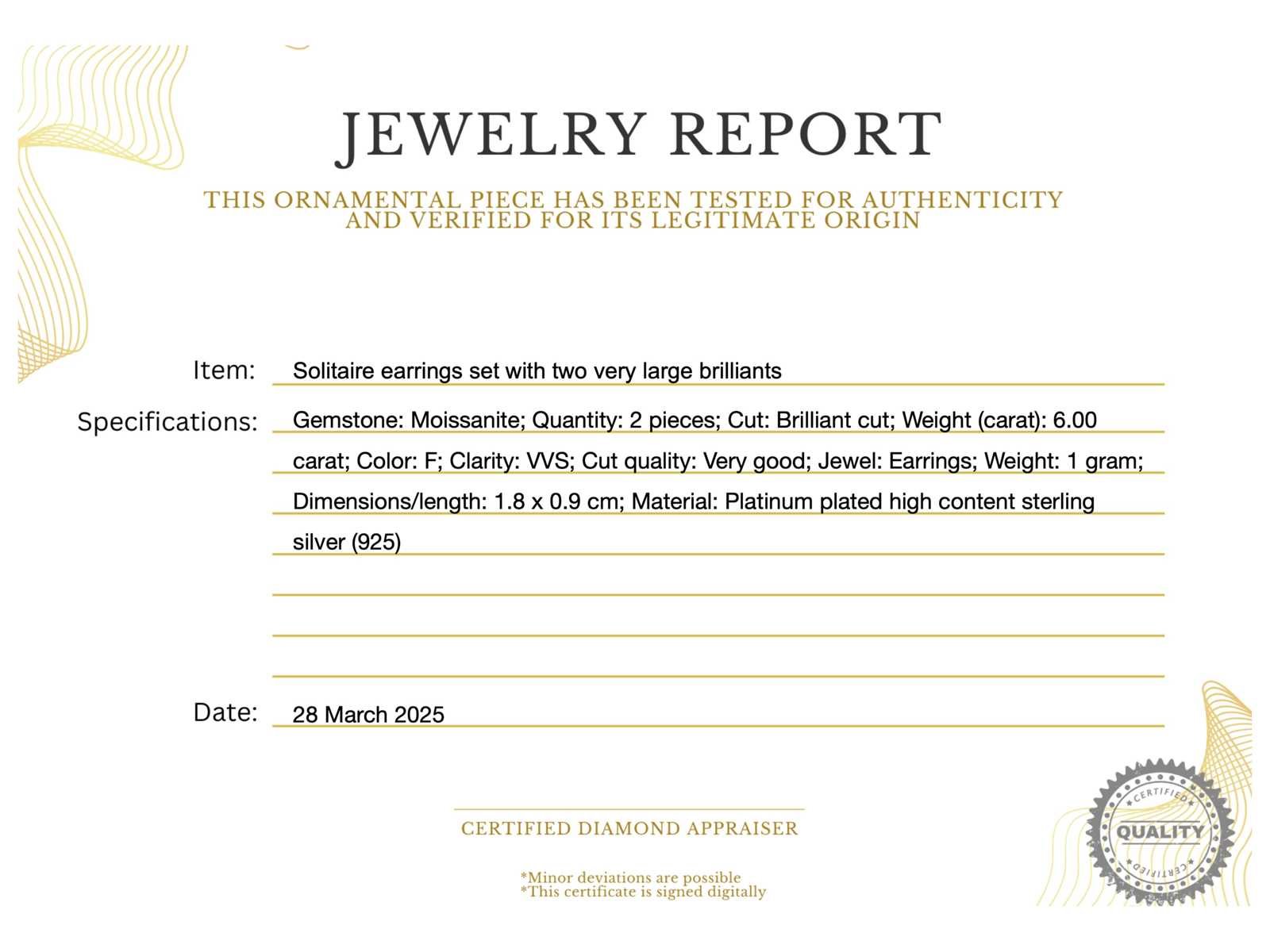 Samenvatting van gegevens Solitair oorbellen gezet met twee zeer grote briljanten Edelsteen: Moissaniet; Aantal: 2 stuks; Slijpvorm: Briljant geslepen; Gewicht (carat): 6.00 carat; Kleur: F; Zuiverheid: VVS; Slijpkwaliteit: Zeer mooi; Juweel: Oorbellen; Merk: Harmony; Gewicht: 1 gram; Afmetingen/lengte: 1.8 x 0.9 cm; Materiaal: Geplatineerd hoog gehalte sterling zilver (925); Conditie: Nieuw; Verpakking: Sieradendoos of fluwelen etui; Toelichting: De kwaliteit is overgenomen van het rapport behorend bij item. De waardebepaling is een beoordeling van een gecertificeerde diamantair, gebaseerd op consumentenprijzen..; Extra informatie: Het gemeten gewicht van de edelstenen is volgens diamant maten; Consumentenprijs: € 2.400,- Within 14 days Materiaal: Zilver Edelsteen: Moissaniet Kleur edelsteen: F Slijpvorm edelsteen: Briljant geslepen Slijpkwaliteit edelsteen: Zeer mooi Zuiverheidsgraad edelsteen: VVS Totaal gewicht: 1g Keurmerk: 925