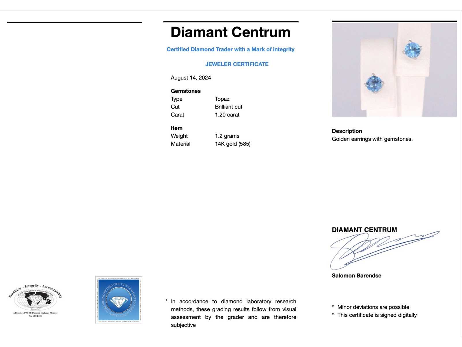 Samenvatting van gegevens Witgouden oorbellen met topaas Edelsteen: Topaas; Slijpvorm: Briljant geslepen; Gewicht (carat): 1.20 carat; Juweel: Oorbellen; Gewicht: 1.2 gram; Materiaal: 14 karaat (585); Conditie: Nieuw; Verpakking: Luxe sieradendoos; Toelichting: De kwaliteit is overgenomen van het rapport behorend bij item. De waardebepaling is een beoordeling van een gecertificeerde diamantair, gebaseerd op consumentenprijzen.; Consumentenprijs: € 770,- Within 14 days Edelsteen: Topaas Slijpvorm edelsteen: Briljant geslepen Totaal gewicht: 1.2g Keurmerk: 585