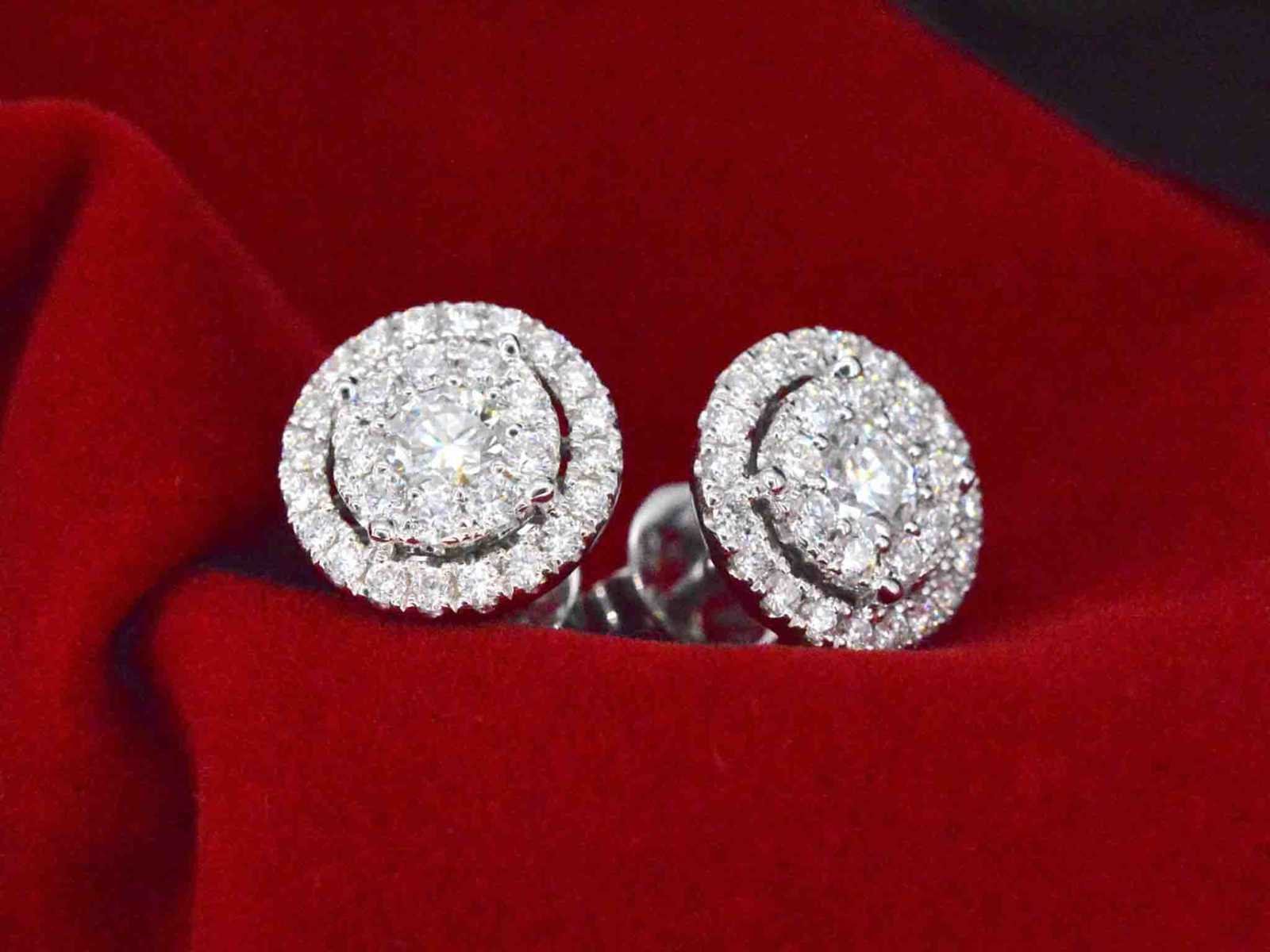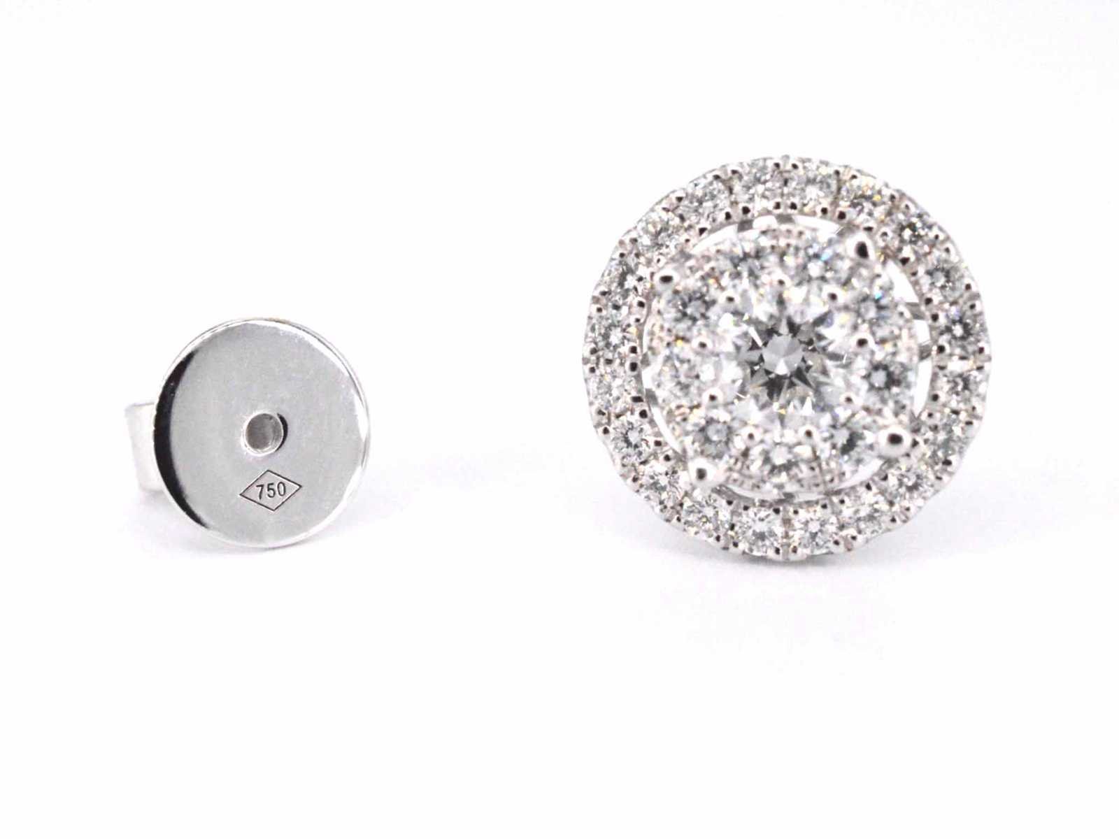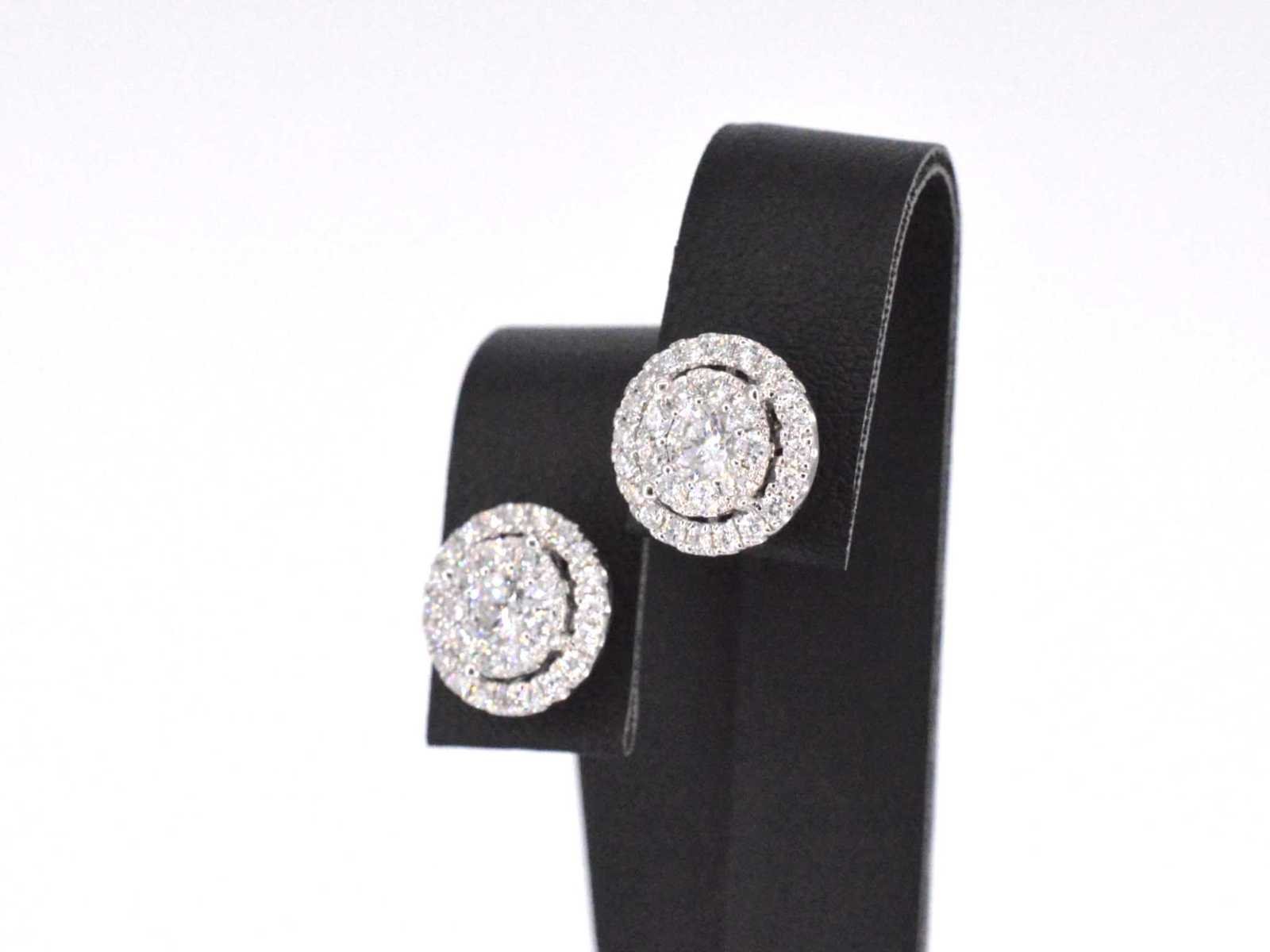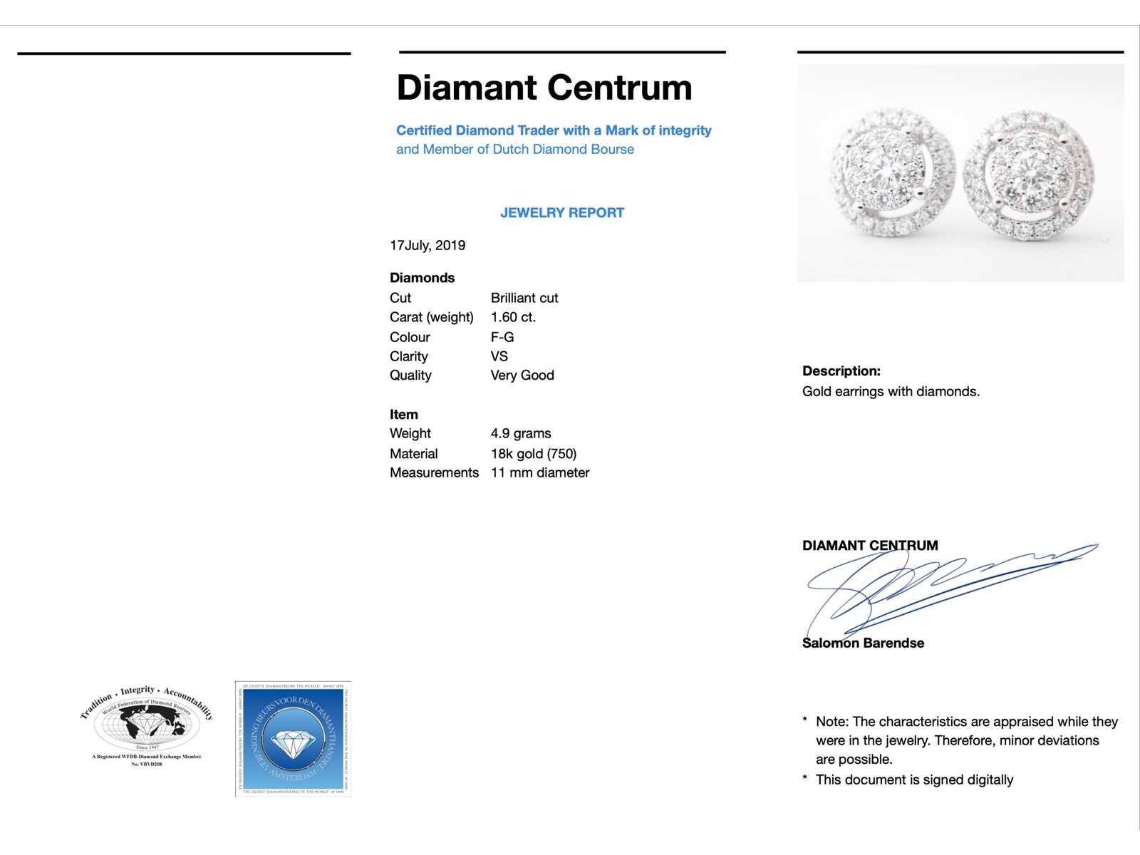 Samenvatting van gegevens Witgouden entourage oorbellen gezet met 60 briljant geslepen diamanten Diamant: Natuurlijk; Slijpvorm: Briljant geslepen; Gewicht (carat): 1.60 carat; Kleur: F-G; Zuiverheid: VS; Slijpkwaliteit: Zeer mooi; Juweel: Oorbellen; Gewicht: 4.9 gram; Afmetingen/lengte: Diameter: 11 mm; Materiaal: 18K goud (750); Conditie: Nieuw; Verpakking: Luxe sieradendoos; Toelichting: De kwaliteit is overgenomen van het rapport behorend bij item. De waardebepaling is een beoordeling van een gecertificeerde diamantair, gebaseerd op consumentenprijzen.; Consumentenprijs: € 11.078,- Within 14 days Materiaal: Goud Voornaamste diamant: Natuurlijk Kleur diamant: F-G Gewicht diamant: 1.60ct Slijpvorm diamant: Briljant geslepen Slijpkwaliteit diamant: Zeer mooi Zuiverheidsgraad diamant: VS Totaal gewicht: 4.9g Keurmerk: 750