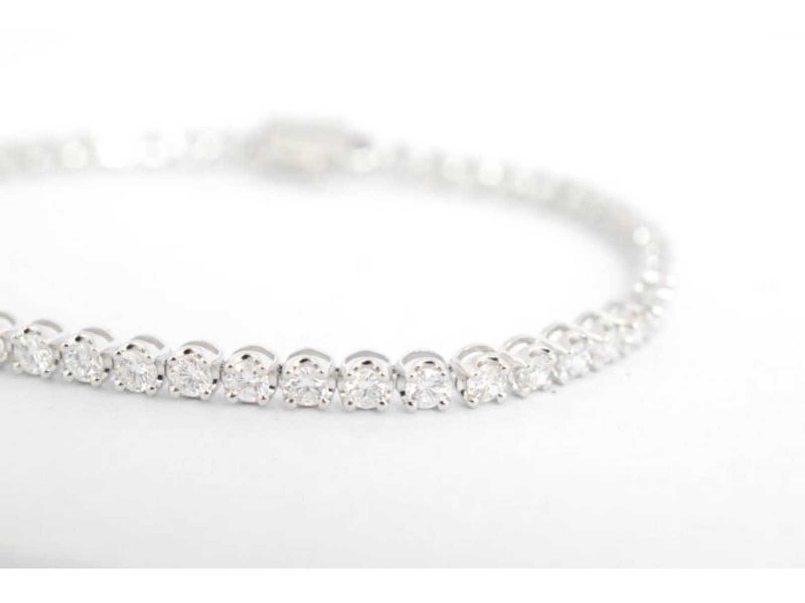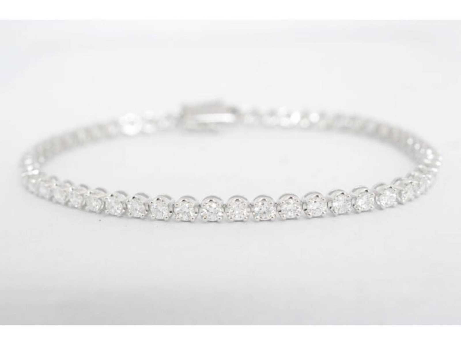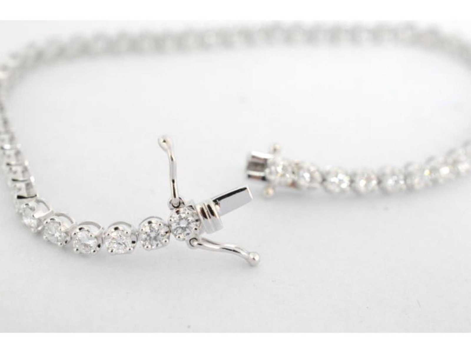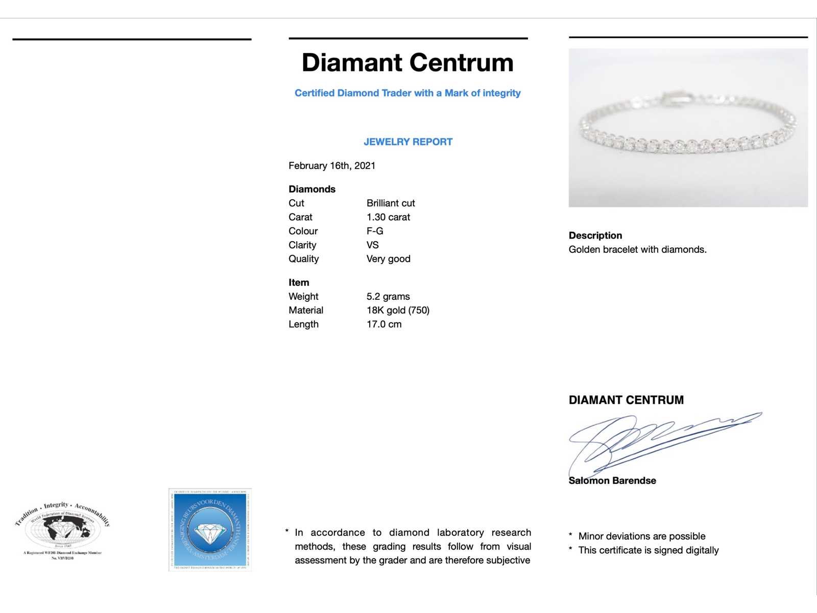 Samenvatting van gegevens Tennisarmband met 1.30 carat diamanten Diamant: Natuurlijk; Slijpvorm: Briljant geslepen; Gewicht (carat): 1.30 carat; Kleur: F-G; Zuiverheid: VS; Slijpkwaliteit: Zeer mooi; Juweel: Armband; Gewicht: 5.2 gram; Afmetingen/lengte: 17 cm; Materiaal: 18K goud (750); Conditie: Nieuw; Verpakking: Luxe sieradendoos; Toelichting: De kwaliteit is overgenomen van het rapport behorend bij item. De waardebepaling is een beoordeling van een gecertificeerde diamantair, gebaseerd op consumentenprijzen.; Consumentenprijs: € 8.978,- Within 14 days Materiaal: Goud Voornaamste diamant: Natuurlijk Kleur diamant: F-G Gewicht diamant: 1.30ct Slijpvorm diamant: Briljant geslepen Slijpkwaliteit diamant: Zeer mooi Zuiverheidsgraad diamant: VS Totaal gewicht: 5.2g Keurmerk: 750