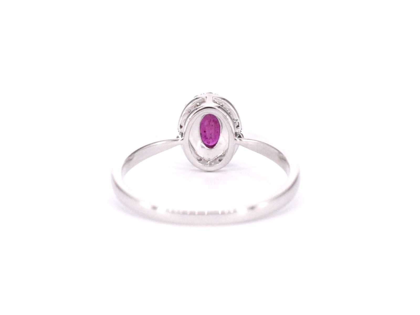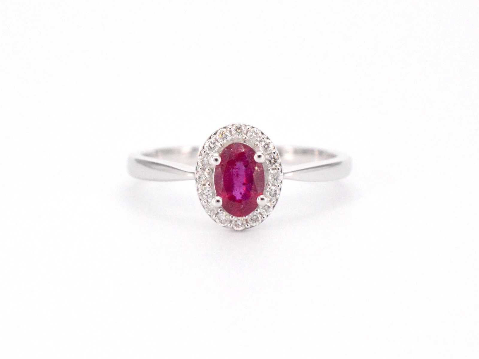 Samenvatting van gegevens Witgouden entourage ring met diamanten en robijn Diamant: Natuurlijk; Slijpvorm: Rond geslepen; Gewicht (carat): 0.12 carat; Kleur: F-G; Zuiverheid: SI; Slijpkwaliteit: Zeer mooi; Edelsteen: Robijn; Slijpvorm: Ovaal; Gewicht (carat): 0.70 carat; Kleur: rood; Juweel: Ring; Gewicht: 2.2 gram; Ringmaat (op maat gemaakt*): 54 (17.25 mm); Materiaal: 14k goud (585); Conditie: Nieuw; Verpakking: Luxe sieradendoos; Toelichting: De kwaliteit is overgenomen van het rapport behorend bij item. De waardebepaling is een beoordeling van een gecertificeerde diamantair, gebaseerd op consumentenprijzen.; Consumentenprijs: € 1.348,- Within 14 days Materiaal: Goud Voornaamste diamant: Natuurlijk Gewicht diamant: 0.12ct Edelsteen: Robijn Totaal gewicht: 2.2g Keurmerk: 585 Kleur diamant: F-G Slijpvorm diamant: Rond geslepen Slijpkwaliteit diamant: Zeer mooi Zuiverheidsgraad diamant: SI Kleur edelsteen: rood Slijpvorm edelsteen: Ovaal