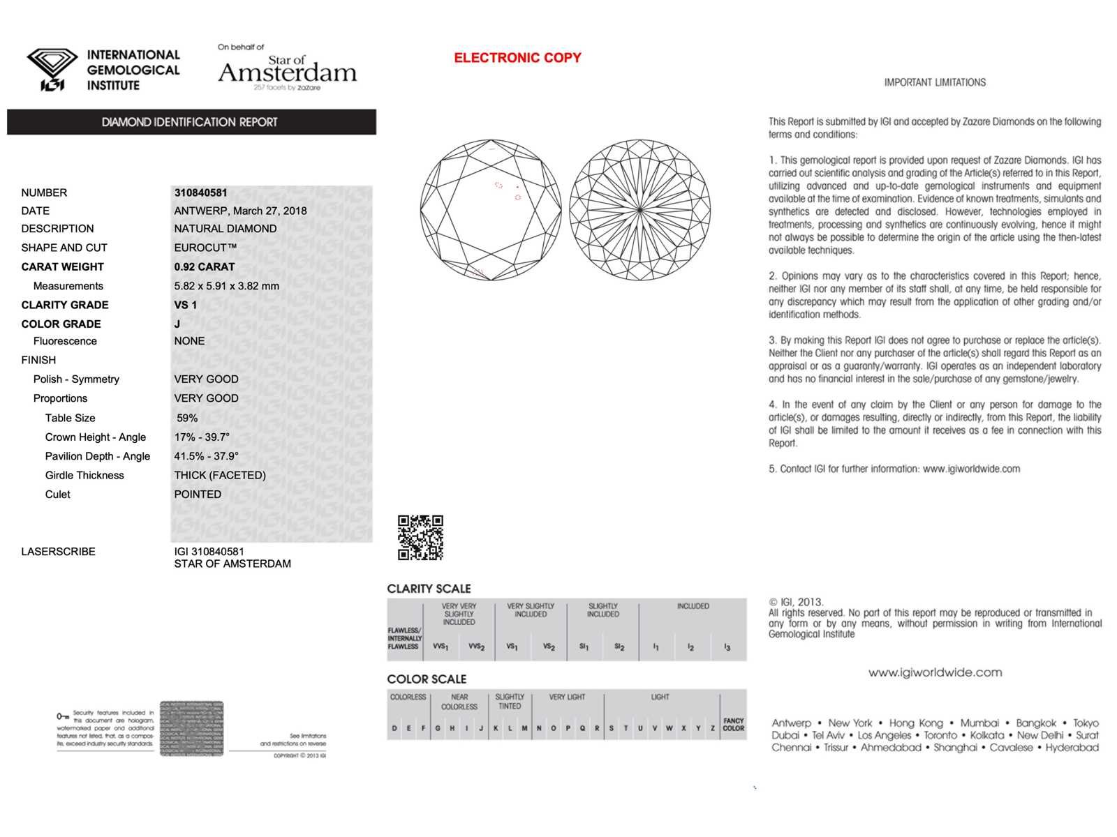 Samenvatting van gegevens Diamant - 0.92 carat echte natuurlijke "Star of Amsterdam" diamant (gecertificeerd) Diamant: Natuurlijk; Aantal: 1 stuk; Slijpvorm: Euro cut; Gewicht (carat): 0.92 carat; Kleur: J; Zuiverheid: VS1; Certificaat: IGI; Certificaat nummer: 310840581; Merk: 257 facetten 'Star of Amsterdam'; Conditie: Nieuw; Verpakking: Edelsteendoos; Toelichting: De kwaliteit is overgenomen van het rapport behorend bij item. De waardebepaling is een beoordeling van een gecertificeerde diamantair, gebaseerd op consumentenprijzen.; Consumentenprijs: € 12.000,- Within 14 days Voornaamste diamant: Natuurlijk Kleur diamant: J Gewicht diamant: 0.92ct Slijpvorm diamant: Euro cut Zuiverheidsgraad diamant: VS1 Certificaat: IGI
