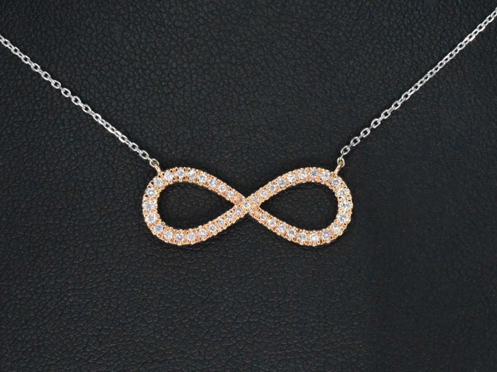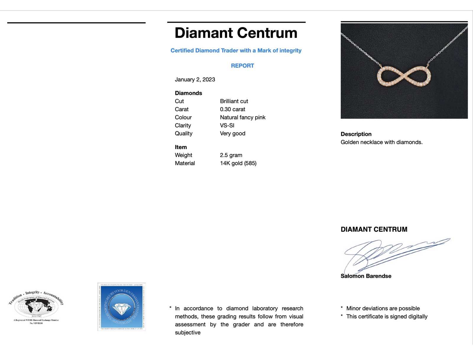 Samenvatting van gegevens Witgouden collier met een rosegouden diamanten infinity hanger Diamant: Natuurlijk; Aantal: 41 stuks; Slijpvorm: Briljant geslepen; Gewicht (carat): 0.30 carat; Kleur: Natuurlijke fancy roze; Zuiverheid: VS-SI; Slijpkwaliteit: Zeer mooi; Juweel: Hanger (incl. Ketting); Gewicht: 2.5 gram; Afmetingen/lengte: 42 - 47.5 cm (verstelbaar); Materiaal: 14 karaat (585); Conditie: Nieuw; Verpakking: Luxe sieradendoos; Toelichting: De kwaliteit is overgenomen van het rapport behorend bij item. De waardebepaling is een beoordeling van een gecertificeerde diamantair, gebaseerd op consumentenprijzen.; Consumentenprijs: € 2.643,- Within 14 days Voornaamste diamant: Natuurlijk Kleur diamant: Natuurlijke fancy roze Gewicht diamant: 0.30ct Slijpvorm diamant: Briljant geslepen Slijpkwaliteit diamant: Zeer mooi Zuiverheidsgraad diamant: VS-SI Totaal gewicht: 2.5g Keurmerk: 585