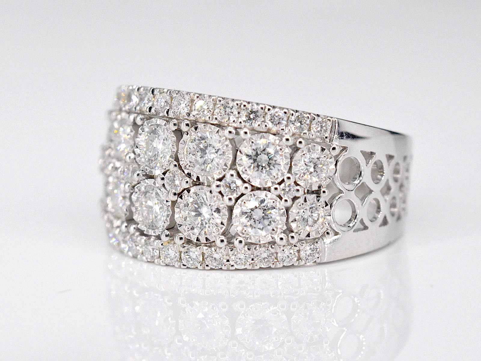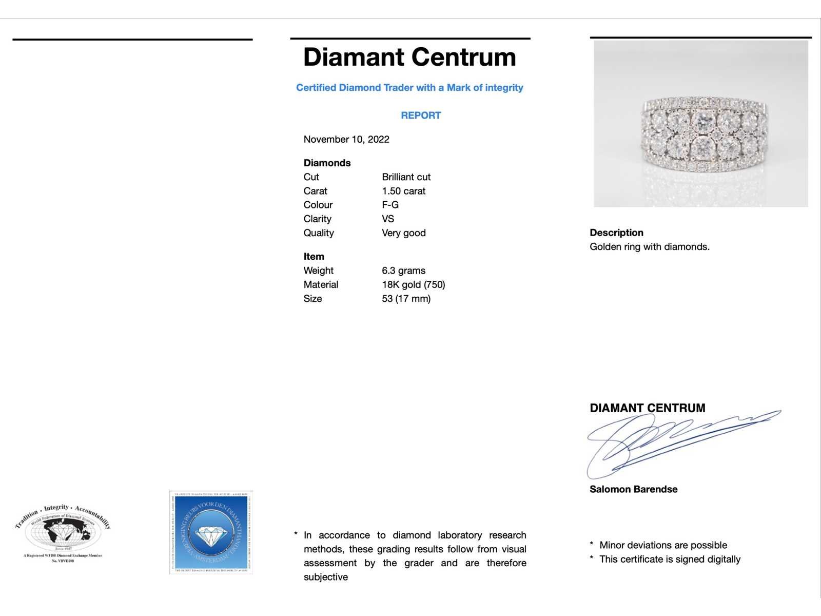 Samenvatting van gegevens Witgouden pavering met diamanten Diamant: Natuurlijk; Slijpvorm: Briljant geslepen; Gewicht (carat): 1.50 carat; Kleur: F-G; Zuiverheid: VS; Slijpkwaliteit: Zeer mooi; Juweel: Ring; Gewicht: 6.3 gram; Ringmaat (op maat gemaakt*): 53 (17 mm); Materiaal: 18K goud (750); Conditie: Nieuw; Verpakking: Luxe sieradendoos; Toelichting: De kwaliteit is overgenomen van het rapport behorend bij item. De waardebepaling is een beoordeling van een gecertificeerde diamantair, gebaseerd op consumentenprijzen.; Consumentenprijs: € 10.203,- Within 14 days Voornaamste diamant: Natuurlijk Gewicht diamant: 1.50ct Totaal gewicht: 6.3g Kleur diamant: F-G Slijpvorm diamant: Briljant geslepen Slijpkwaliteit diamant: Zeer mooi Zuiverheidsgraad diamant: VS