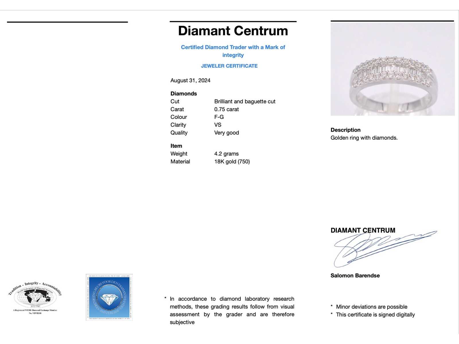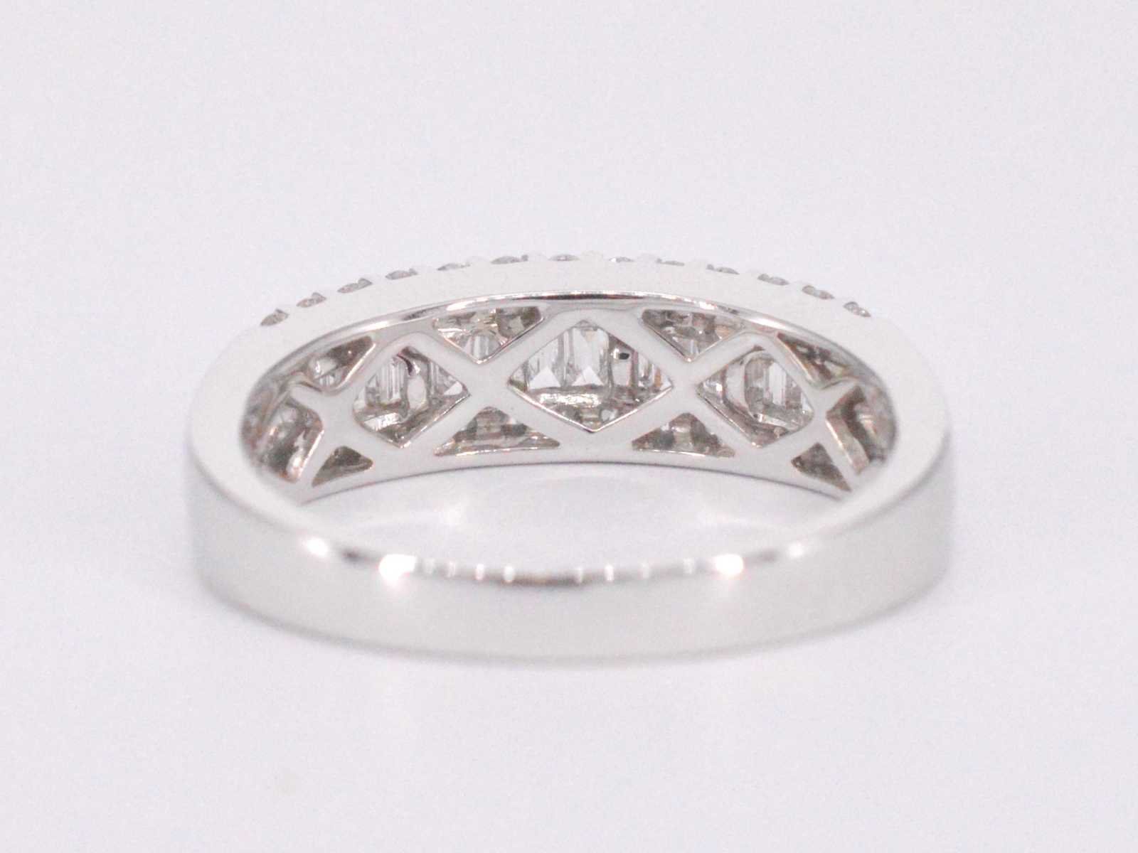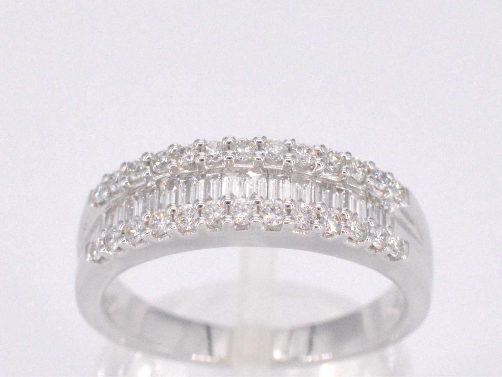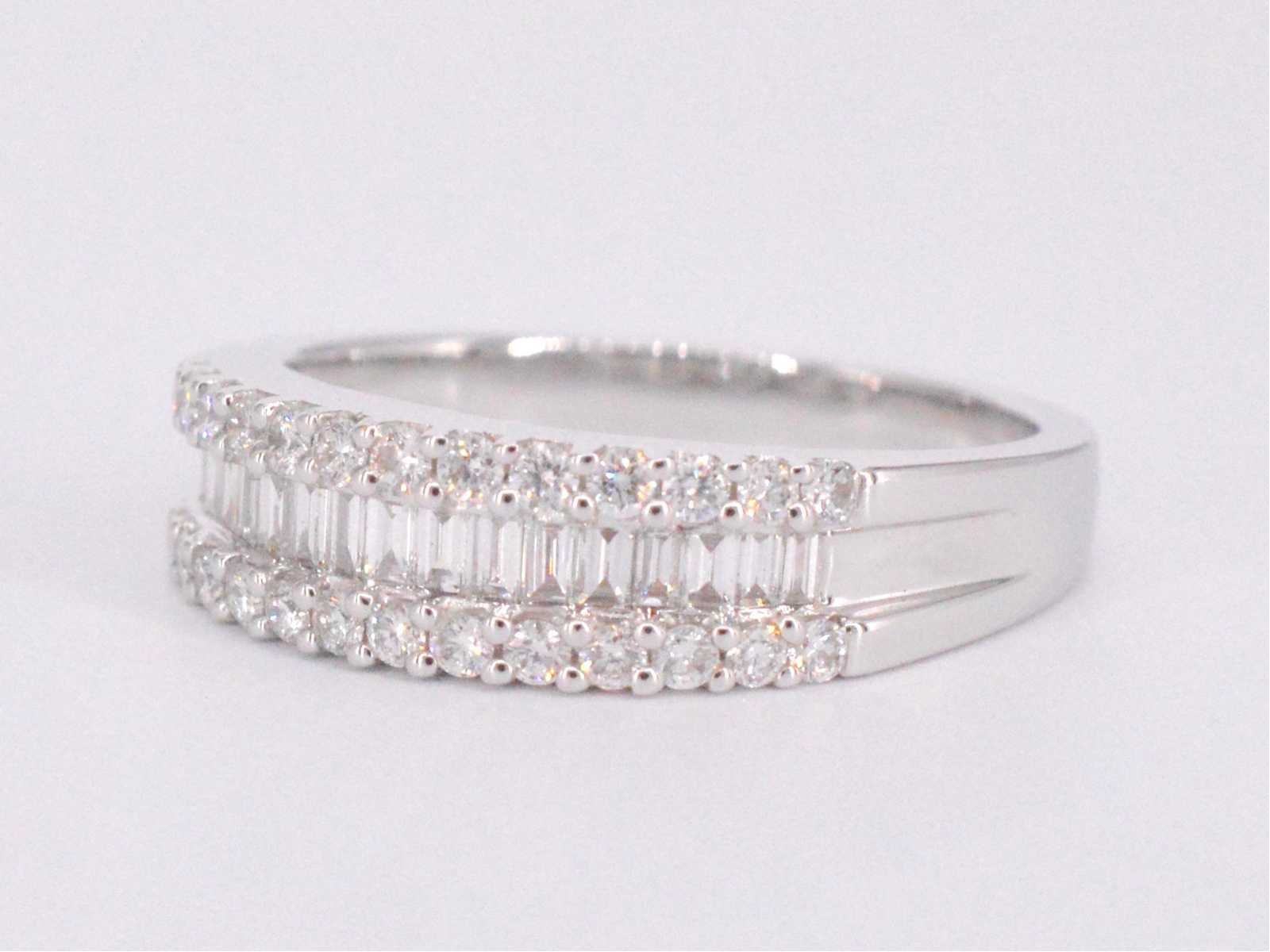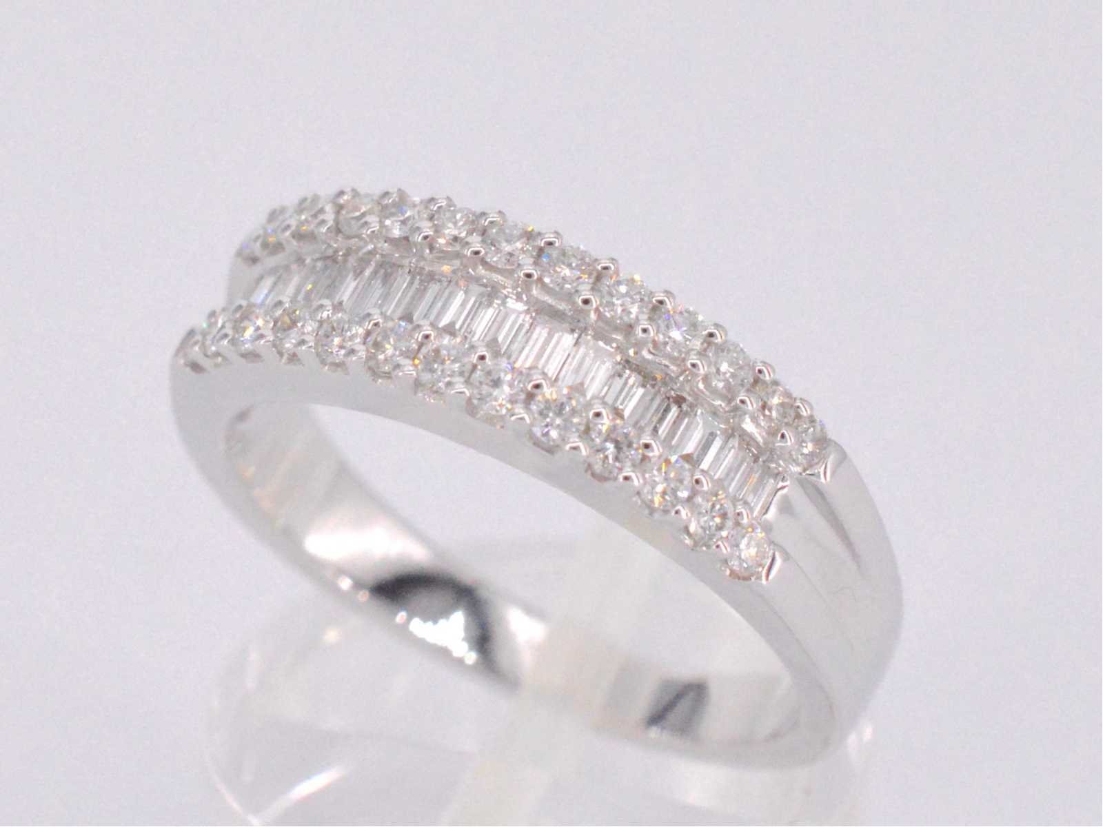 Samenvatting van gegevens Witgouden ring met briljant en baguettes Aantal: 42 stuks; Slijpvorm: Briljant en baguette geslepen; Gewicht (carat): 0.75 carat; Kleur: F-G; Zuiverheid: VS; Slijpkwaliteit: Zeer mooi; Juweel: Ring; Gewicht: 4.2 gram; Ringmaat (op maat gemaakt*): 53 (17 mm); Materiaal: 18K goud (750); Conditie: Nieuw; Verpakking: Luxe sieradendoos; Toelichting: De kwaliteit is overgenomen van het rapport behorend bij item. De waardebepaling is een beoordeling van een gecertificeerde diamantair, gebaseerd op consumentenprijzen.; Consumentenprijs: € 6.370,- Within 14 days Materiaal: Goud Gewicht diamant: 0.75ct Totaal gewicht: 4.2g Keurmerk: 750 Kleur diamant: F-G Slijpvorm diamant: Briljant en baguette geslepen Slijpkwaliteit diamant: Zeer mooi Zuiverheidsgraad diamant: VS