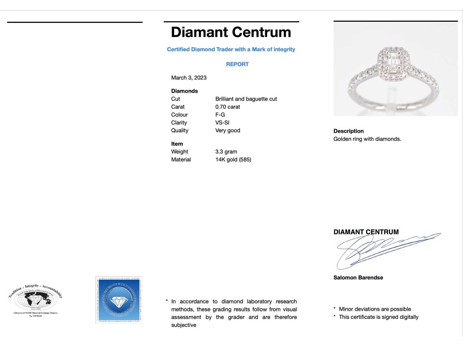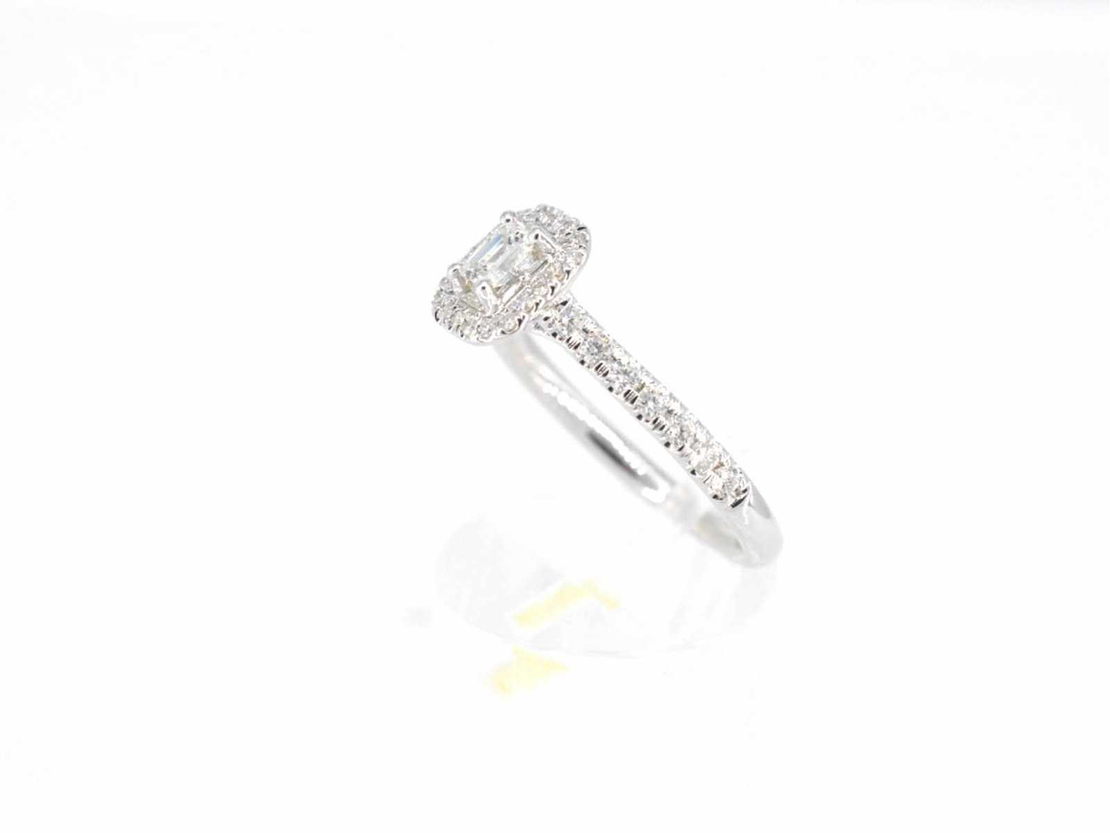 Samenvatting van gegevens Witgouden entourage ring met briljant en baguette geslepen diamant Diamant: Natuurlijk; Slijpvorm: Briljant en baguette geslepen; Gewicht (carat): 0.70 carat; Kleur: F-G; Zuiverheid: VS-SI; Slijpkwaliteit: Zeer mooi; Juweel: Ring; Gewicht: 3.3 gram; Ringmaat (op maat gemaakt*): 54 (17.25 mm); Materiaal: 14k goud (585); Conditie: Nieuw; Verpakking: Luxe sieradendoos; Toelichting: De kwaliteit is overgenomen van het rapport behorend bij item. De waardebepaling is een beoordeling van een gecertificeerde diamantair, gebaseerd op consumentenprijzen.; Consumentenprijs: € 3.693,- Within 14 days Materiaal: Goud Voornaamste diamant: Natuurlijk Gewicht diamant: 0.70ct Totaal gewicht: 3.3g Keurmerk: 585 Kleur diamant: F-G Slijpvorm diamant: Briljant en baguette geslepen Slijpkwaliteit diamant: Zeer mooi Zuiverheidsgraad diamant: VS-SI