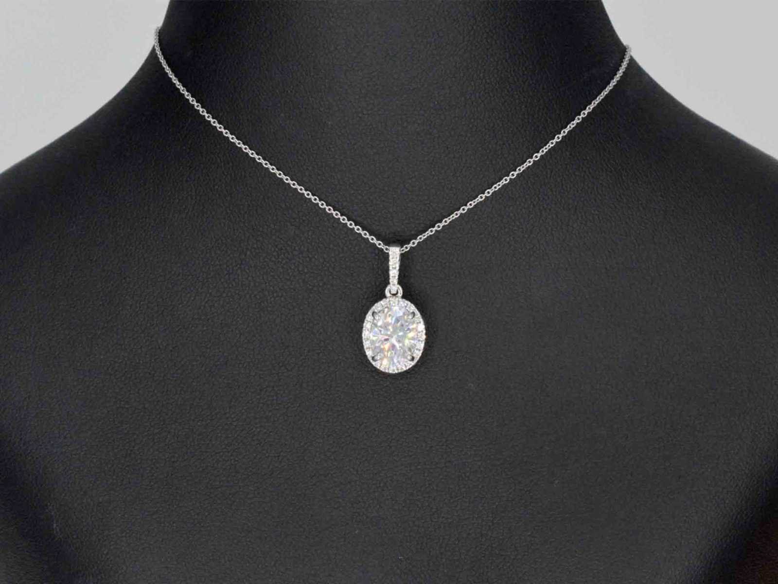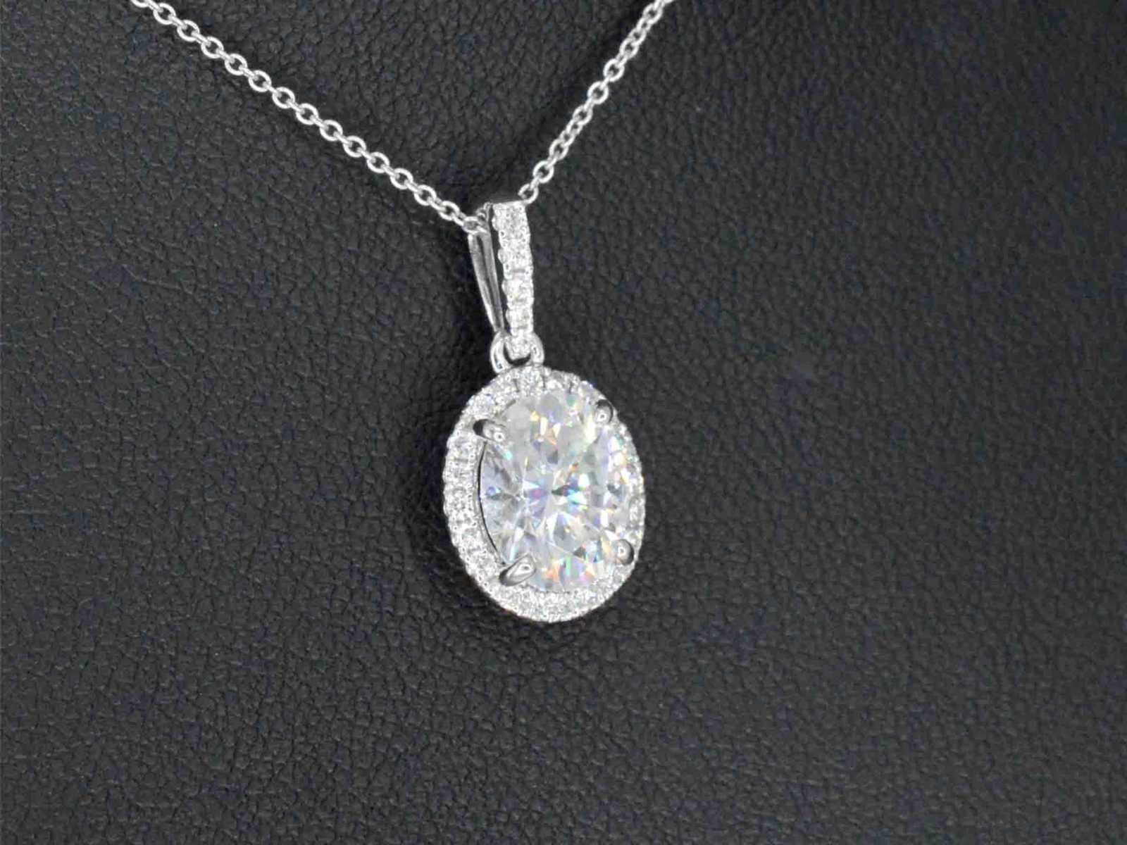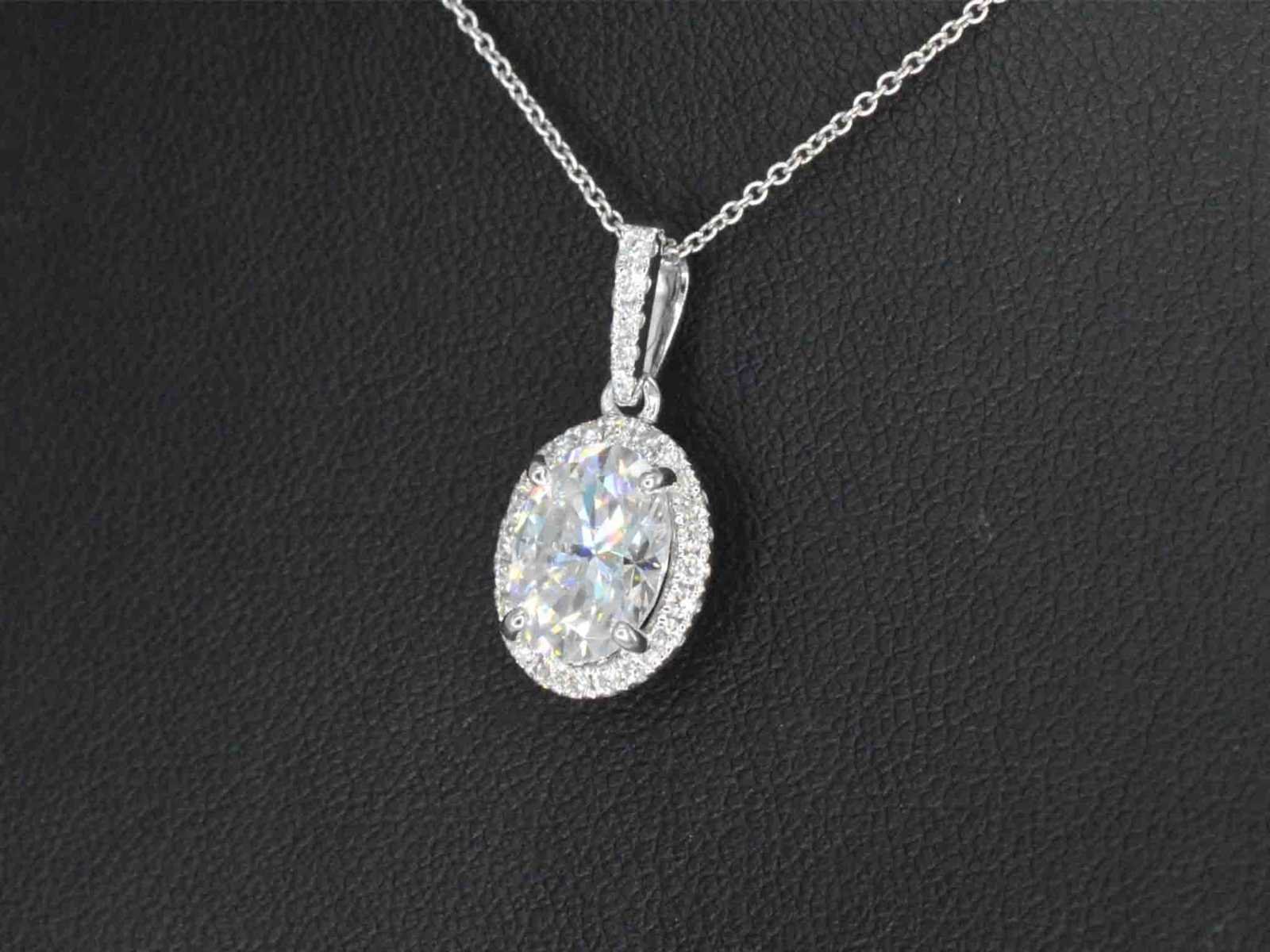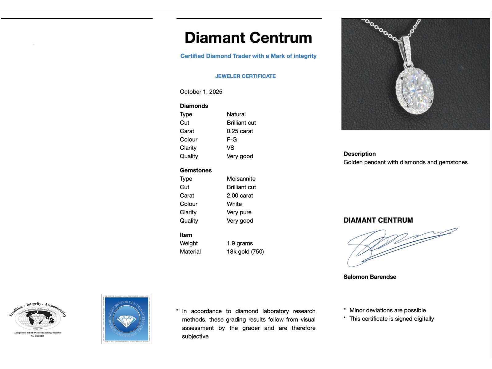 Samenvatting van gegevens 18 carat witgouden hanger met diamanten en een ovale briljant Diamant: Natuurlijk; Slijpvorm: Briljant geslepen; Gewicht (carat): 0.25 carat; Kleur: F-G; Zuiverheid: VS; Slijpkwaliteit: Zeer mooi; Edelsteen: Moisanniet; Slijpvorm: Briljant geslepen; Gewicht (carat): 2.00 carat; Kleur: Wit; Zuiverheid: Zeer zuiver; Slijpkwaliteit: Very good; Juweel: Hanger (excl. ketting); Gewicht: 1.9 gram; Afmetingen/lengte: 19 x 10 mm; Materiaal: 18K goud (750); Conditie: Nieuw; Verpakking: Luxe sieradendoos; Toelichting: De kwaliteit is overgenomen van het rapport behorend bij item. De waardebepaling is een beoordeling van een gecertificeerde diamantair, gebaseerd op consumentenprijzen.; Consumentenprijs: € 3.010,- Within 14 days Materiaal: Goud Voornaamste diamant: Natuurlijk Kleur diamant: F-G Gewicht diamant: 0.25ct Slijpvorm diamant: Briljant geslepen Slijpkwaliteit diamant: Zeer mooi Zuiverheidsgraad diamant: VS Edelsteen: Moisanniet Kleur edelsteen: Wit Slijpvorm edelsteen: Briljant geslepen Slijpkwaliteit edelsteen: Very good Zuiverheidsgraad edelsteen: Zeer zuiver Totaal gewicht: 1.9g Keurmerk: 750