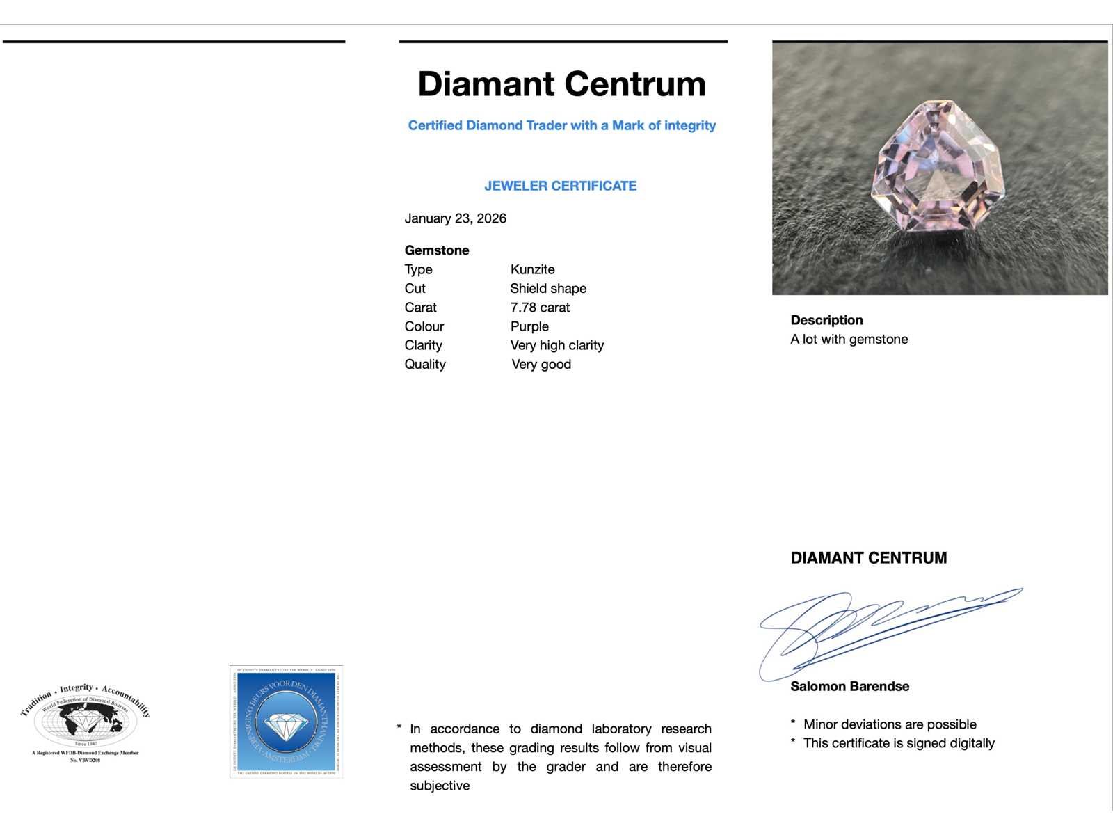 Samenvatting van gegevens Kunziet - 7.78 carat natuurlijke kunziet Edelsteen: Kunziet; Aantal: 1 stuk; Slijpvorm: Schild vorm geslepen; Gewicht (carat): 7.78 carat; Kleur: Paars; Zuiverheid: Zeer hoge zuiverheidsgraad; Slijpkwaliteit: Heel mooi; Conditie: Nieuw; Verpakking: Edelsteendoos; Toelichting: De kwaliteit is overgenomen van het rapport behorend bij item. De waardebepaling is een beoordeling van een gecertificeerde diamantair, gebaseerd op consumentenprijzen.; Consumentenprijs: € 3.000,- Within 14 days Edelsteen: Kunziet Kleur edelsteen: Paars Slijpvorm edelsteen: Schild vorm geslepen Slijpkwaliteit edelsteen: Heel mooi Zuiverheidsgraad edelsteen: Zeer hoge zuiverheidsgraad