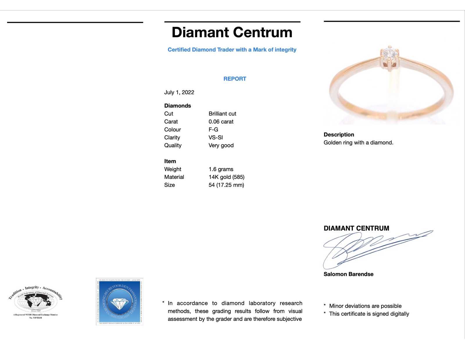 Samenvatting van gegevens Rosegouden ring solitaire met een briljant geslepen diamant Diamant: Natuurlijk; Aantal: 1 stuk; Slijpvorm: Briljant geslepen; Gewicht (carat): 0.06 carat; Kleur: F-G; Zuiverheid: VS-SI; Slijpkwaliteit: Zeer mooi; Juweel: Ring; Gewicht: 1.6 gram; Ringmaat (op maat gemaakt*): 54 (17.25 mm); Materiaal: 14k goud (585); Conditie: Nieuw; Verpakking: Luxe sieradendoos; Toelichting: De kwaliteit is overgenomen van het rapport behorend bij item. De waardebepaling is een beoordeling van een gecertificeerde diamantair, gebaseerd op consumentenprijzen.; Consumentenprijs: € 980,- Within 14 days Materiaal: Goud Voornaamste diamant: Natuurlijk Gewicht diamant: 0.06ct Totaal gewicht: 1.6g Keurmerk: 585 Kleur diamant: F-G Slijpvorm diamant: Briljant geslepen Slijpkwaliteit diamant: Zeer mooi Zuiverheidsgraad diamant: VS-SI