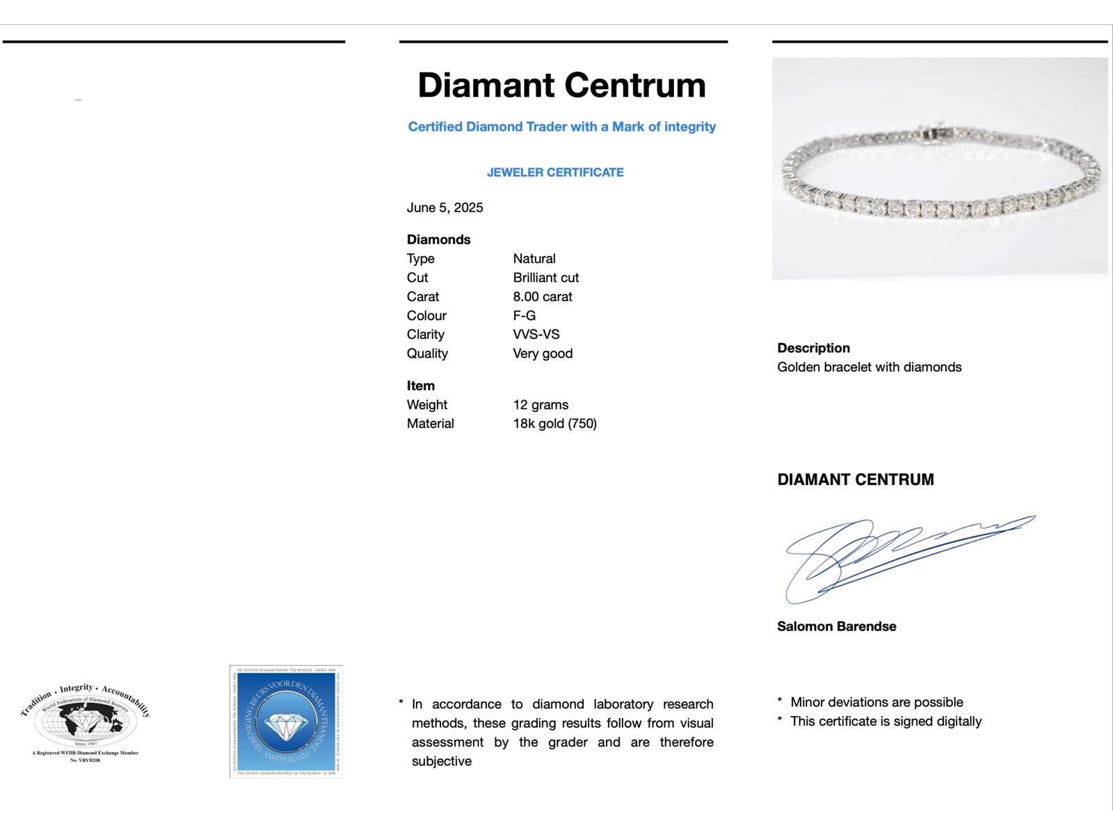 Samenvatting van gegevens Witgouden tennisarmband met 8.00 carat diamant Diamant: Natuurlijk; Aantal: 48 stuks; Slijpvorm: Briljant geslepen; Gewicht (carat): 8.00 carat; Kleur: F-G; Zuiverheid: VVS-VS; Slijpkwaliteit: Zeer mooi; Juweel: Armband; Gewicht: 12 gram; Afmetingen/lengte: 17.5 cm; Materiaal: 18K goud (750); Conditie: Nieuw; Verpakking: Luxe sieradendoos; Toelichting: De kwaliteit is overgenomen van het rapport behorend bij item. De waardebepaling is een beoordeling van een gecertificeerde diamantair, gebaseerd op consumentenprijzen.; Consumentenprijs: € 39.813,- Within 14 days Materiaal: Goud Voornaamste diamant: Natuurlijk Kleur diamant: F-G Gewicht diamant: 8.00ct Slijpvorm diamant: Briljant geslepen Slijpkwaliteit diamant: Zeer mooi Zuiverheidsgraad diamant: VVS-VS Totaal gewicht: 12g Keurmerk: 750
