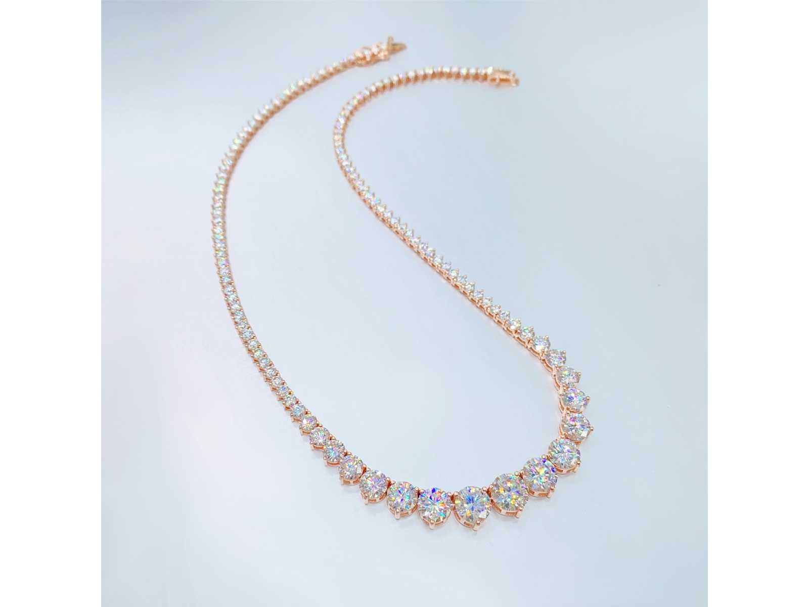 Samenvatting van gegevens Rose collier met oplopende briljanten van 25.00 carat totaal Edelsteen: Moissaniet; Aantal: ca. 124 stuks; Slijpvorm: Briljant geslepen; Gewicht (carat): 25.00 carat; Kleur: D; Zuiverheid: VVS; Slijpkwaliteit: Zeer mooi; Juweel: Collier; Merk: Harmony; Gewicht: 23 gram; Afmetingen/lengte: 44 cm; Materiaal: Vermeil hoog gehalte sterling zilver (925); Conditie: Nieuw; Verpakking: sieradendoos of fluwelen etui; Toelichting: De kwaliteit is overgenomen van het rapport behorend bij item. De waardebepaling is een beoordeling van een gecertificeerde diamantair, gebaseerd op consumentenprijzen.; Extra informatie: Het gemeten gewicht van de edelstenen is volgens diamant maten; Consumentenprijs: € 3.400,- Within 14 days Materiaal: Zilver Edelsteen: Moissaniet Kleur edelsteen: D Totaal gewicht: 23g Keurmerk: 925 Slijpkwaliteit edelsteen: Zeer mooi Slijpvorm edelsteen: Briljant geslepen Zuiverheidsgraad edelsteen: VVS