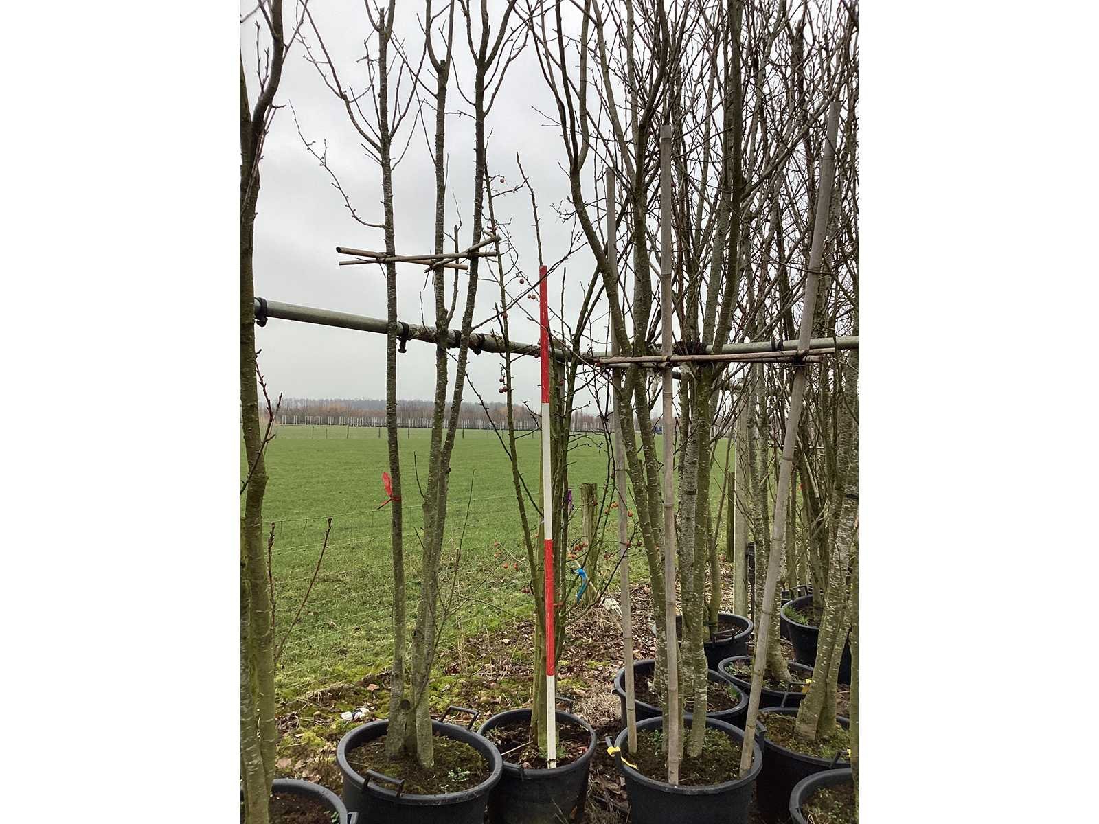 De kavels worden door ons verzameld en klaargelegd voor transport; Wilt u gebruik maken van de bezorgservice neem dan contact op via het emailadres arina@groviatrees.com. Als tip, de bomen zitten nu in de winterrust dus wilt u graag weten wat de zomer- en de herfstkleuren zijn, kijk dan op internet daar staan hele mooie voorbeelden van de bomen. Voor overige vragen bel 0645641495 of 0633049344 Type: Sierappel Latijnse benaming: Malus evereste Hoogte ca.: 250cm In pot: true Stamdikte: 15cm