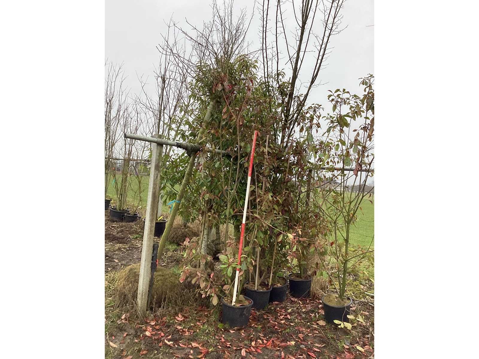 De kavels worden door ons verzameld en klaargelegd voor transport; Wilt u gebruik maken van de bezorgservice neem dan contact op via het emailadres arina@groviatrees.com. Als tip, de bomen zitten nu in de winterrust dus wilt u graag weten wat de zomer- en de herfstkleuren zijn, kijk dan op internet daar staan hele mooie voorbeelden van de bomen. Voor overige vragen bel 0645641495 of 0633049344 Type: Glansmispel Latijnse benaming: Photinia Red Robin Hoogte ca.: 250cm In pot: true Stamdikte: 12cm