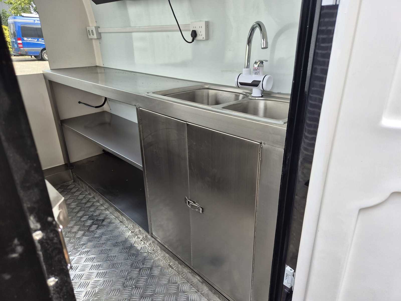 Zwarte foodtruck met ledverlichting, rvs inbouwkeuken / werkbank, groepenkast, koelwerkbank, afzuigkap, stabilisatiepoten. Afmetingen en gewicht: Lengte: 220 cm (cabine), totaal 320 cm Breedte: 160 cm Hoogte: 230 cm Gewicht: 550 KG Bouwjaar: 2025 Ledig gewicht: 550kg Hoogte: 230cm Lengte: 320cm Breedte: 160cm