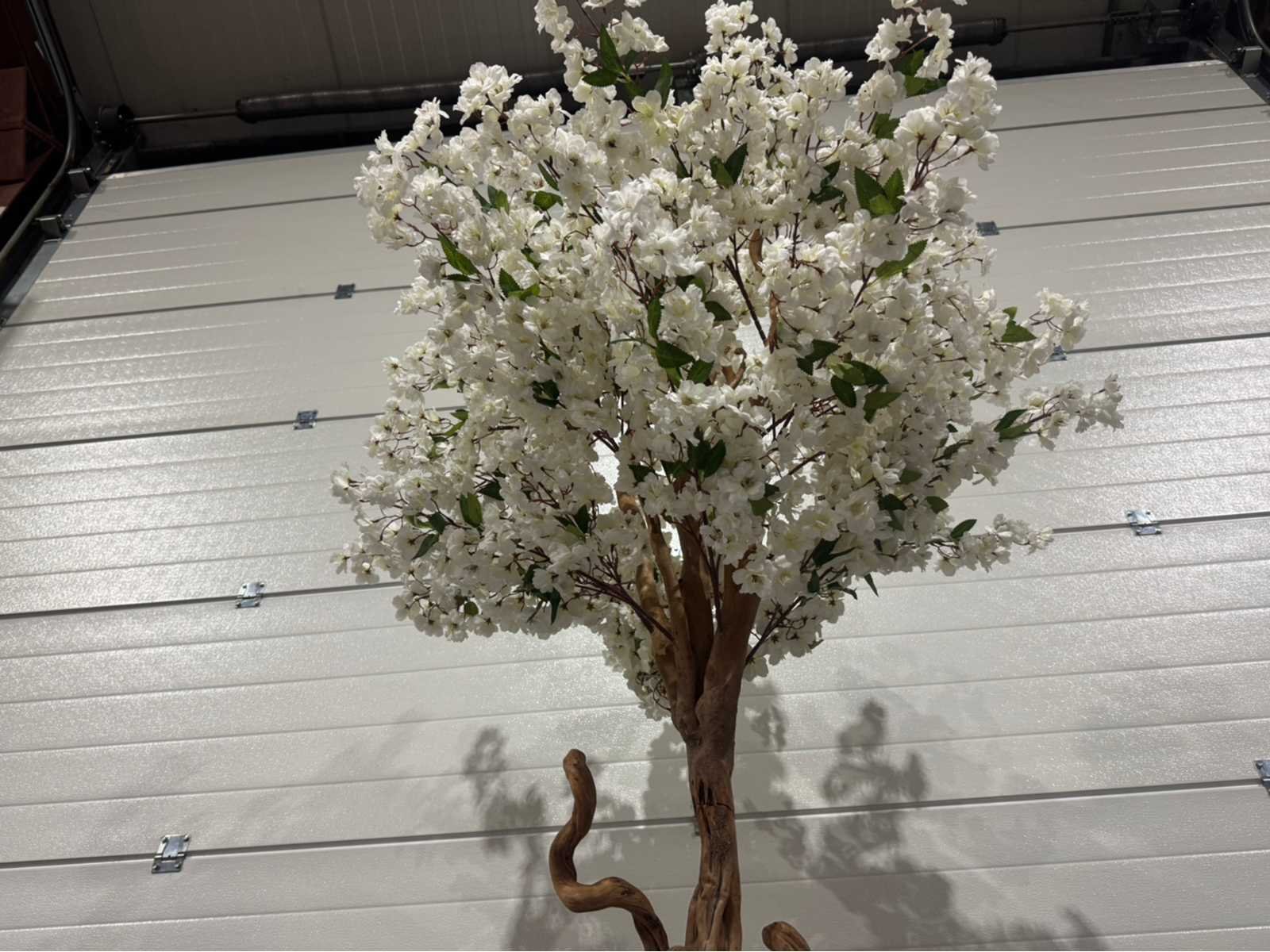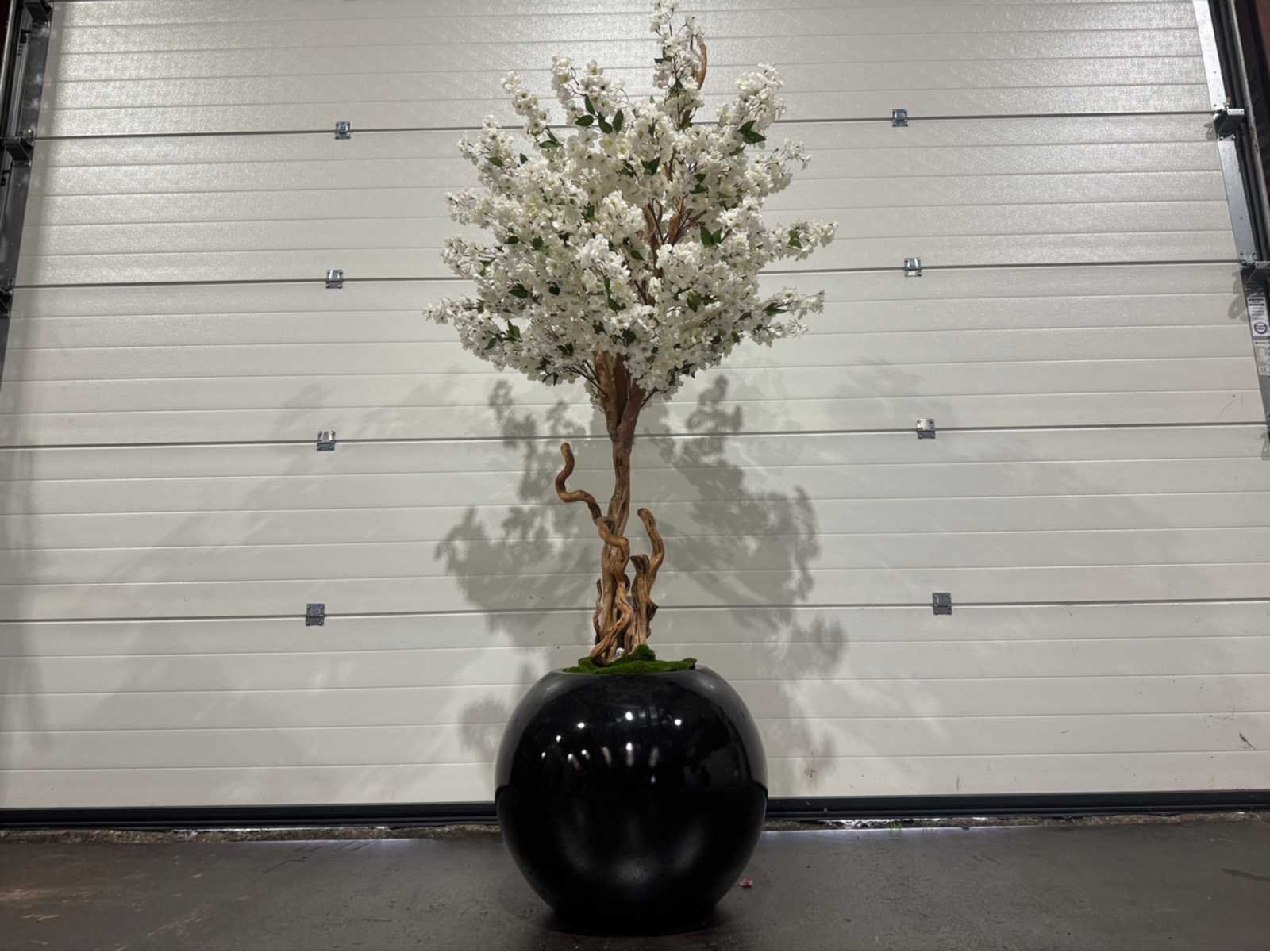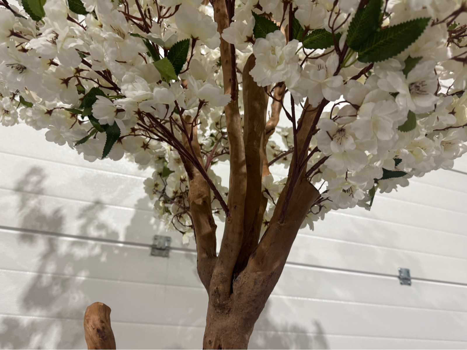 Ongebruikt; voorzien van pot, pot is dus inclusief; stam bestaat uit 2 delen; eenvoudig in en uit elkaar te zetten; hoogte inclusief pot ca 2000mm Type: Kersen bloesem Kleur: Wit