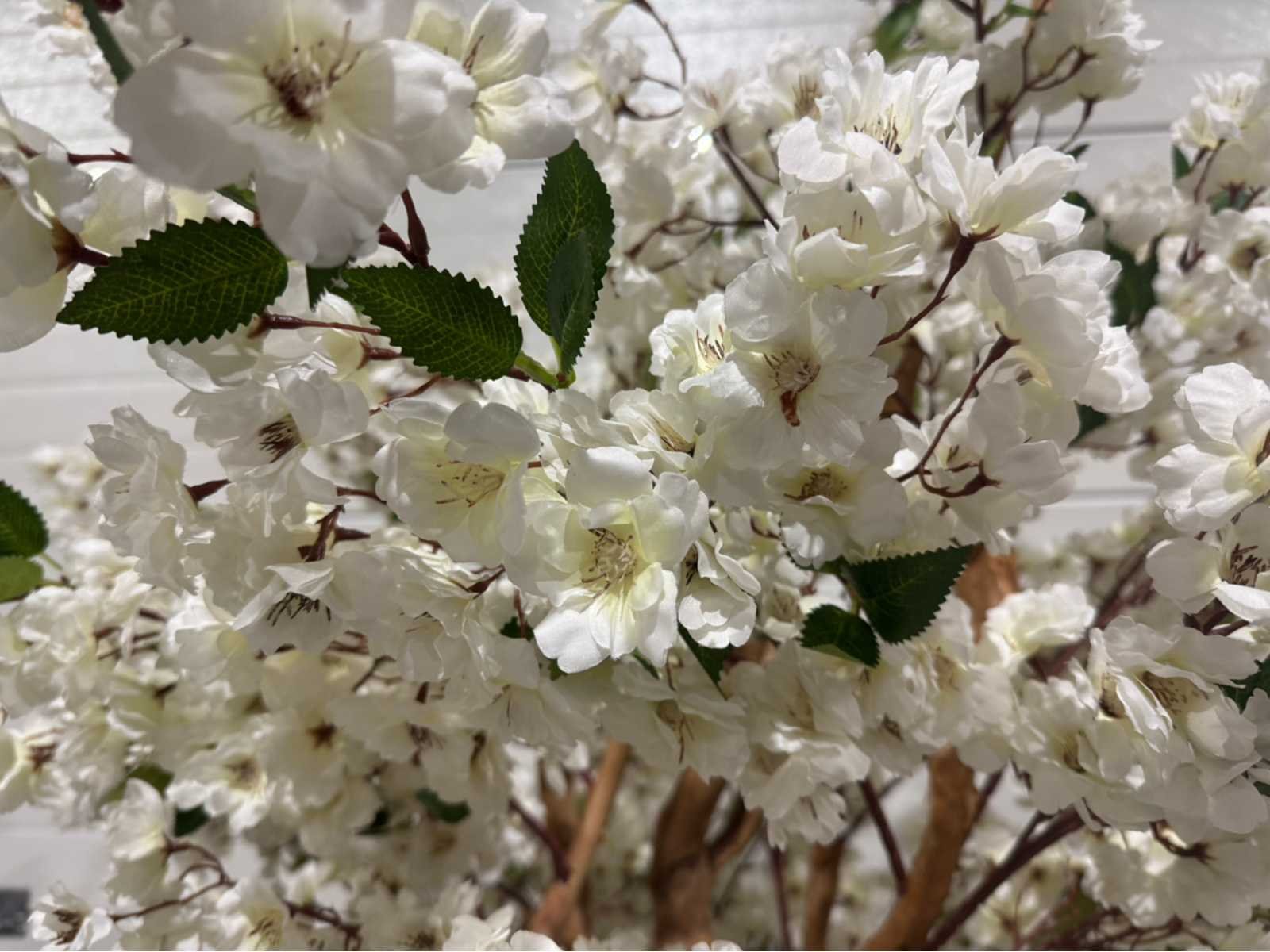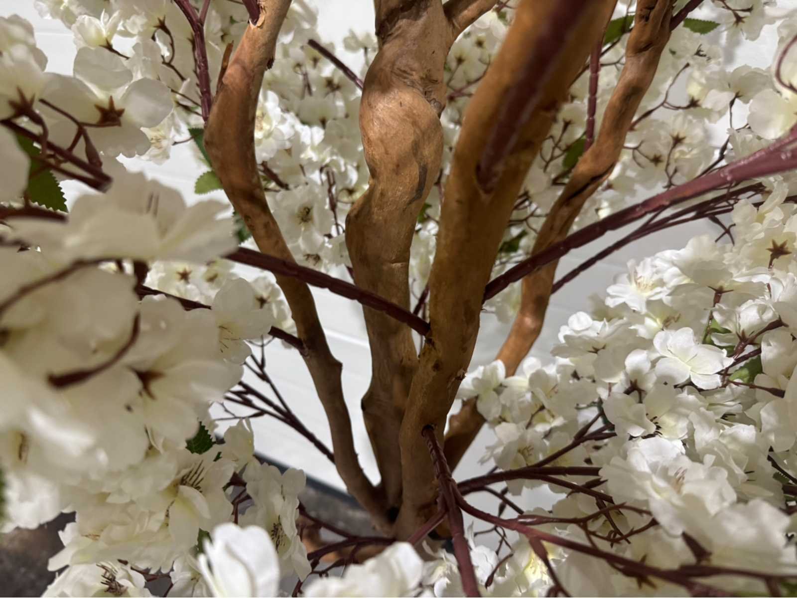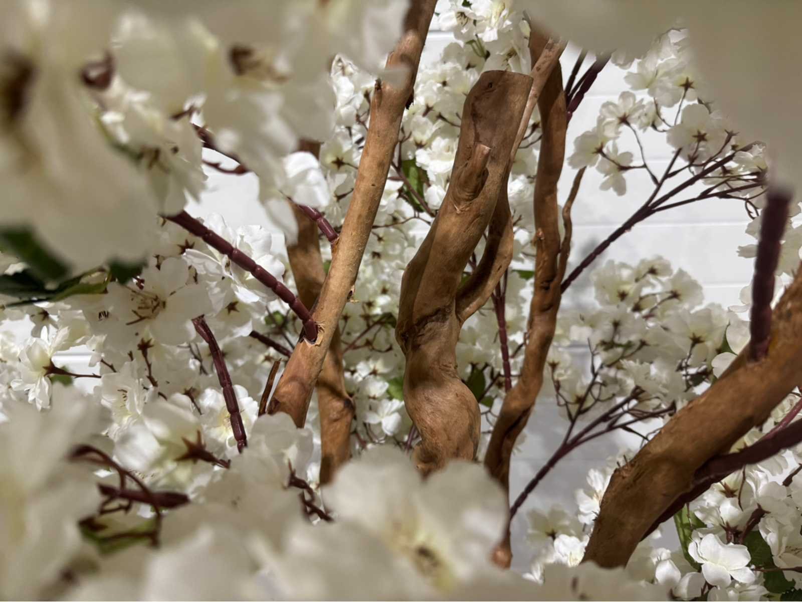 Ongebruikt; voorzien van pot, pot is dus inclusief; stam bestaat uit 2 delen; eenvoudig in en uit elkaar te zetten; hoogte inclusief pot ca 2000mm Type: Kersen bloesem Kleur: Wit