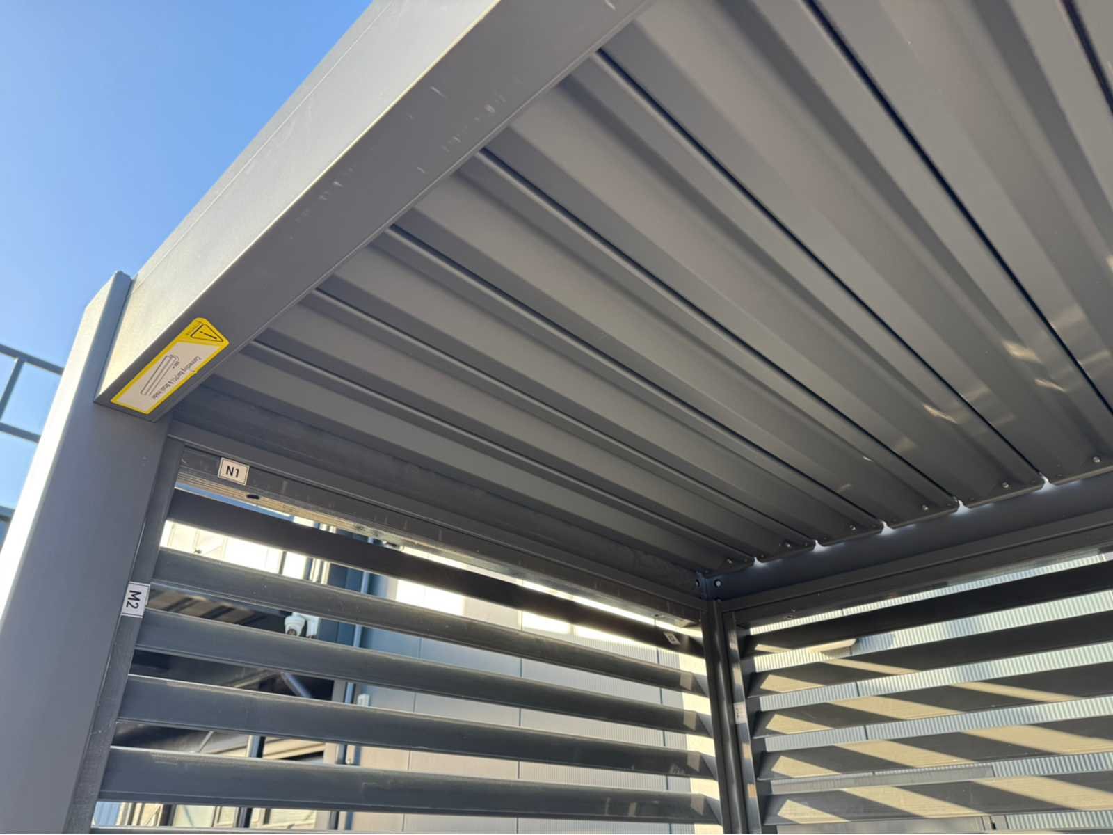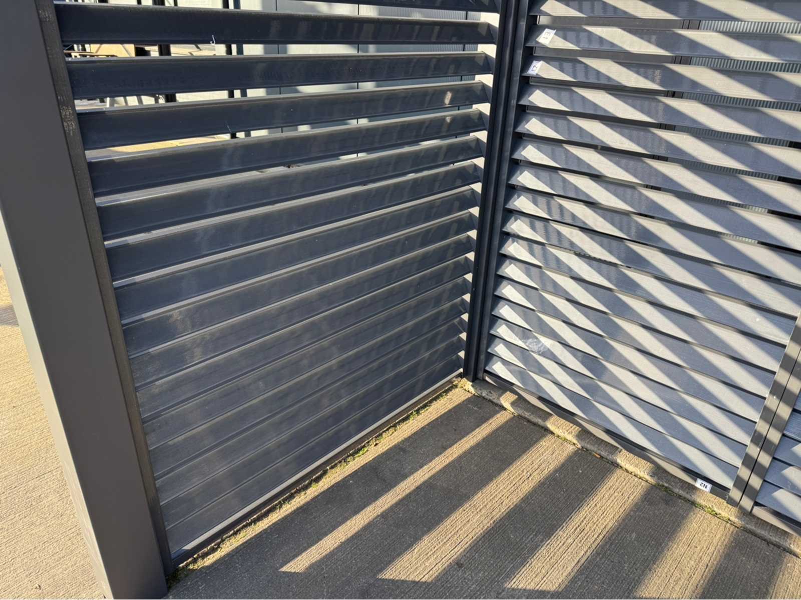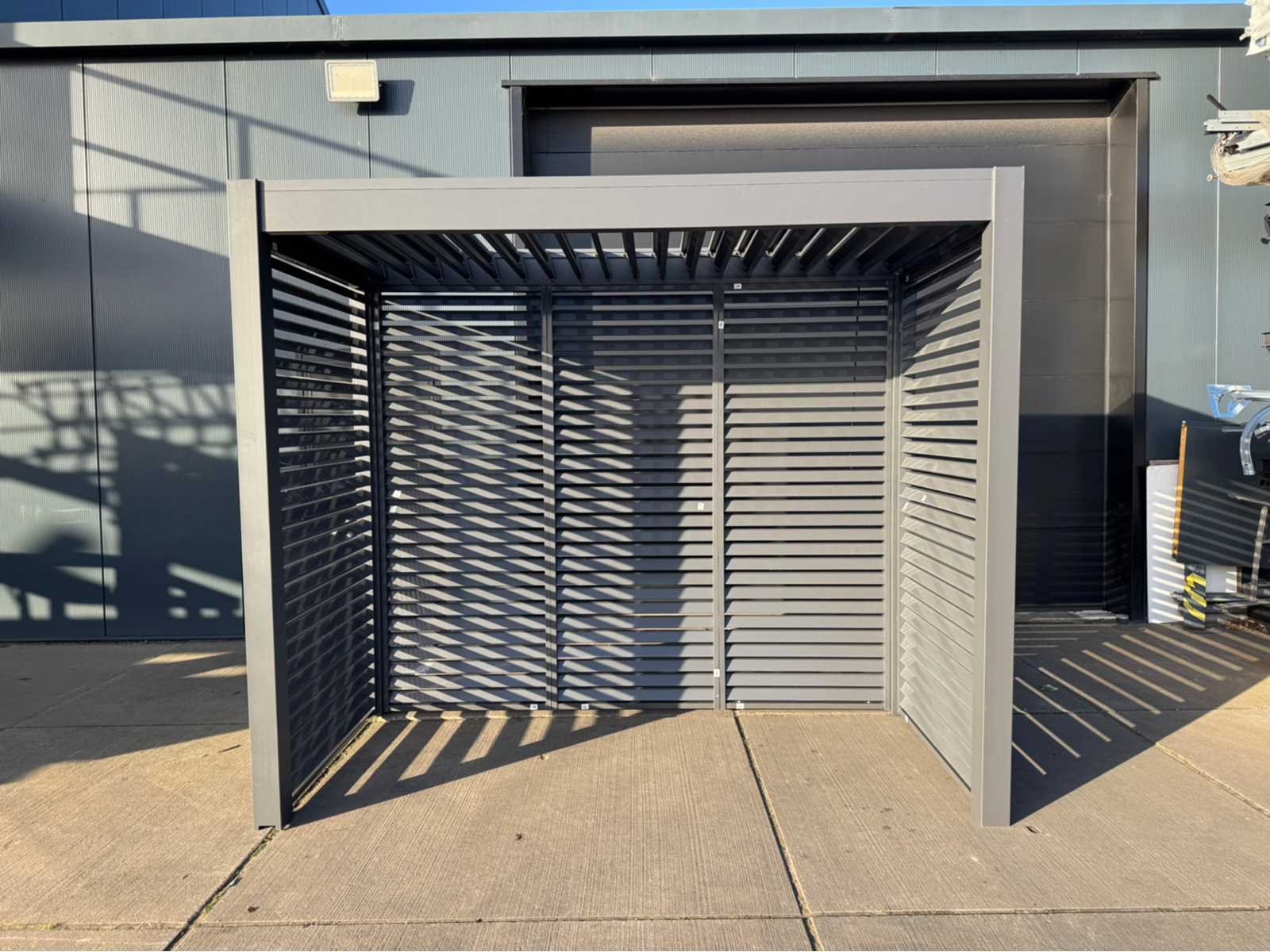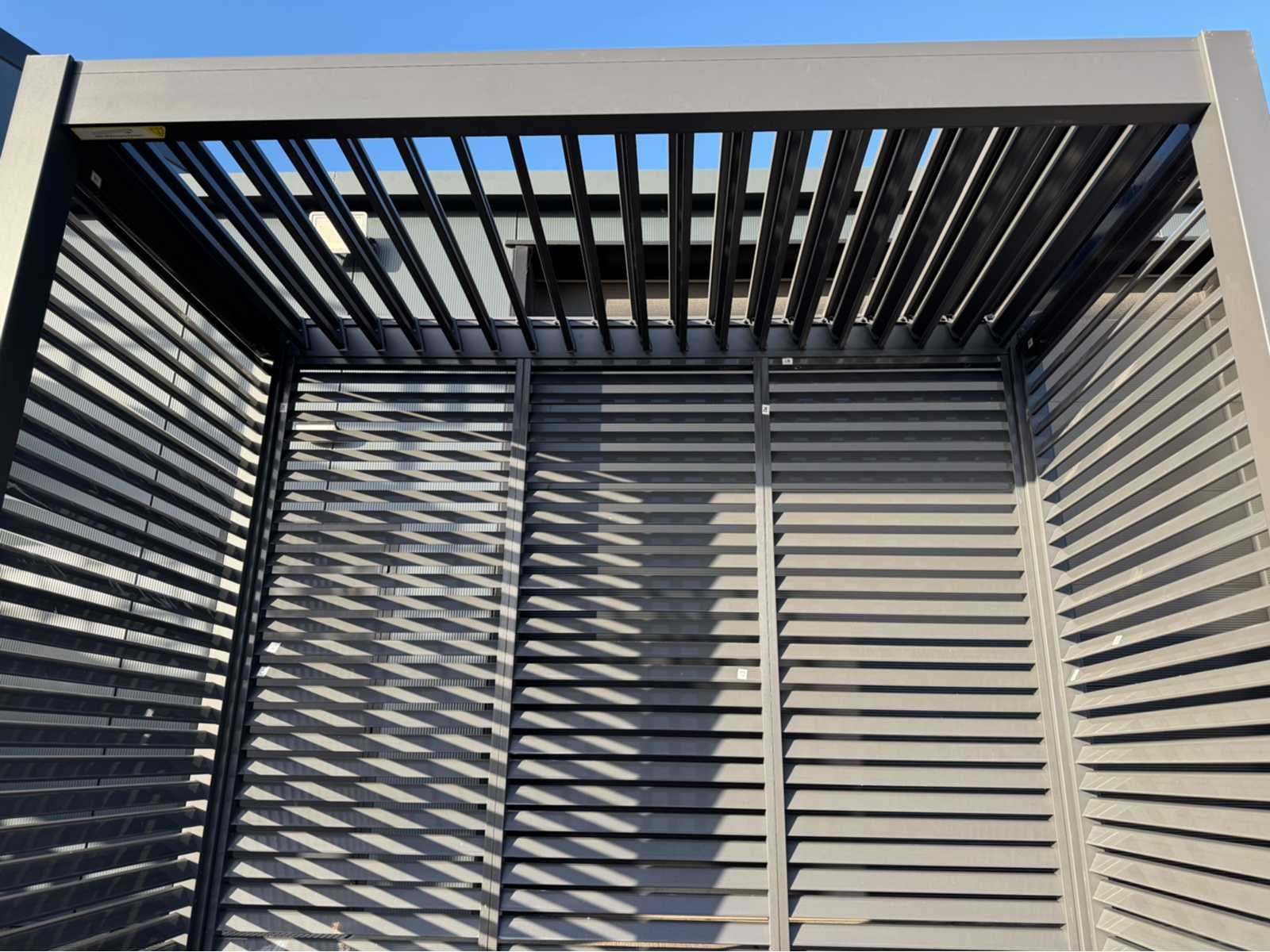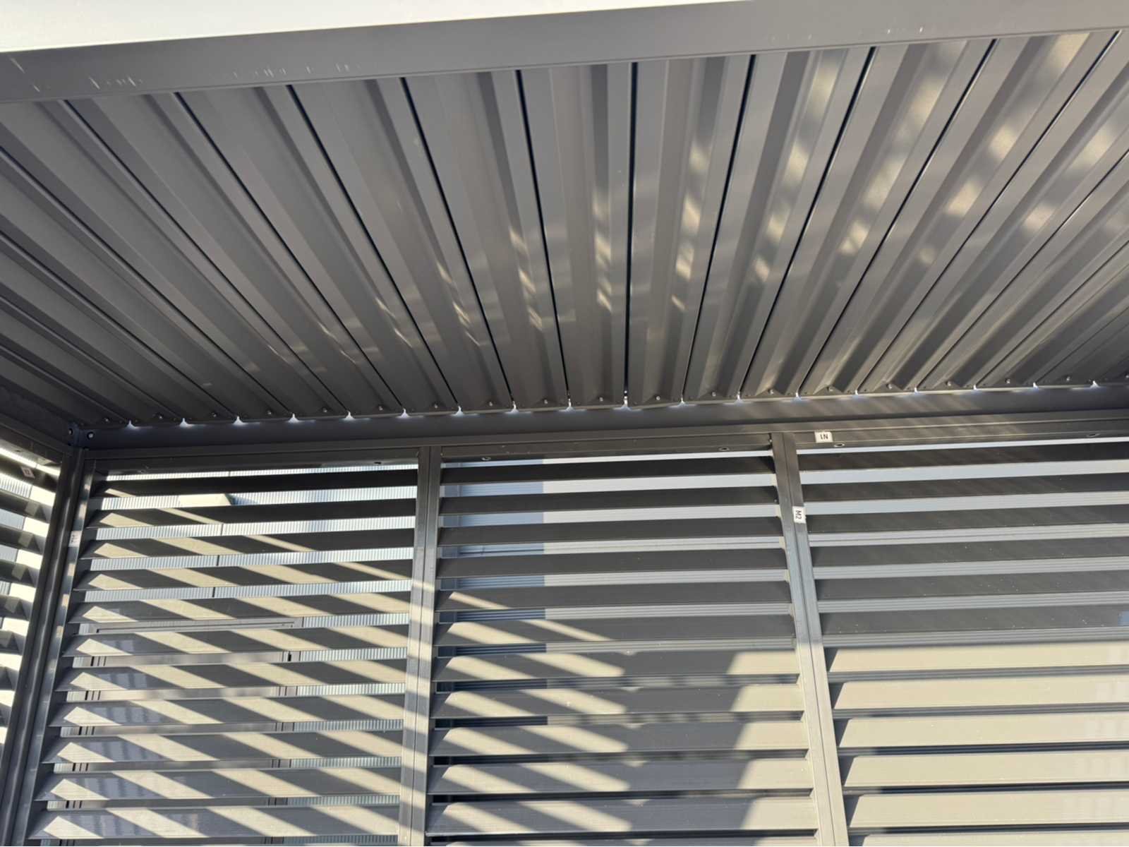 Ongebruikt; gedemonteerd geleverd in dozen; uiteraard inclusief al het benodigde klein materiaal zoals schroeven e.d; diepte is ca 1520mm; lamellen in het dak zijn open en dicht te doen dmv een handmatige slinger Lengte: 300cm Breedte: 152cm Hoogte: 255cm Materiaal: Aluminium