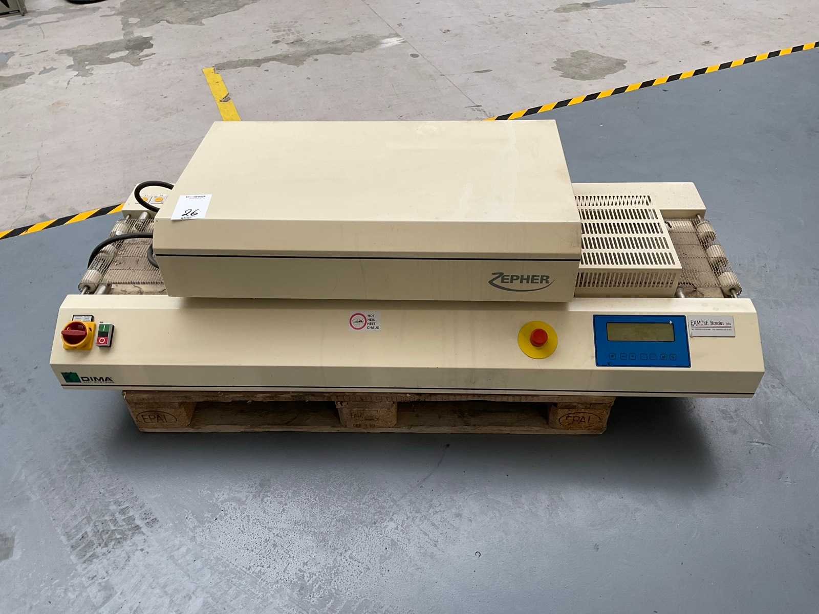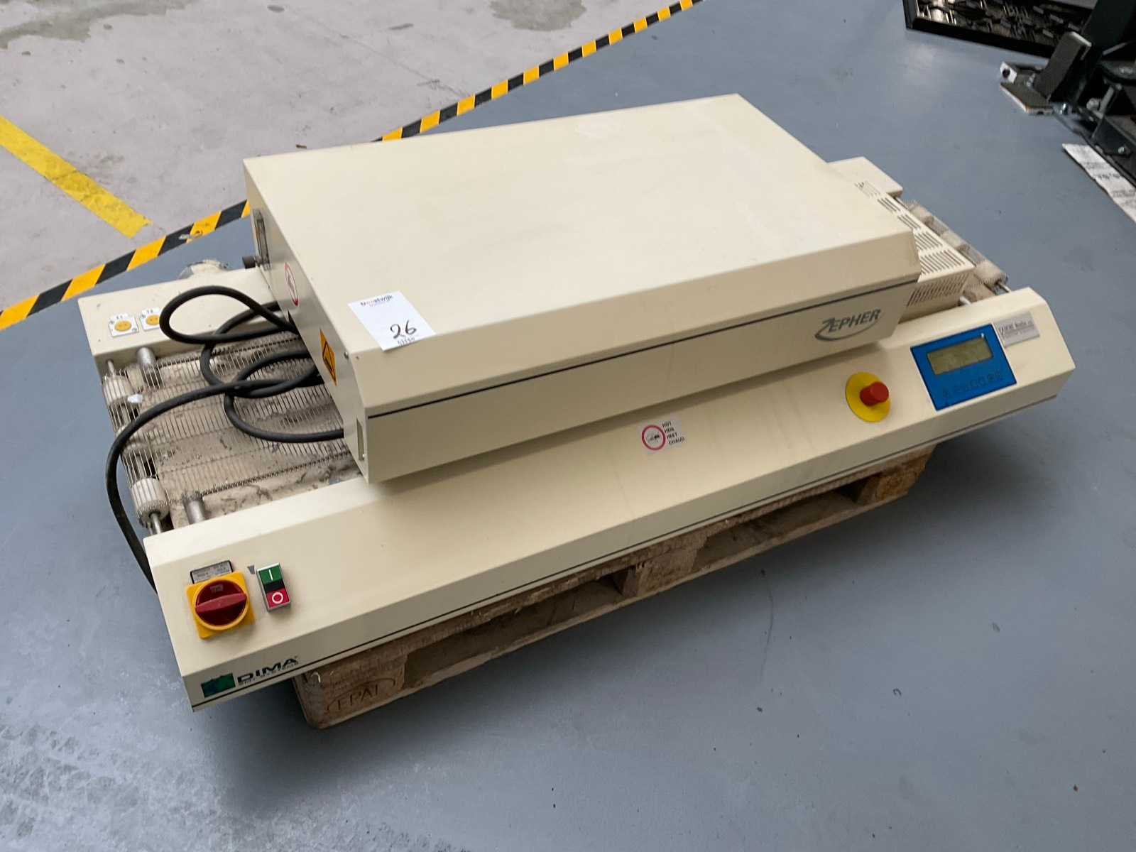 Voorzien van: transportband, noodstop en CE-markering. Geschikt voor het uitharden van UV-lak, inkt en coatings. Merk: Dima Type: SMRO-0252 Serienummer: 992190 Aansluiting: 230V Totale afmeting L: 1650mm Totale afmeting Breedte: 690mm Totale afmeting Hoogte: 370mm