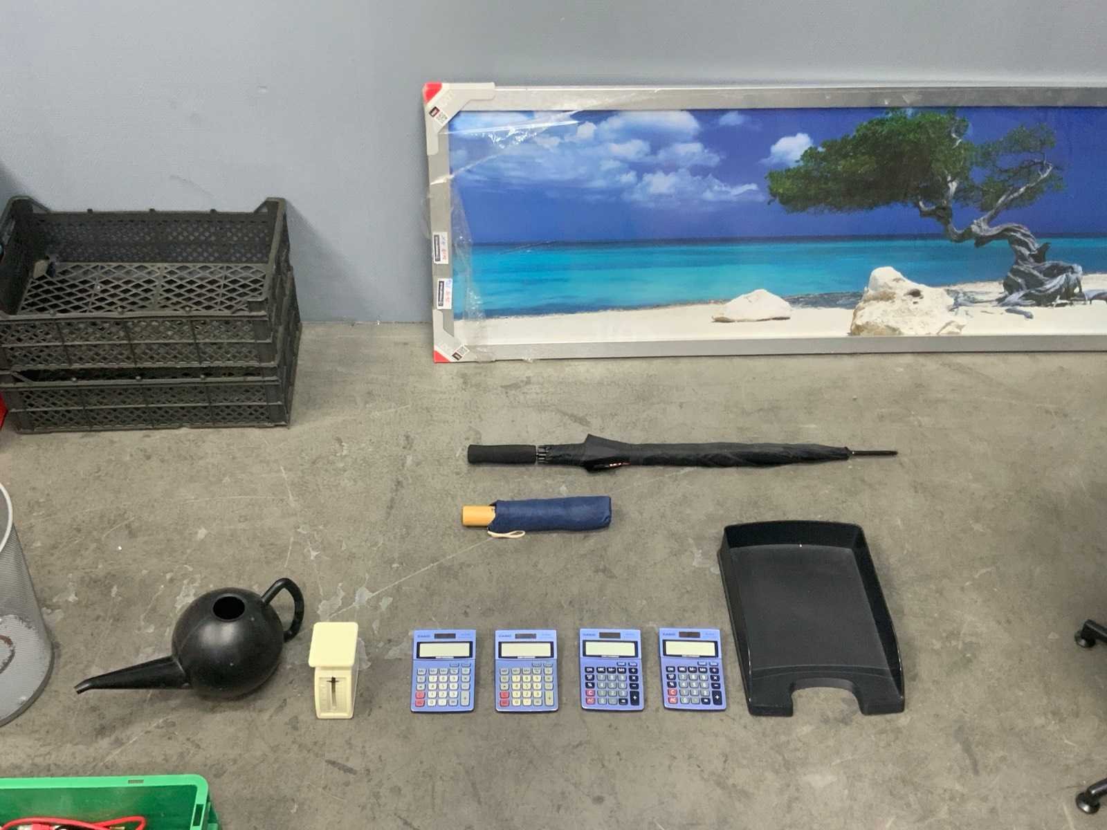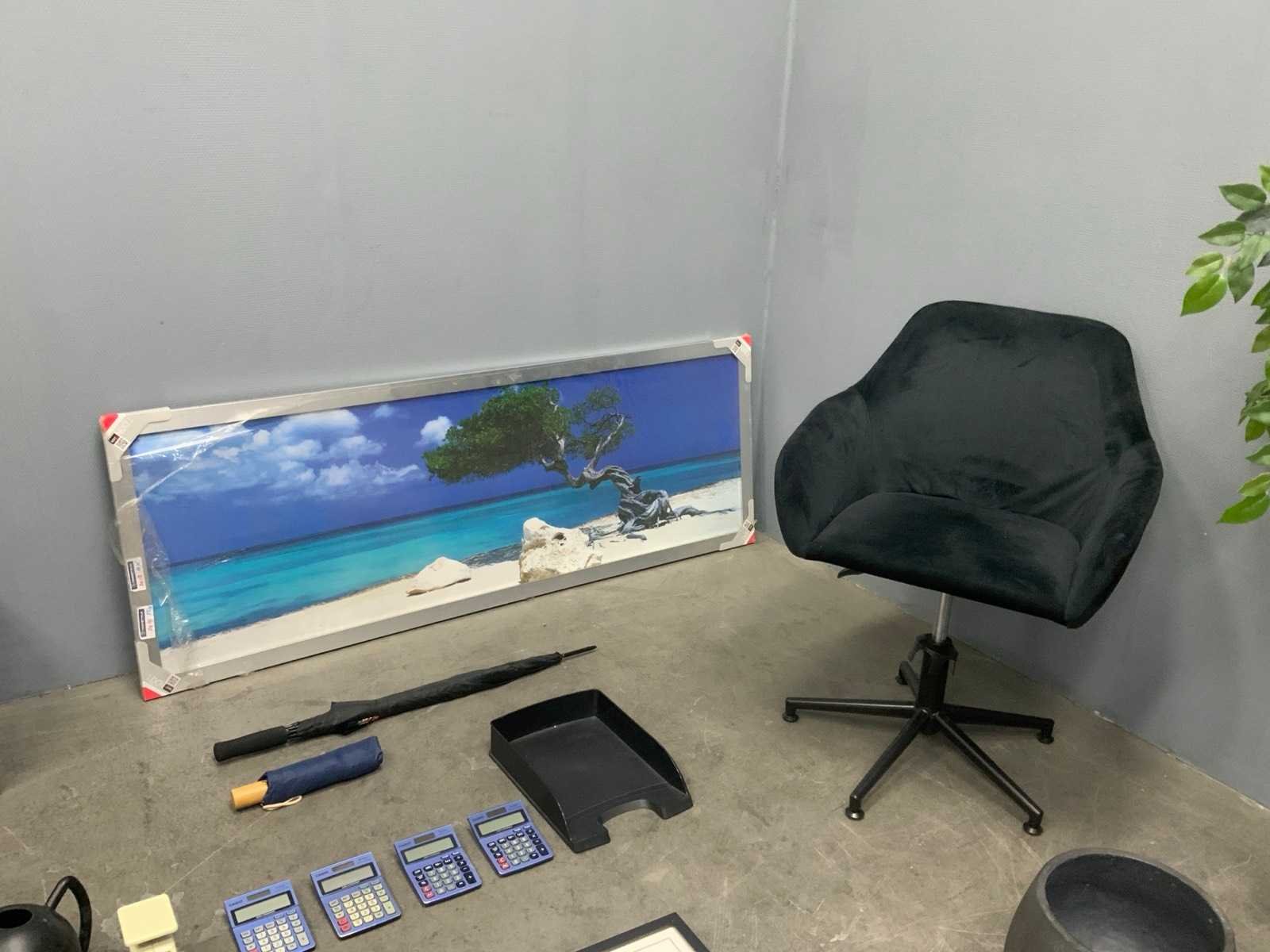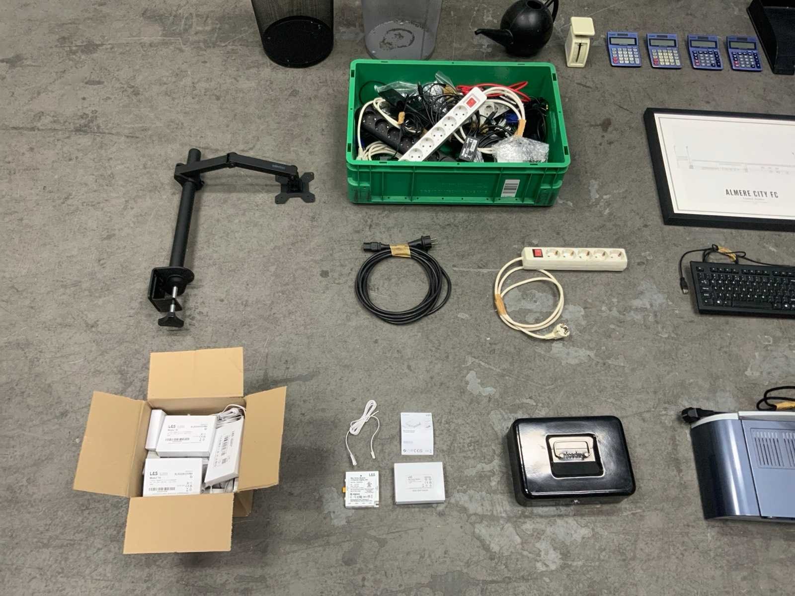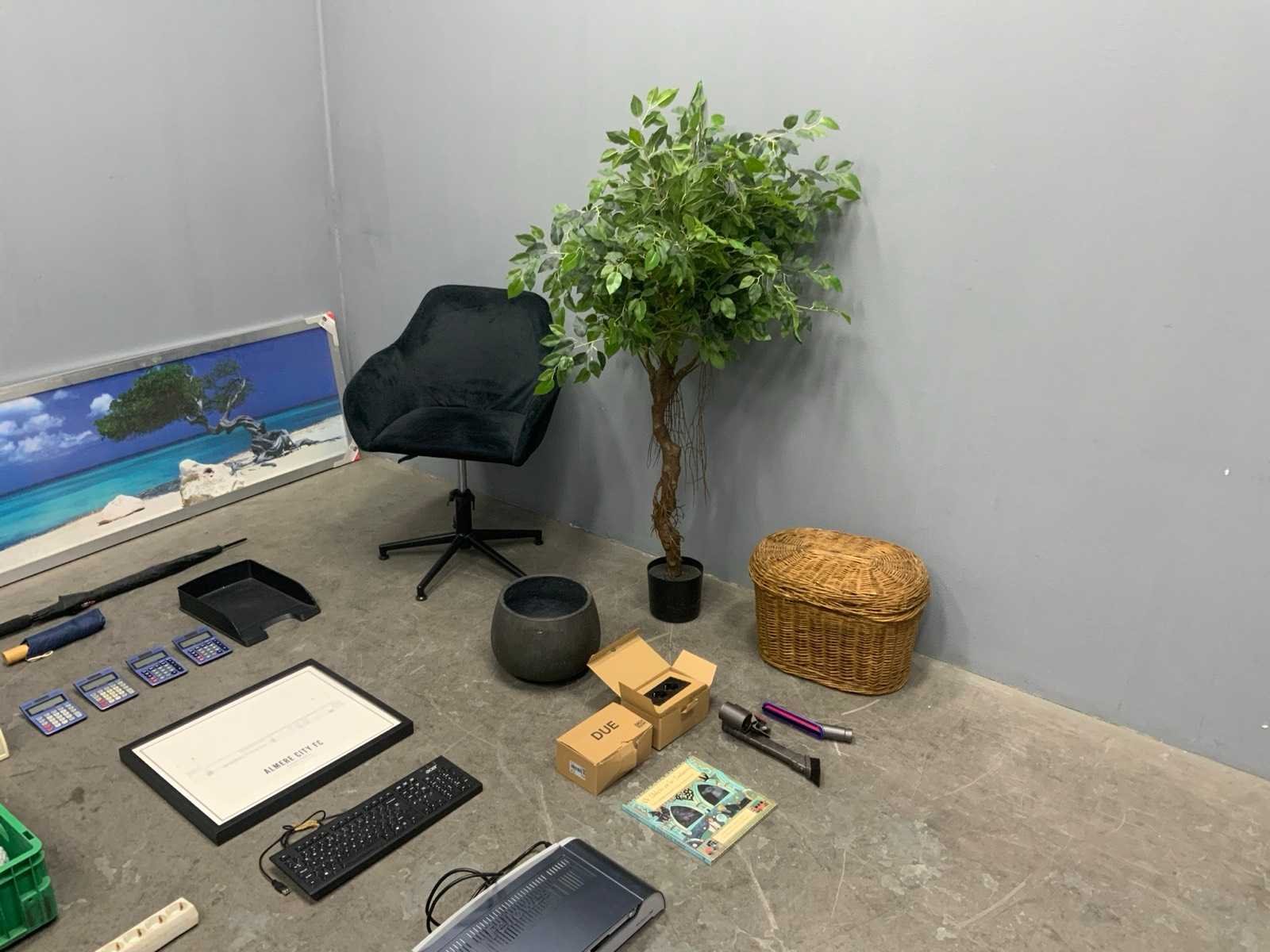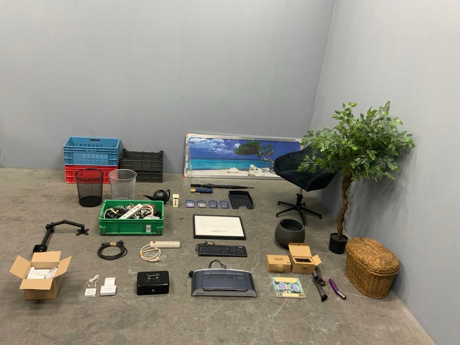 1e: Fellowes thermische bindmachine 2e: L&S Mec Driver Modules ZigBee 3e: Bachmann DUE inbouwstopcontacten 4e: Dyson stofzuiger mondstukken 5e: Monitor steun 6e: Stoel 7e: Kunst plant 8e: Kantoor artikelen 9e: Foto in lijst 10e: Elektra 11e: Kratten 12e: Opbergkist voor contant geld