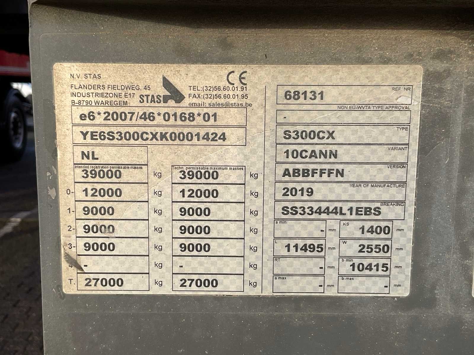 Kipper; 56 m3 Merk: Stas Type: S300CX Bouwjaar: 2019 Chassisnummer VIN: YE6S300CXK0001424 Kenteken: OR-49-YL Datum eerste toelating (NL): 2019-06-05 Datum eerste toelating: 2019-06-05 APK vervaldatum: 2026-08-23 Aantal assen: 3 Laadvermogen: 32710kg