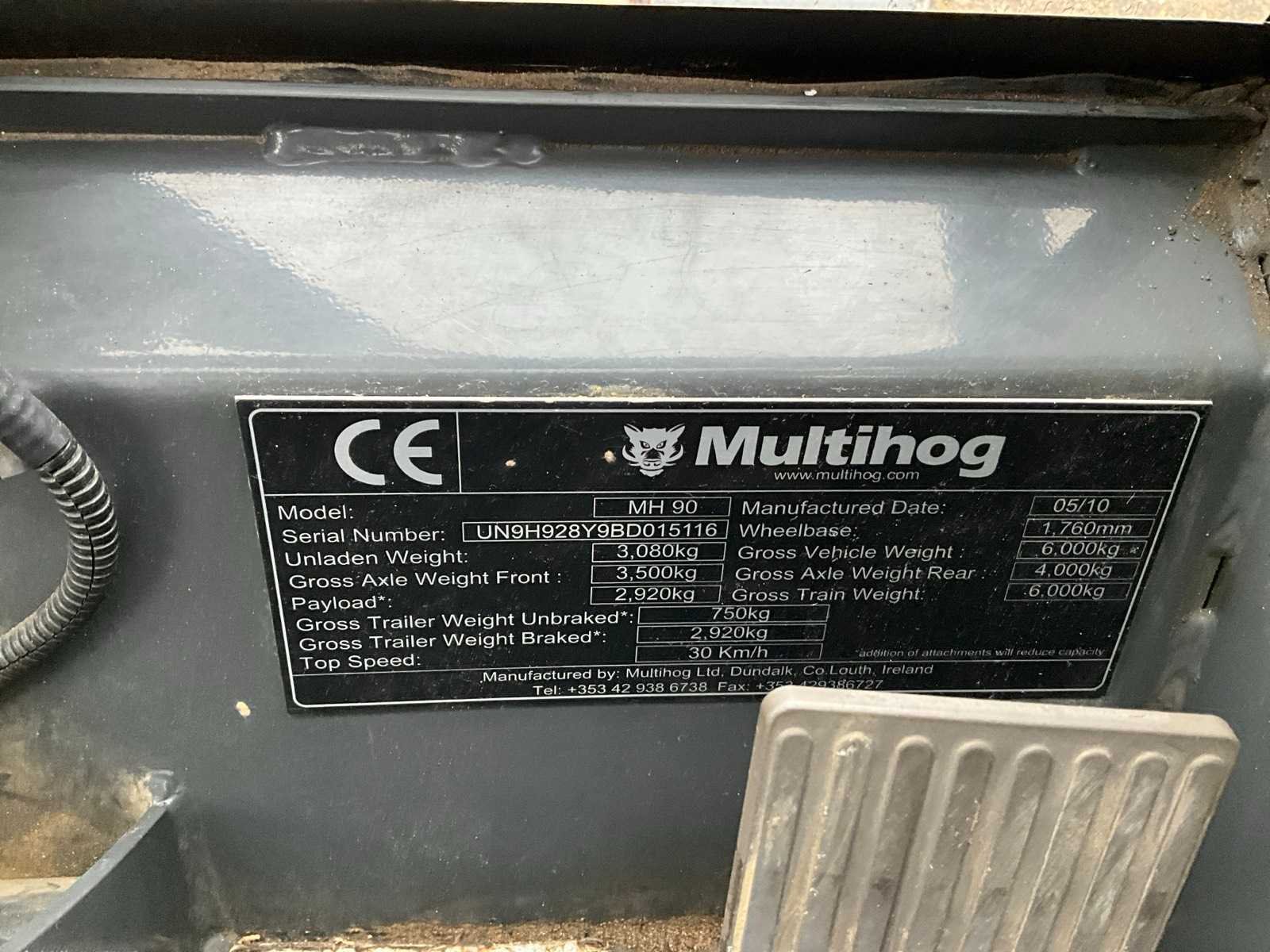 Hydrostatische aandrijving 30KM/H, knikbesturing, fronthef t.b.v. werktuigen, Yanmar 4-cilinder diesel motor, Sper, airconditioning, kachel, joystick bediening Merk: Multihog Type: MH90 Bouwjaar: 2010 Serienummer: UN9H928Y9BD015116 Kenteken: T-03-DPH Afgelezen urenstand: 1024 Versnellingsbaktype: Hydrostatisch Aantal hydraulische ventielen voor: 4 Aantal hydraulische ventielen achter: 4 Bandenmaat voor: 315/55R16 Bandenmaat achter: 315/55R16 Fronthefinrichting: true Cabine: true Luchtgeveerde stoel: true Eigen gewicht: 3080kg Totale afmeting L: 3600mm Totale afmeting Breedte: 1700mm Totale afmeting Hoogte: 2400mm Kentekenpapieren compleet?: true Datum eerste toelating: 2012-02-14 Nationaliteit documenten: Nederland