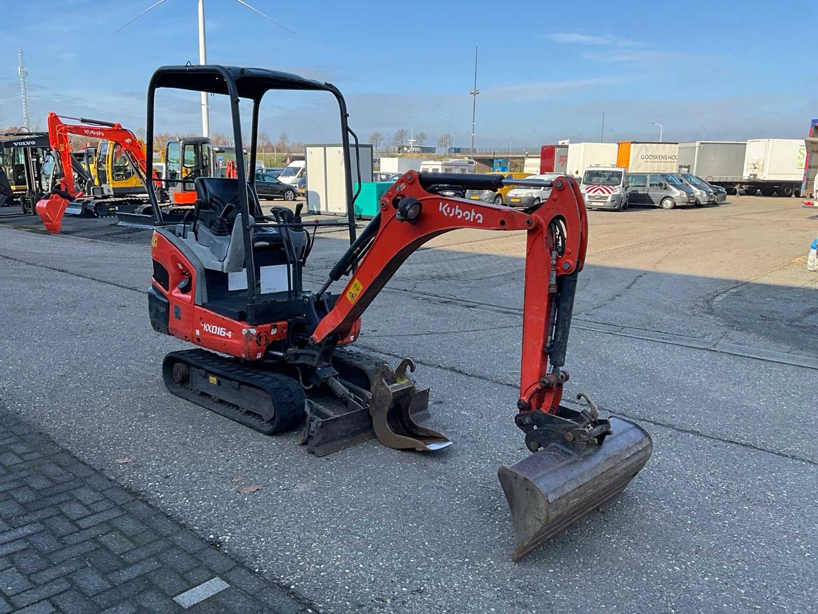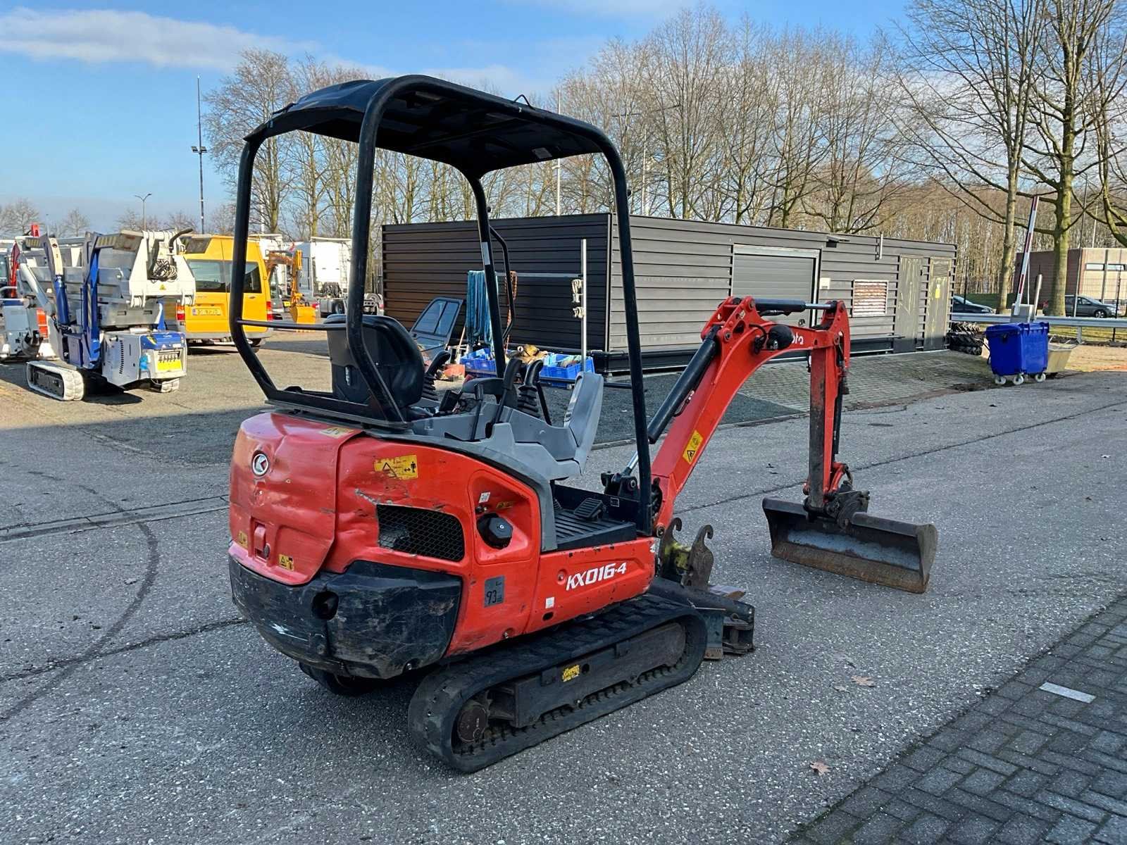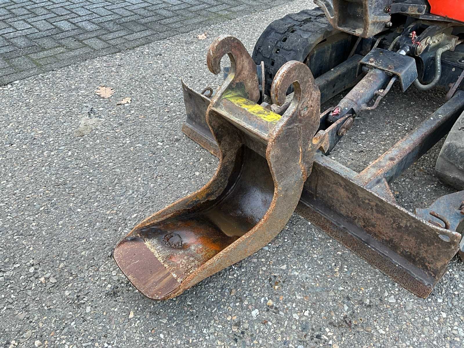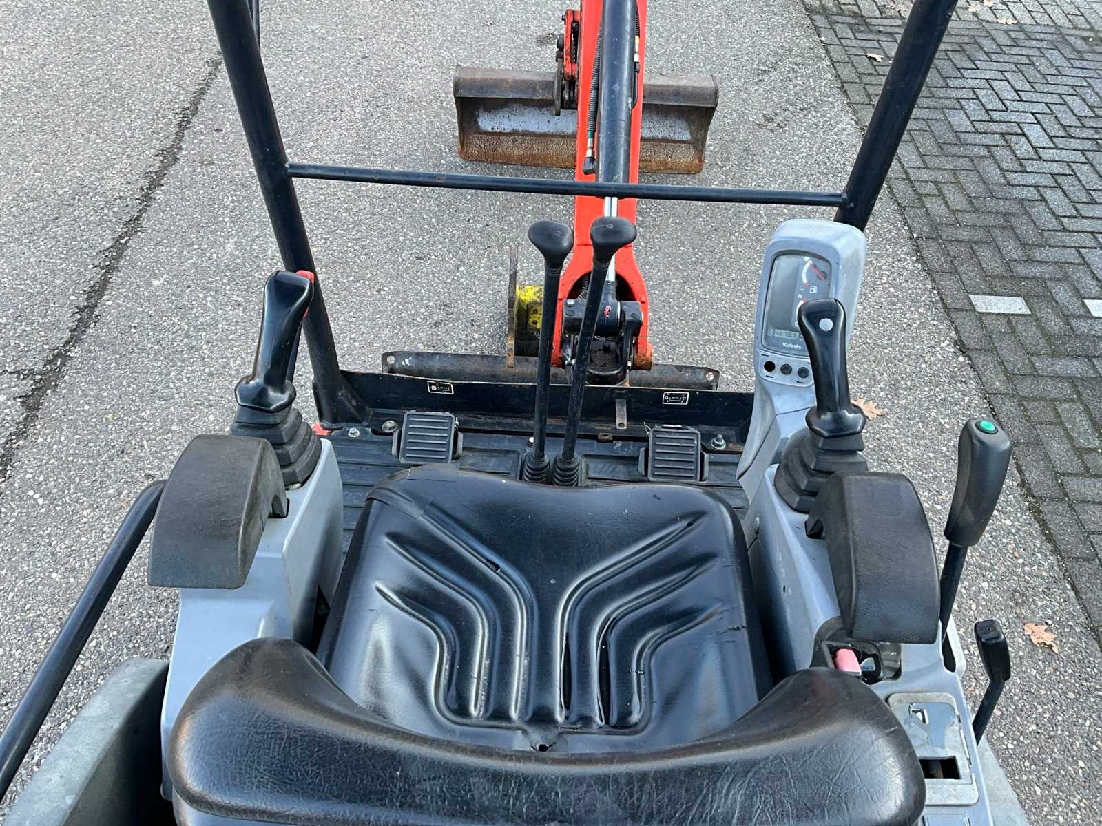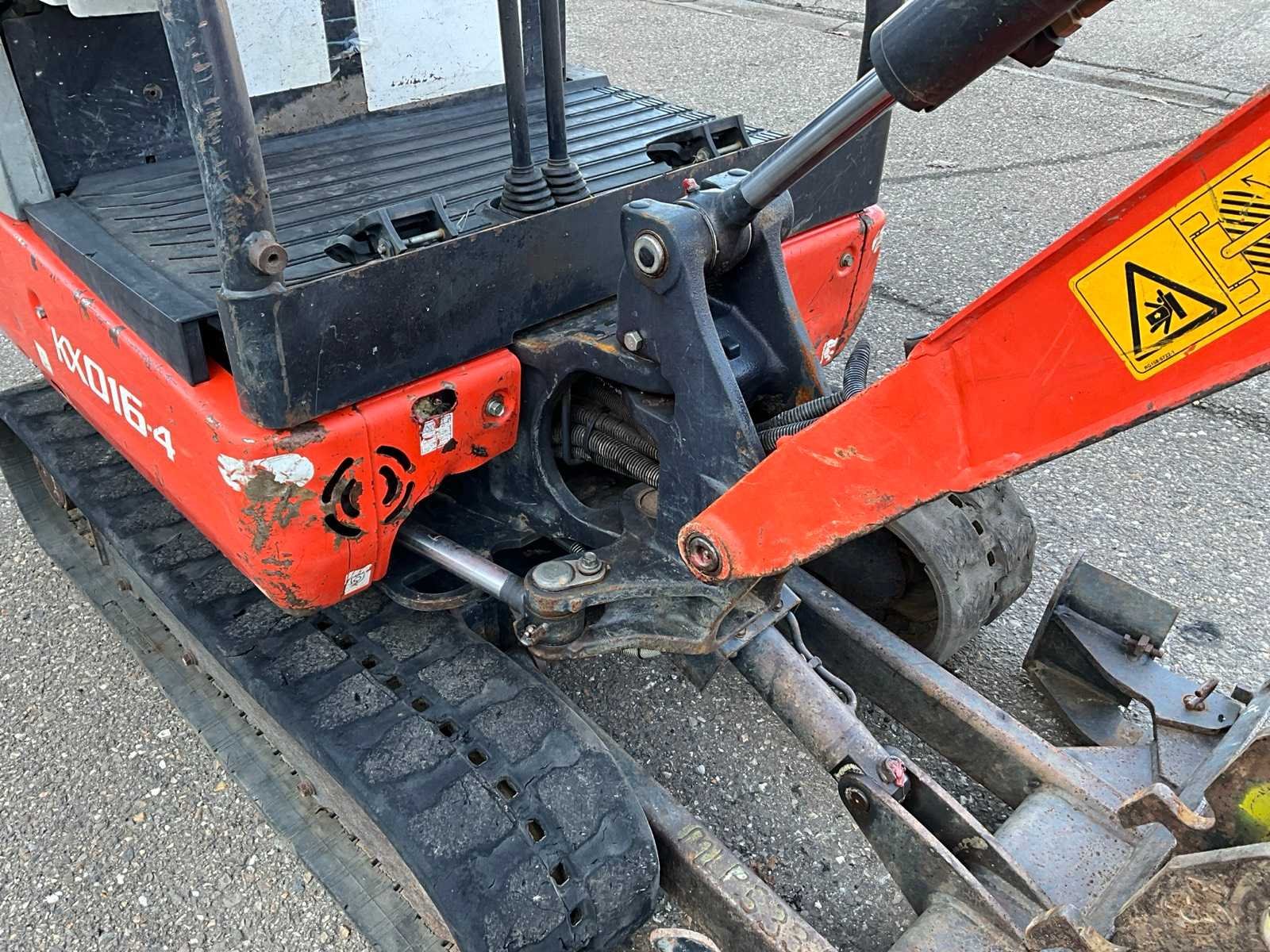 CW05 hydraulische snelwissel, CW05 slotenbak 1000mm, CW05 banaanbak 220mm, schuifblad met verbreders, verstelbaar rijwerk 1050-1230mm, zwenkgiek, extra hydraulische functie, 2e rijsnelheid Merk: Kubota Type: KX016-4 Bouwjaar: 2015 Serienummer: 59000 Merk motor: Kubota D782 Motorvermogen (kW): 10kW Aantal cilinders: 3 Brandstof: Diesel Bedrijfsgewicht: 1565kg Rups breedte: 230mm Afgelezen urenstand: 4278 Totale afmeting L: 3500mm Totale afmeting Breedte: 1050mm Totale afmeting Hoogte: 2300mm