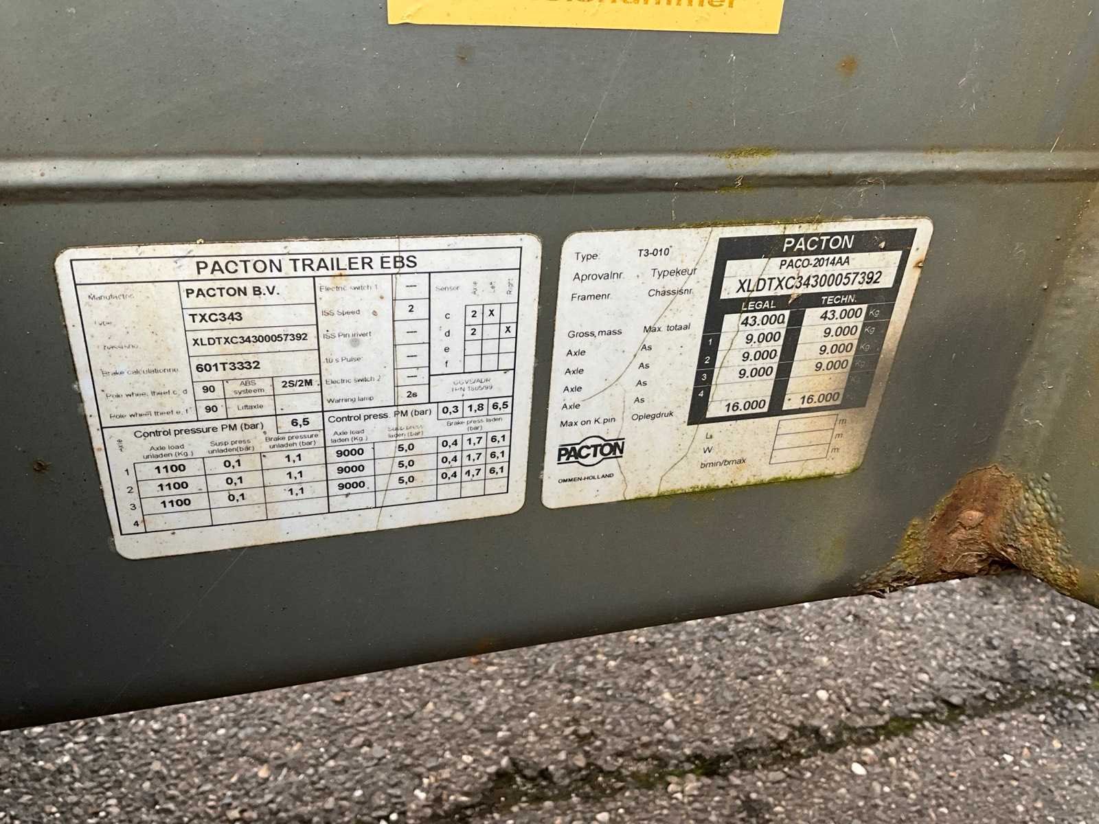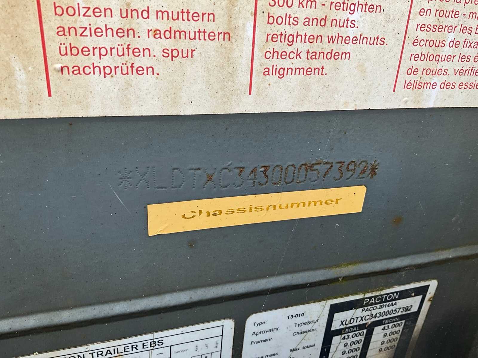 3x 9T SAF as, uitschuifbaar chassis, twistlocks Merk: Pacton Type: TXC343 Bouwjaar: 2008 Chassisnummer VIN: XLDTXC34300057392 Kenteken: OK-68-HS Datum eerste toelating (NL): 2008-04-11 Datum eerste toelating: 2008-04-11 APK vervaldatum: 2026-06-13 Aantal assen: 3 Laadvermogen: 37600kg Zelf rijdend exporteren: Mogelijk