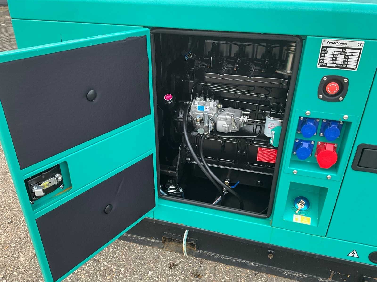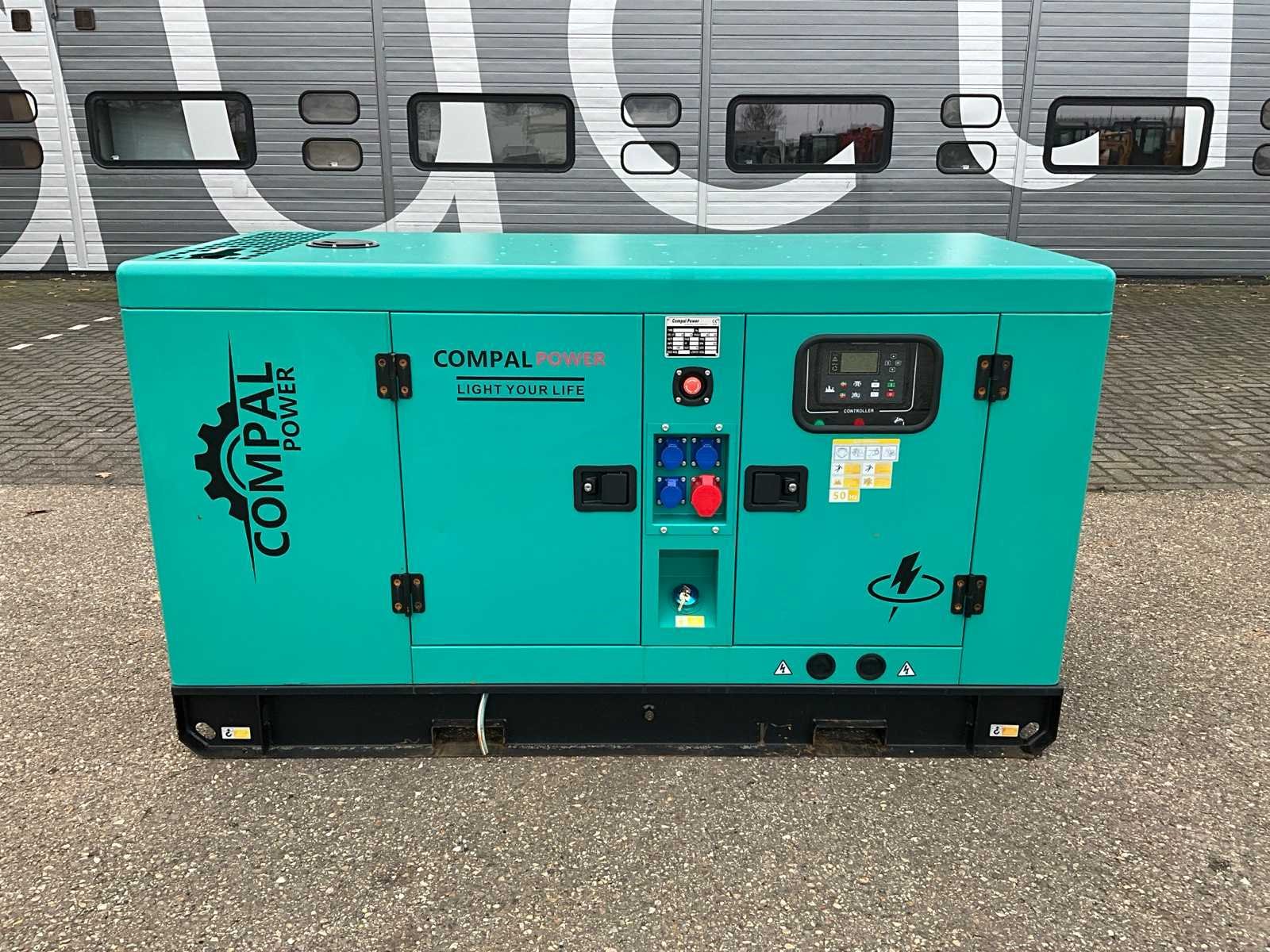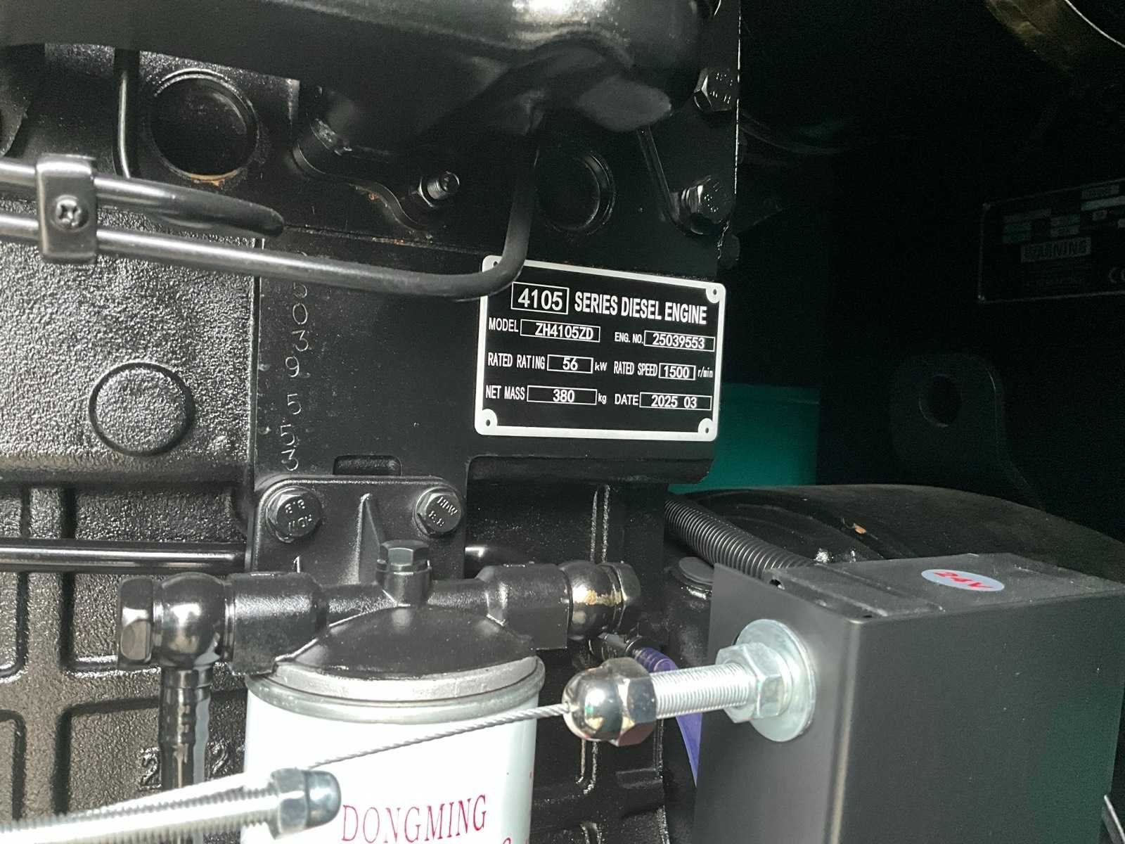 Ongebruikt, 3x 220V 16A aansluiting, 1x 380V 32A aansluiting, 4-cilinder turbo diesel motor, geluiddempende ombouw Merk: Compal Power Type: VG-R50 Bouwjaar: 2025 Serienummer: LB2503144-63 Capaciteit.: 62kVA Motor merk: ZH4105ZD Motorcapaciteit: 50kW Generator capaciteit: 90A Totale afmeting L: 2200mm Totale afmeting Breedte: 950mm Totale afmeting Hoogte: 1250mm