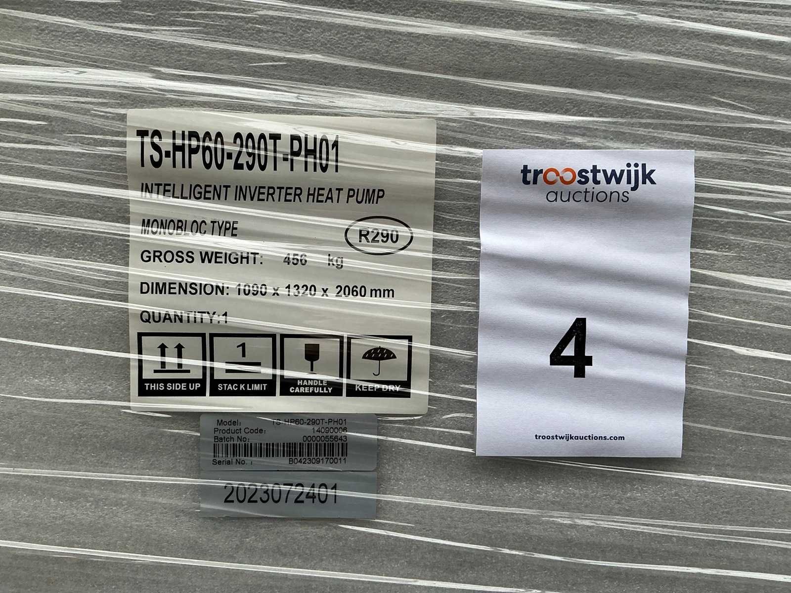 Koelmiddel R290, heating capacity 50kw, 380-415v. Serienummer: B042309170011. Dit betreft een nieuw verpakte unit. Merk: Thuisstroom/Wattson Power Model: TS-HP60-290T-PH01 Lengte: 109cm Breedte: 132cm Hoogte: 2060cm