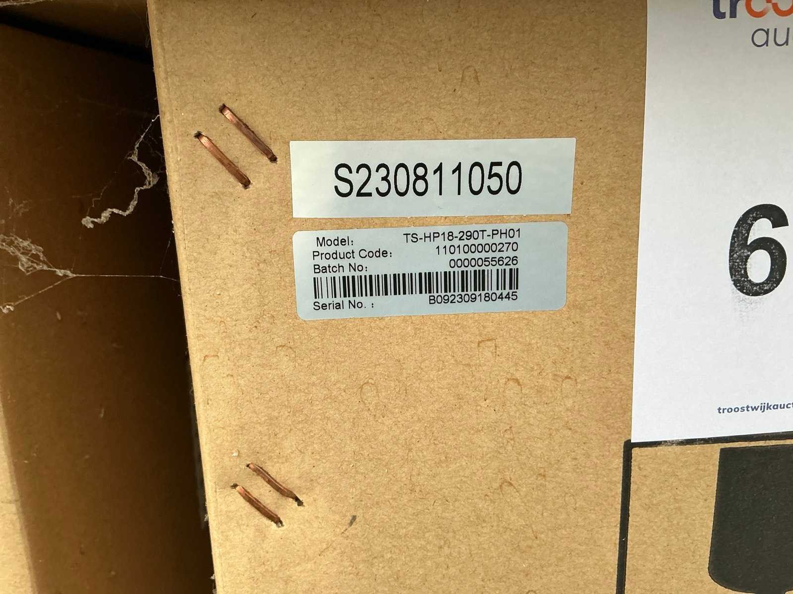 Serienummer: B092309180445. Dit betreft een verpakte unit. R290 refrigerant gas Energy Class: A++++ Heating + Cooling + Hot Water Full DC inverter compressor and fan motor Max outlet temperature: 70 O Wifi smart control Inverter water pump inside Modbus RS485 Full DC Inverter Technology Merk: Thuisstroom Model: TS-HP18-T290-PH01 Kleur: Zwart Lengte: 137cm Breedte: 56cm Hoogte: 136cm Materiaal: Metaal