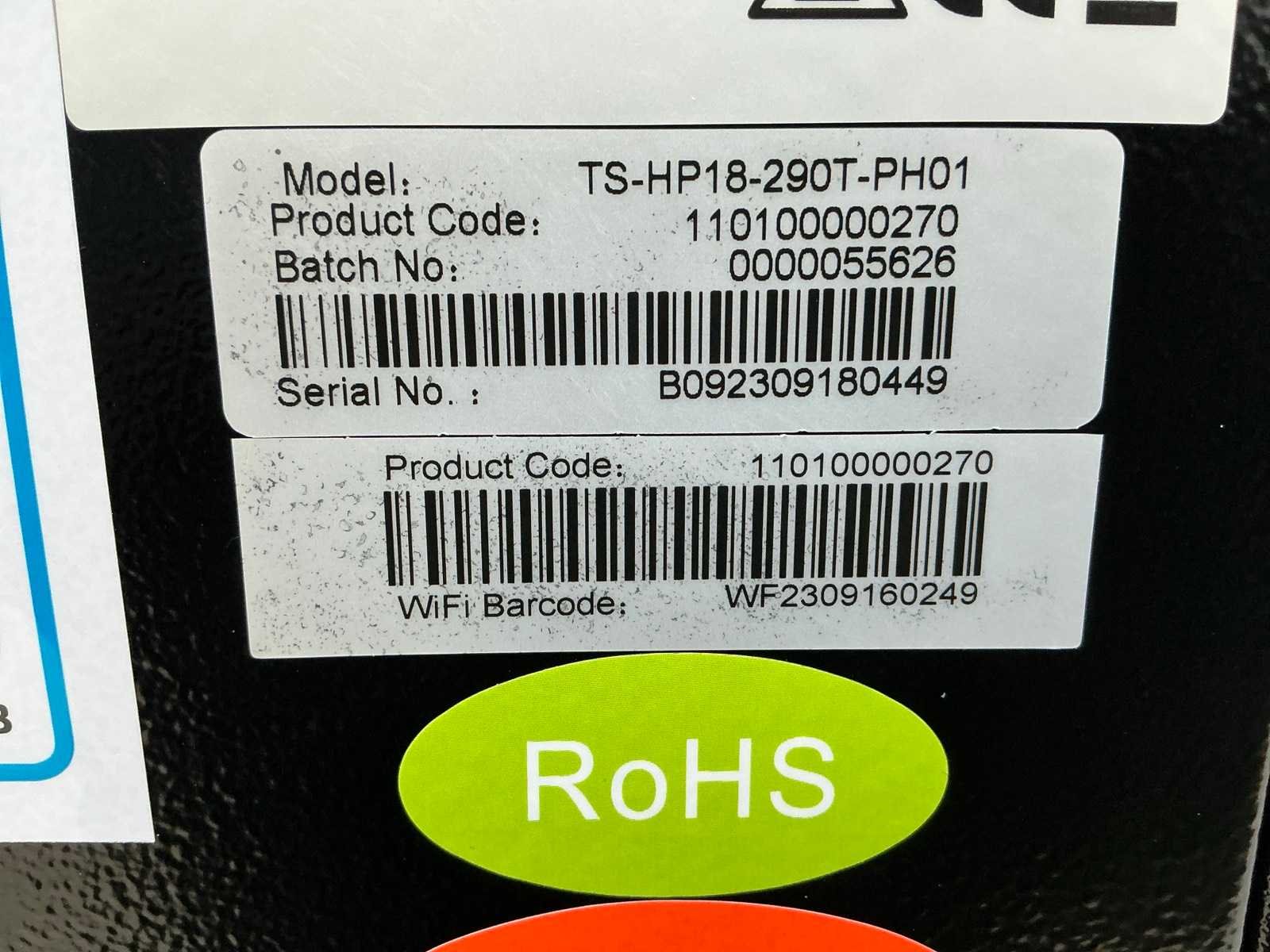 Serienummer: B092309180449. Dit betreft een uitgepakte show unit. R290 refrigerant gas Energy Class: A++++ Heating + Cooling + Hot Water Full DC inverter compressor and fan motor Max outlet temperature: 70 O Wifi smart control Inverter water pump inside Modbus RS485 Full DC Inverter Technology Merk: Thuisstroom Model: TS-HP18-T290-PH01 Kleur: Zwart Lengte: 137cm Breedte: 56cm Hoogte: 136cm Materiaal: Metaal