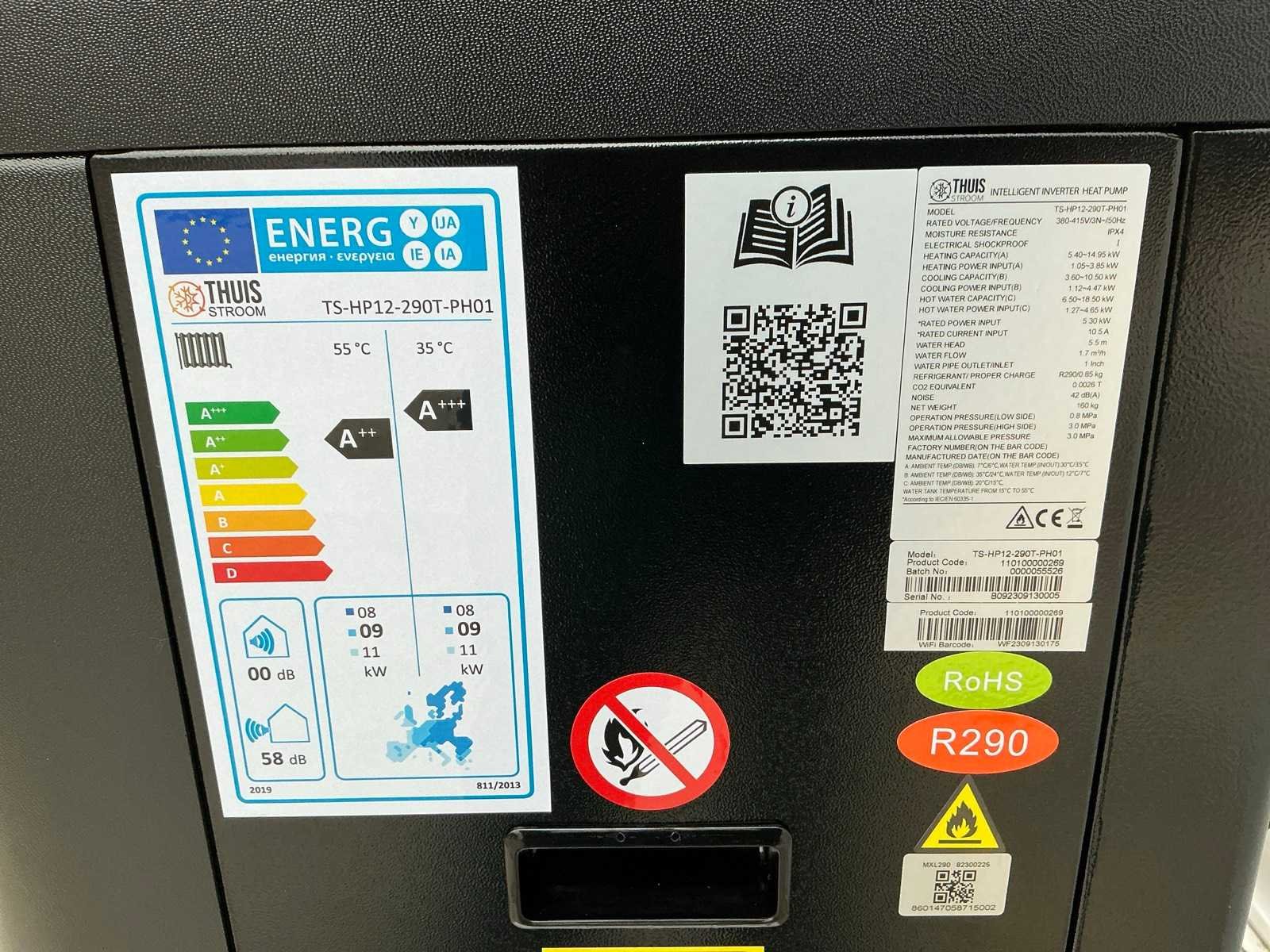 Serienummer: B092309130005. Dit betreft een uitpakte show unit. R290 refrigerant gas Energy Class: A++++ Heating + Cooling + Hot Water Full DC inverter compressor and fan motor Max outlet temperature: 70 O Wifi smart control Inverter water pump inside Modbus RS485 Full DC Inverter Technology Merk: Thuisstroom Model: TS-HP12-290T-PH01 Kleur: Zwart Gewicht: 175kg Lengte: 141cm Breedte: 52cm Hoogte: 96cm Materiaal: Metaal