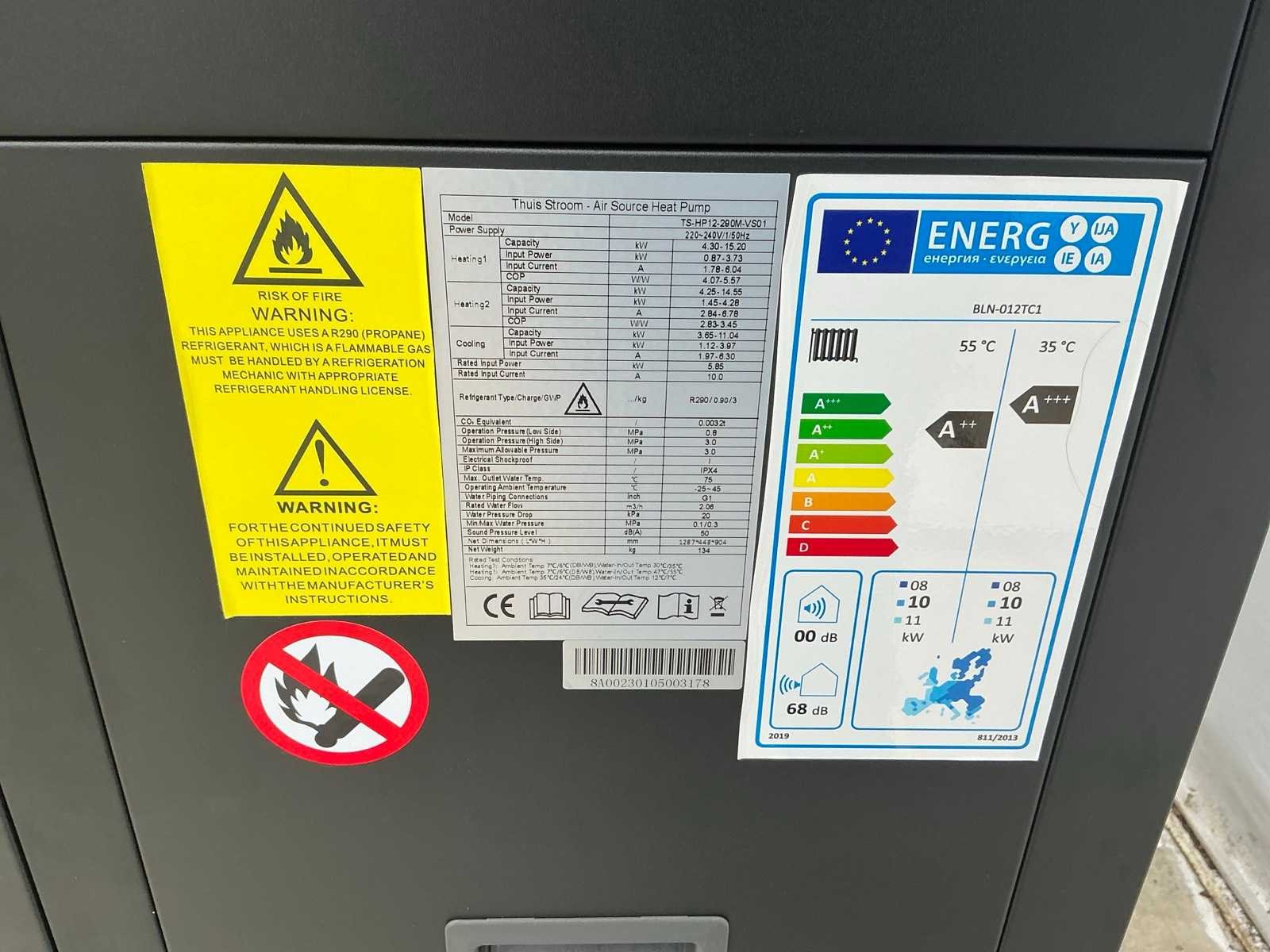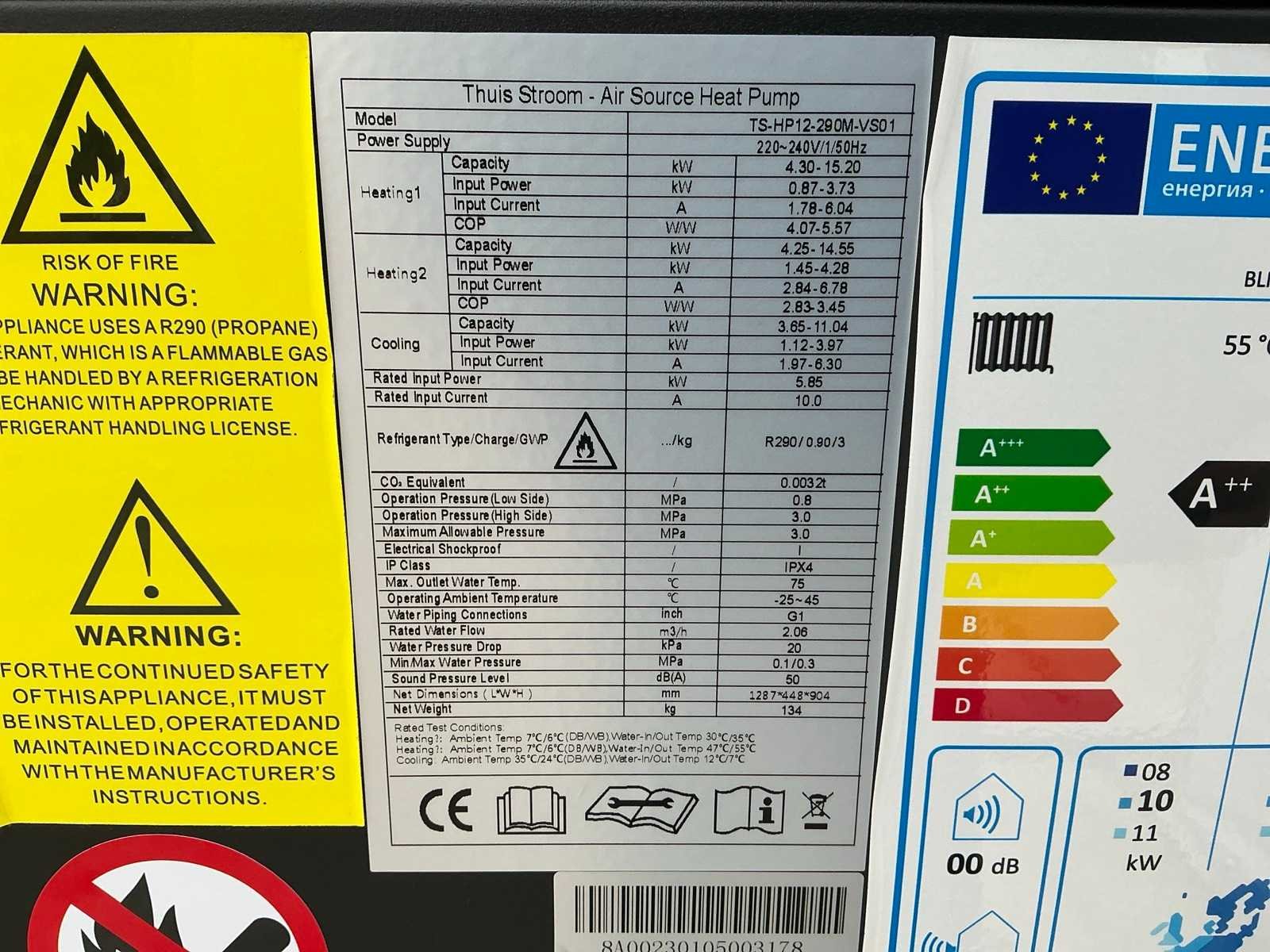 Serienummer: 8A00230105003214. Dit betreft een verpakte unit. R290 refrigerant gas Energy Class: A++++ Heating + Cooling + Hot Water Full DC inverter compressor and fan motor Max outlet temperature: 70 O Wifi smart control Inverter water pump inside Modbus RS485 Full DC Inverter Technology Merk: Thuisstroom Model: TS-HP12-T290M-VS01 Kleur: Zwart Gewicht: 140kg Lengte: 132cm Breedte: 49cm Hoogte: 91cm Materiaal: Metaal