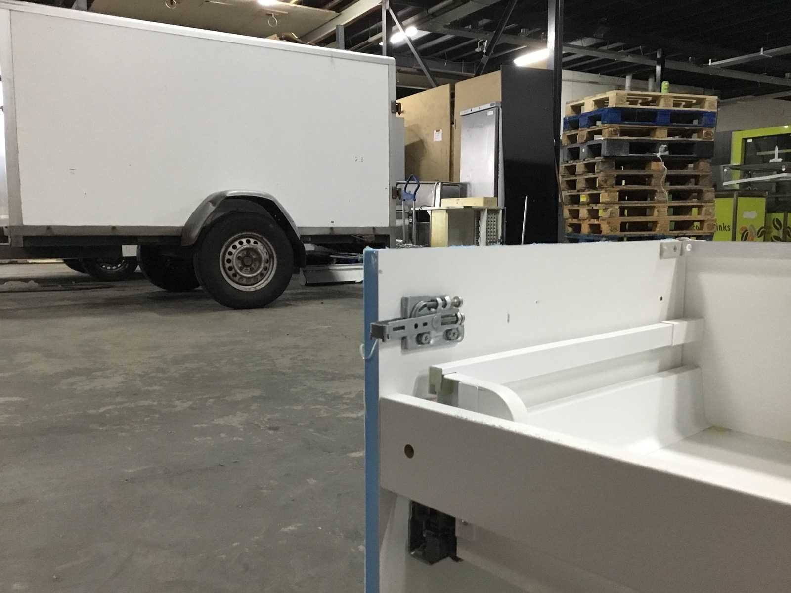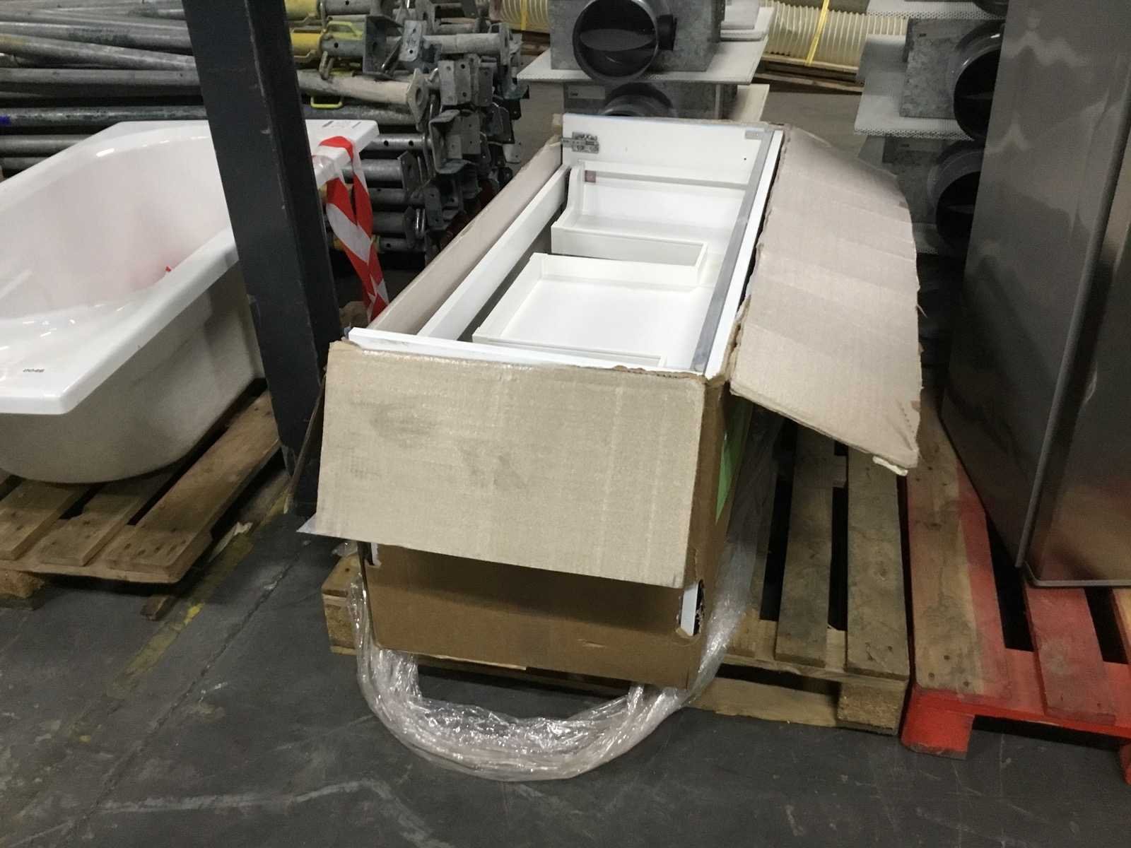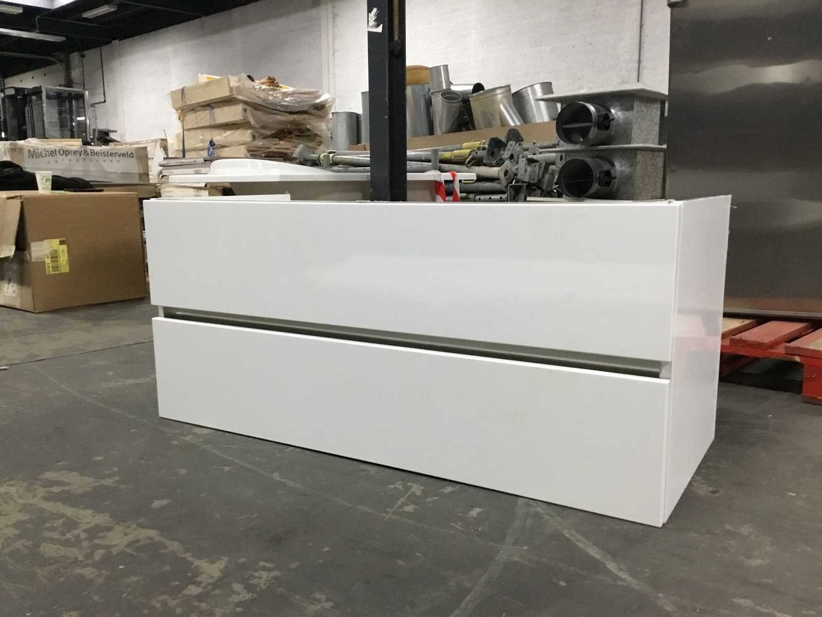 Onderstel voor wasmeubel tbv dubbele waskom. Kleine beschadiging is bovenlade. Model: Wastafelmeubel Hoogte: 53cm Lengte: 120cm Breedte: 51cm Kleur: Wit Softclose: true