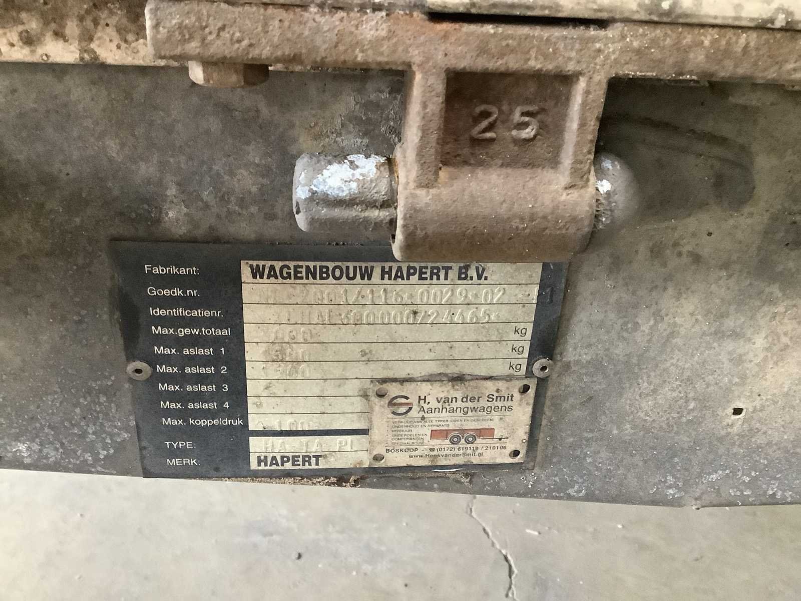 Merk: Hapert Type: HA-TA-PI Chassisnummer: XLHAL3000000/24465 Aantal assen: 2 Laadbak afmeting l: 403cm Laadbak afmeting b: 185cm Laadvermogen: 3000kg Kentekenpapieren compleet?: true Hoogte: 160cm Lengte: 503cm Breedte: 185cm