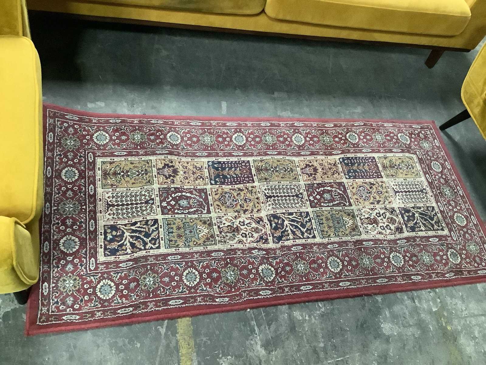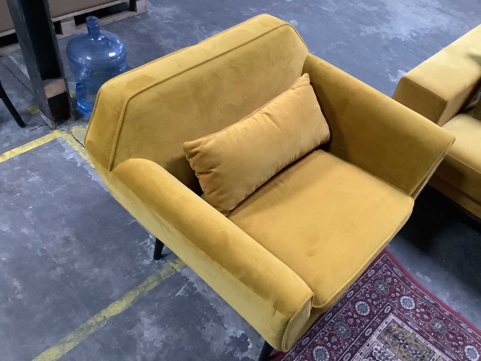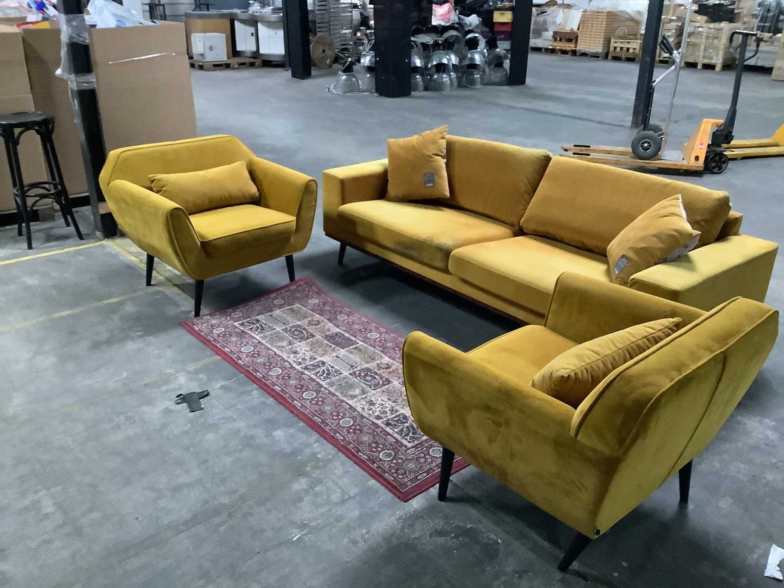 Bank: 240 x 85 x 68 cm Stoelen: 80 x 90 x 76 cm Kleed: 180 x 80 cm Kleur: Okergeel