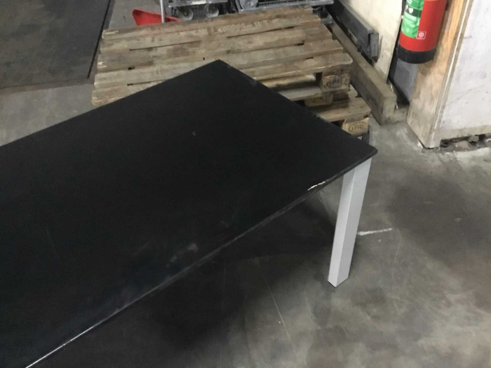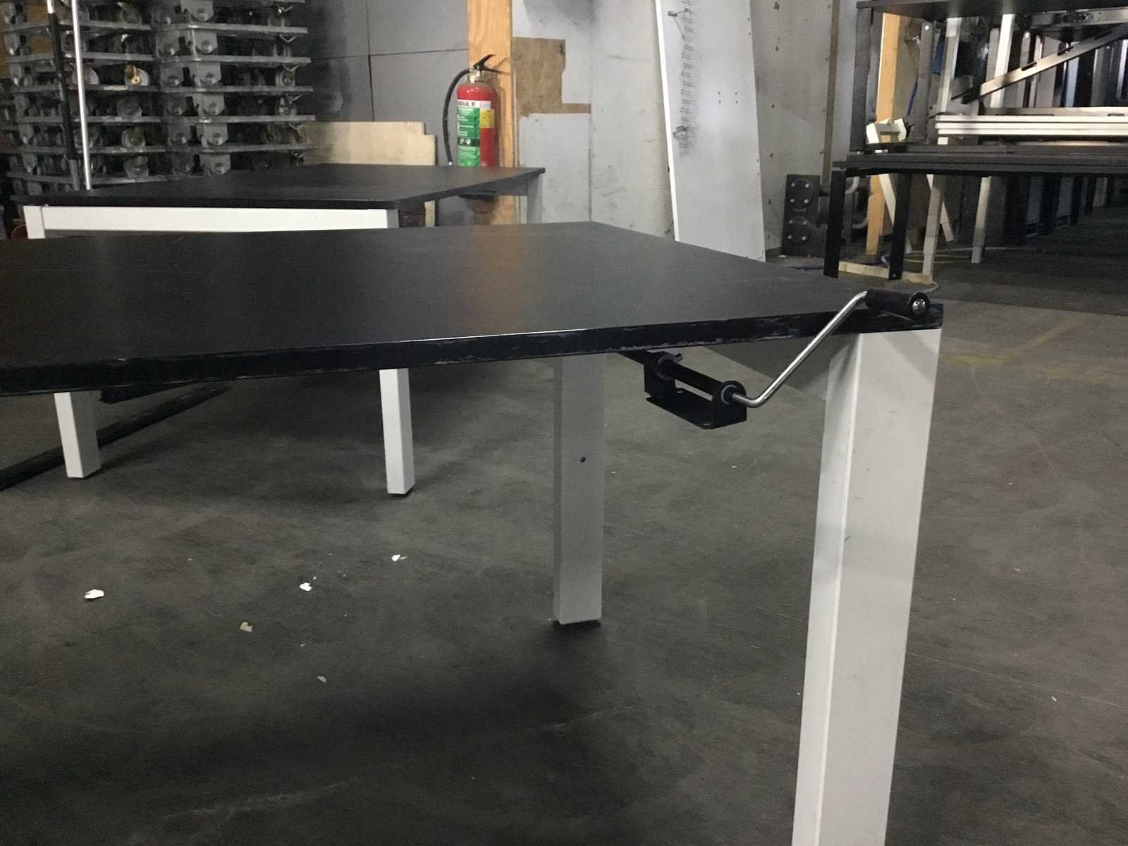 In hoogte verstelbaar door middel van draaiarm. Blad lichtte los en lichte beschadiging zie foto. Type: Bureau Kleur: Zwartblad Lengte: 160cm Breedte: 80cm Hoogte: 80cm