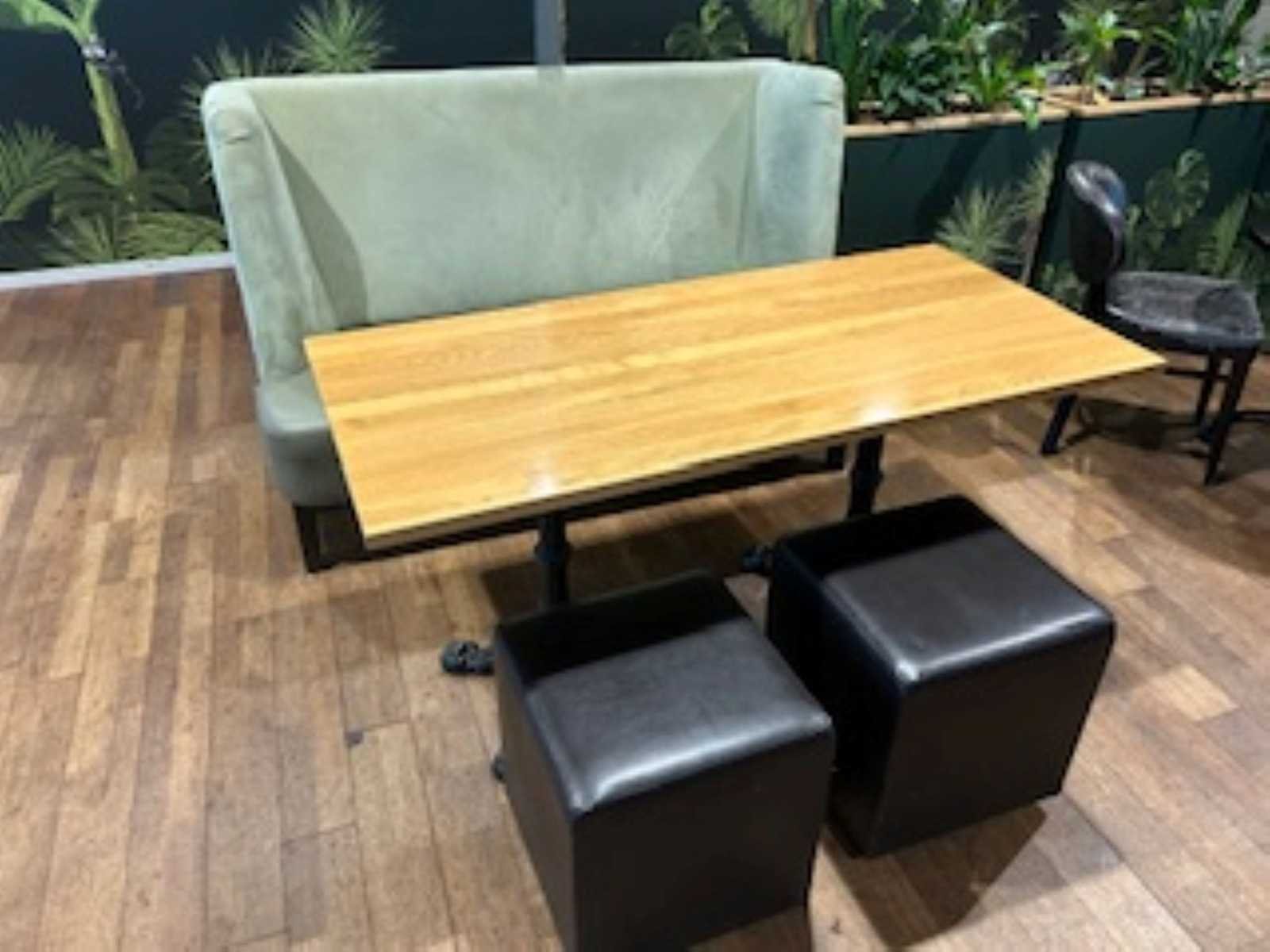 Onderpootjes poef incompleet zie foto 1e: bank: 74x175x105 cm 2e: tafel: 150x70x74 cm 3e: 2x Poef 42x42x41 cm