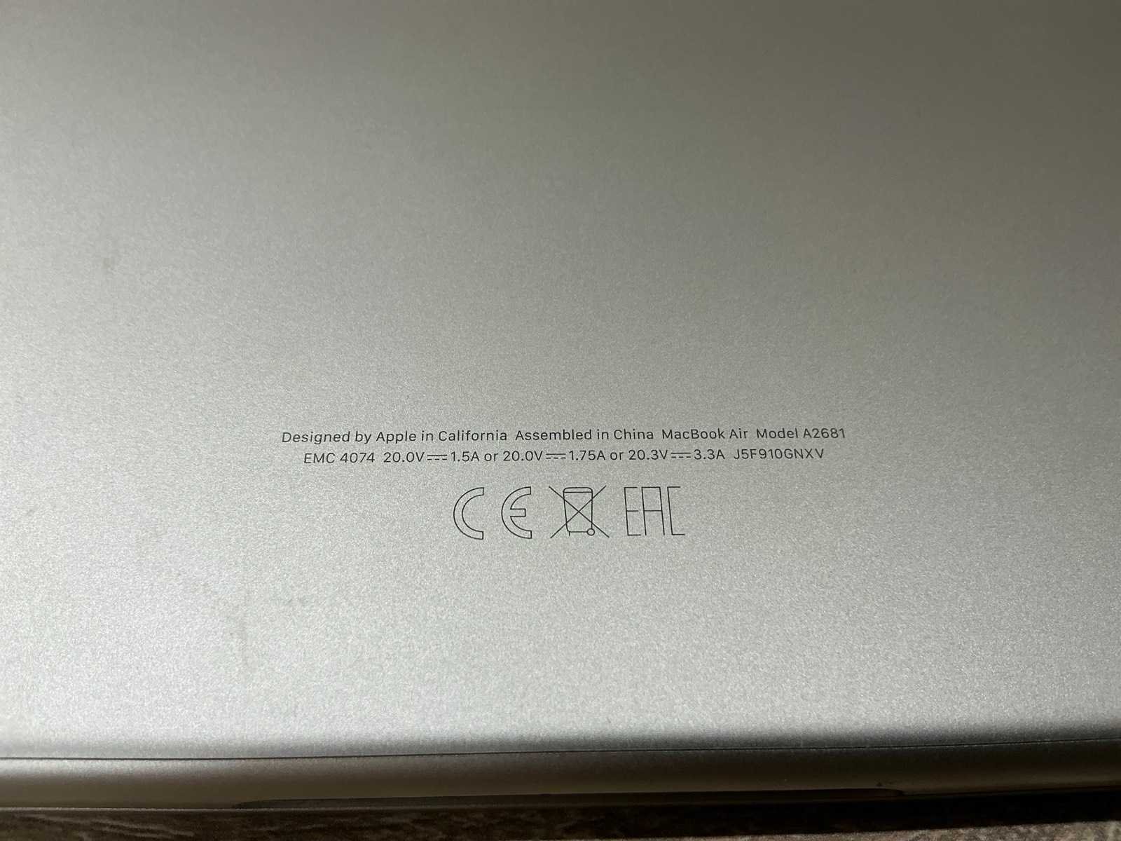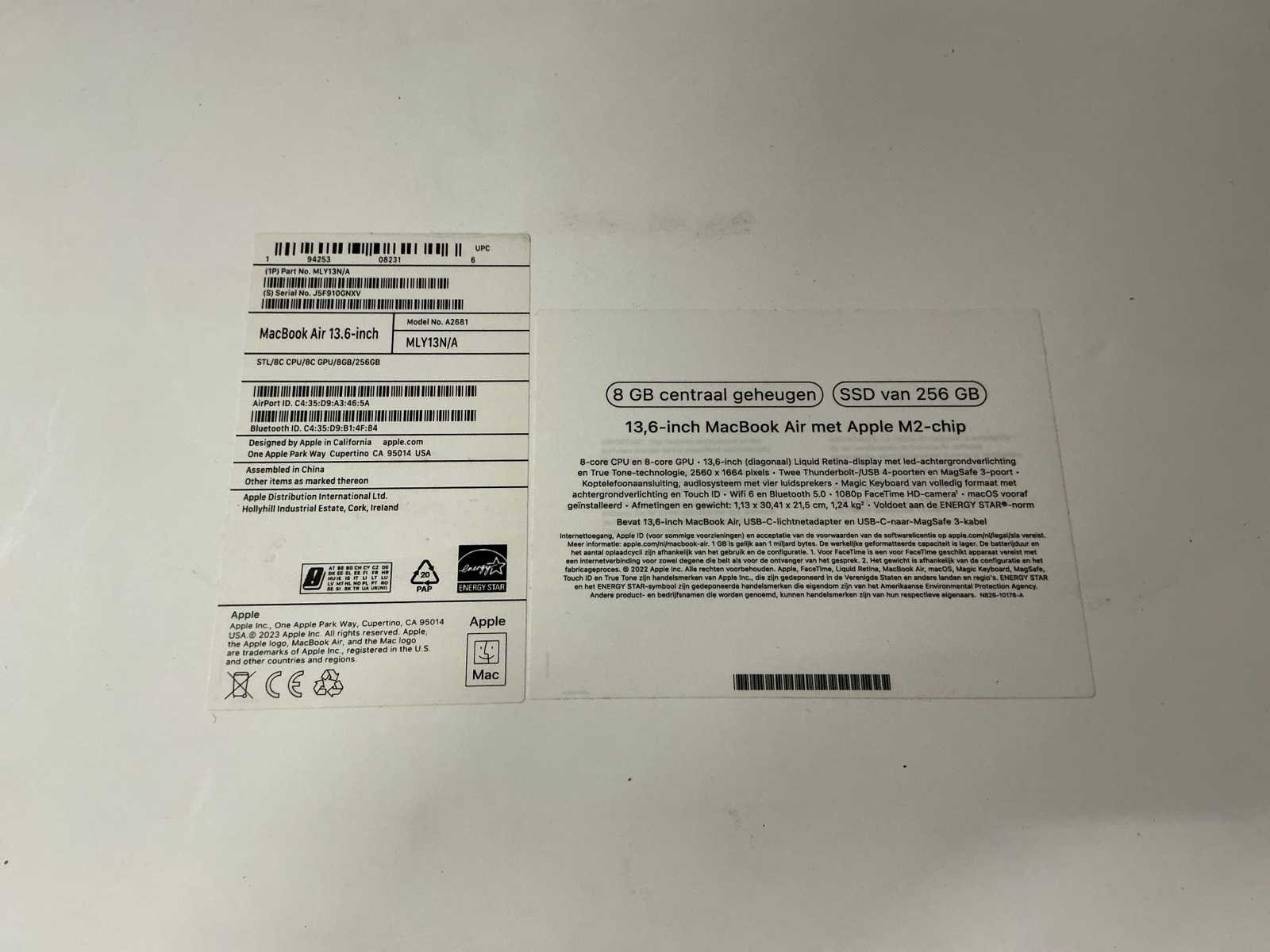 Inclusief doos Merk: Apple Type: Macbook Air (M2, 2023) Serienummer: J5F910GNXV Processor type: Apple M2 RAM Geheugen: 8GB Aantal datadragers: 1 Met adapter: true Wifi: true Bluetooth: true Webcam: true