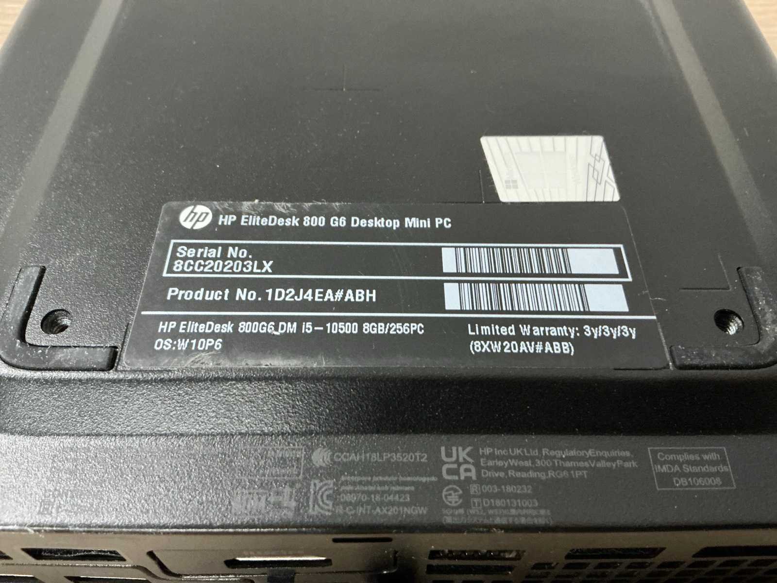 Merk: HP Type: HP EliteDesk 800 G6 Desktop Mini PC Processor type: Intel(R) Core(TM) i5-10500 CPU @ 3.10GHz,x86_64 @ 4.5GHz, logical CPUs: 12, Speed: 4500MHz Type datadrager: SSD/NVME 256.1GB Serienummer: 8CC20203LX RAM Geheugen Type: 8GB