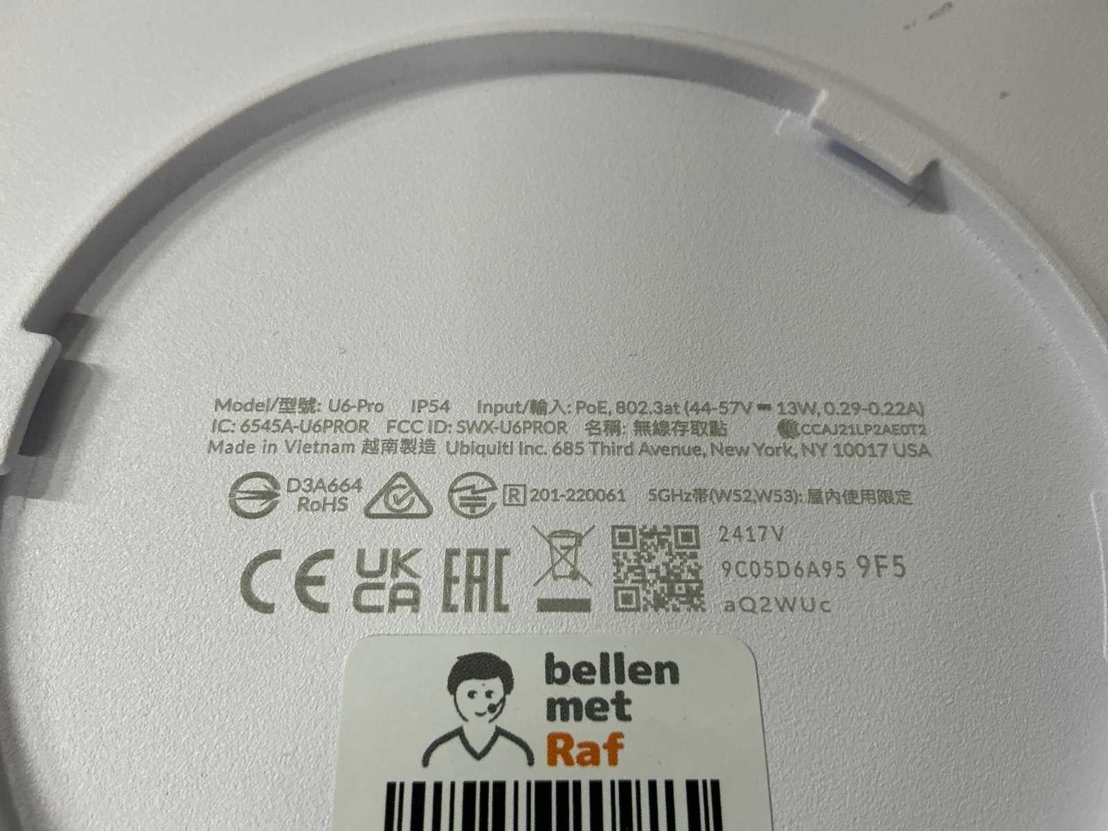Met poe injector Merk: Ubiquiti Model: U6 pro