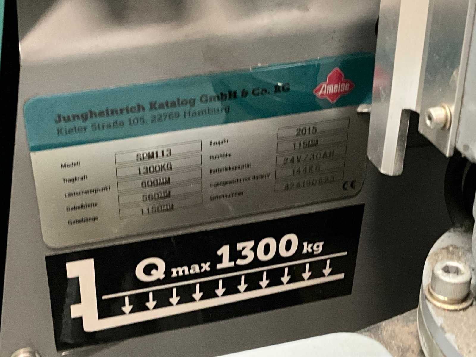 Merk: Jungheinrich Type: SPM113 Bouwjaar: 2015 Serienummer: 424190023 Hefvermogen: 1300kg Lepellengte: 1150mm Accu lader: true Eigen gewicht: 144kg Totale afmeting L: 1300mm Totale afmeting Breedte: 500mm Totale afmeting Hoogte: 1400mm