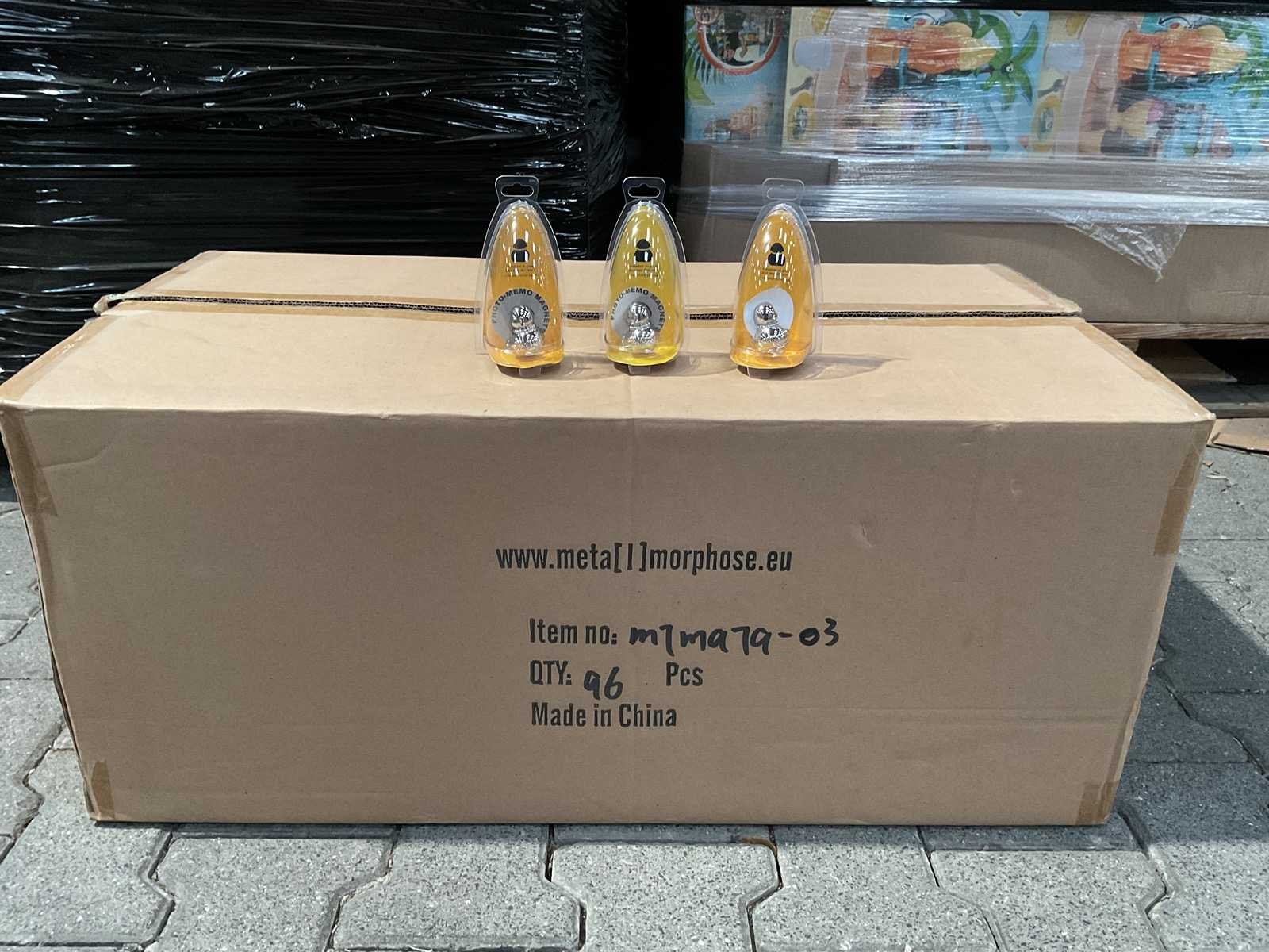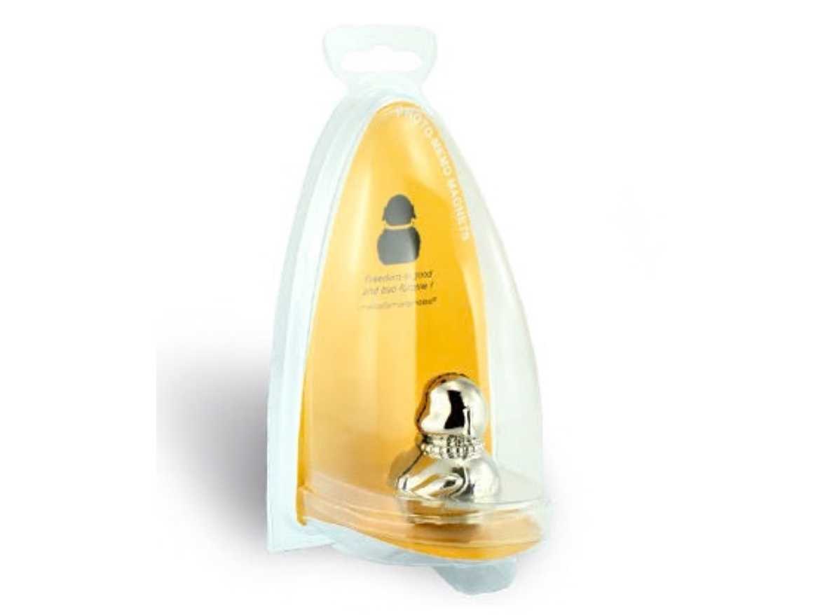 Holds a photo or memo on a desk or separates in two to attach to a fridge. Dimensions: 2.5 x 3 x 3.5cm Material: Zinc alloy and stainless steel transparent box packaging Registered trademark and model