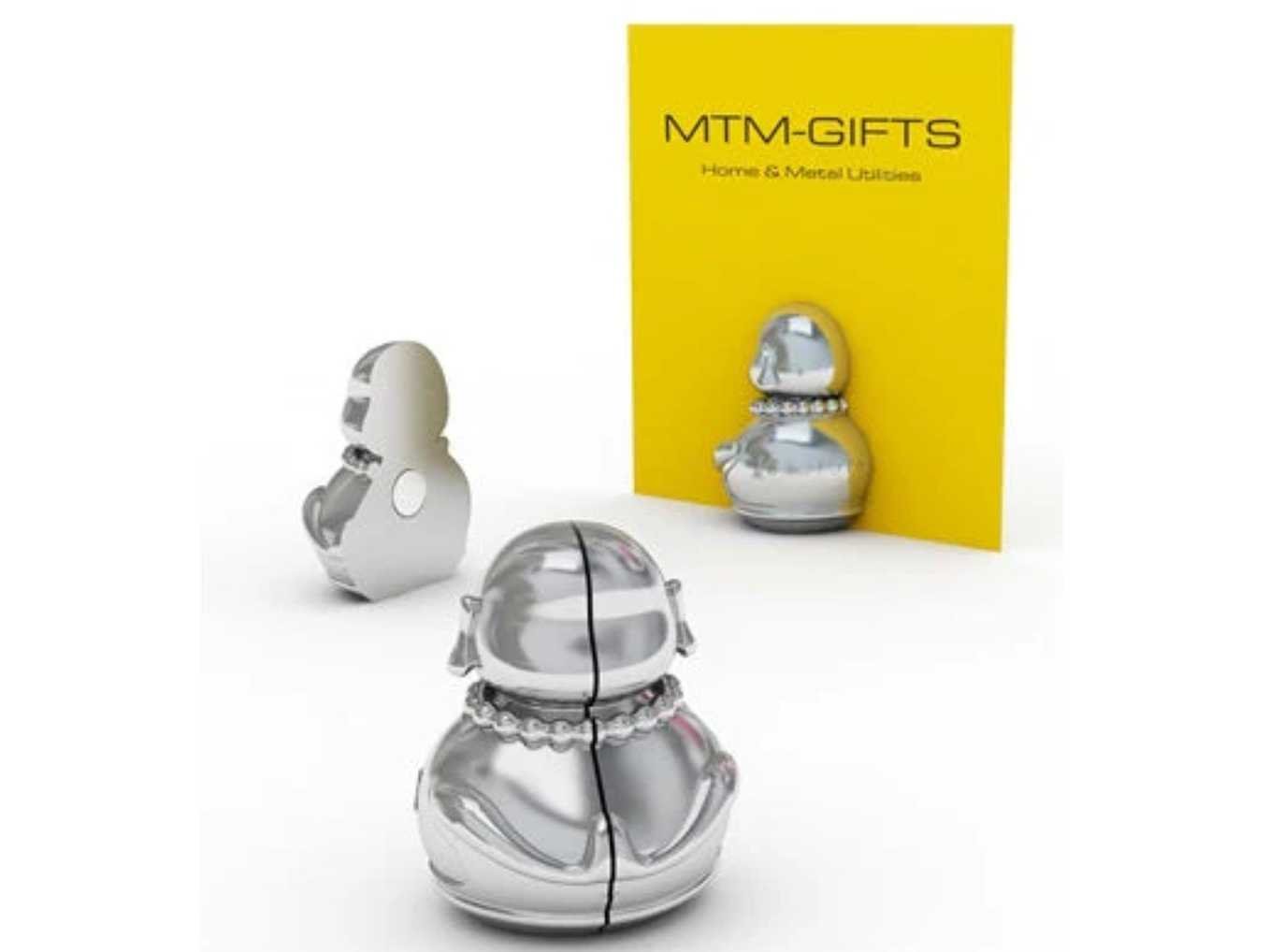 Holds a photo or memo on a desk or separates in two to attach to a fridge. Dimensions: 2.5 x 3 x 3.5cm Material: Zinc alloy and stainless steel transparent box packaging Registered trademark and model