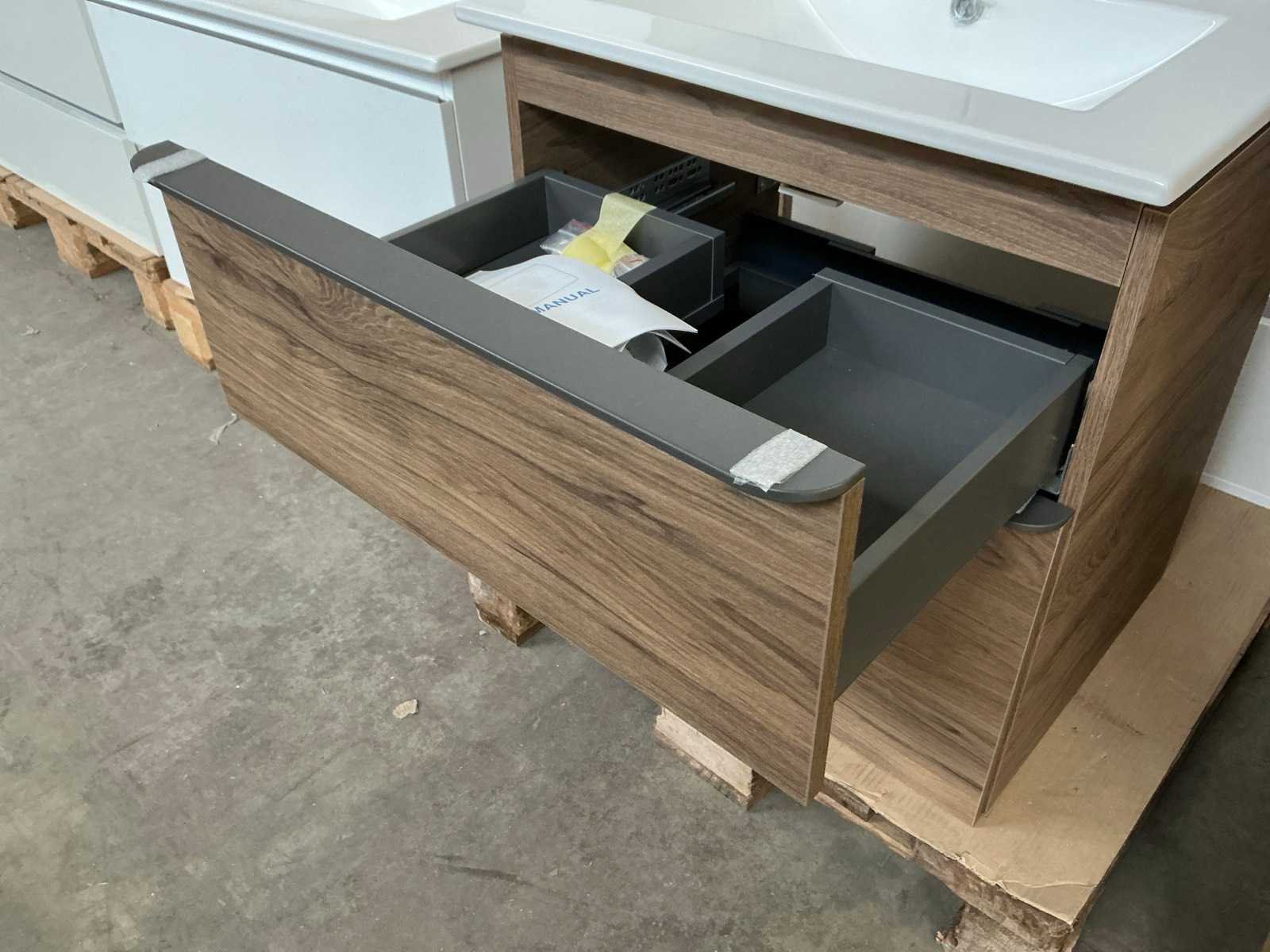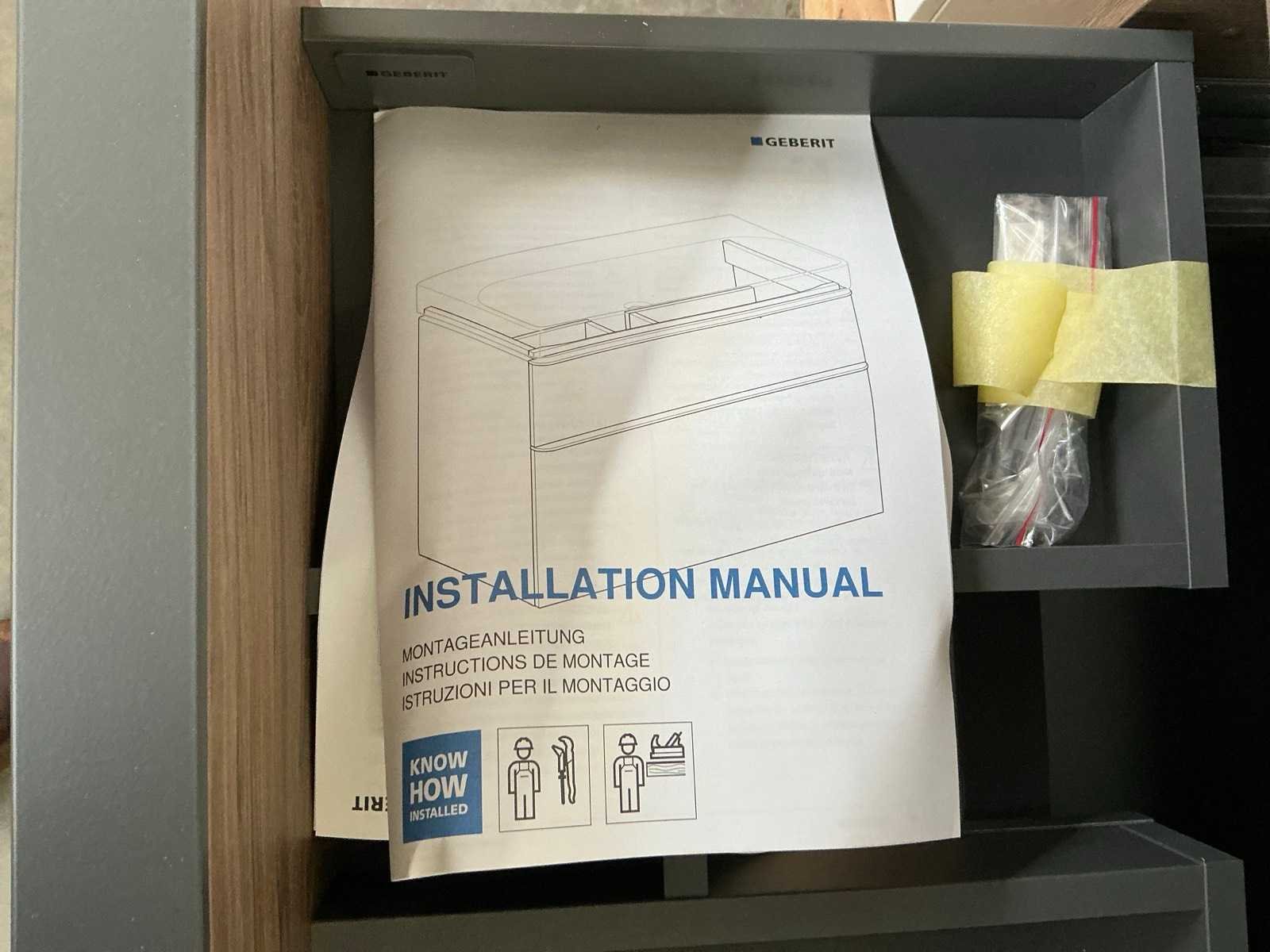 Merk: Geberit Hoogte: 64cm Lengte: 61cm Breedte: 47cm Materiaal: Hout/keramiek Kleur: Bruin Wastafel: Ja, met kraangat en waste Lades: 2 Softclose: true